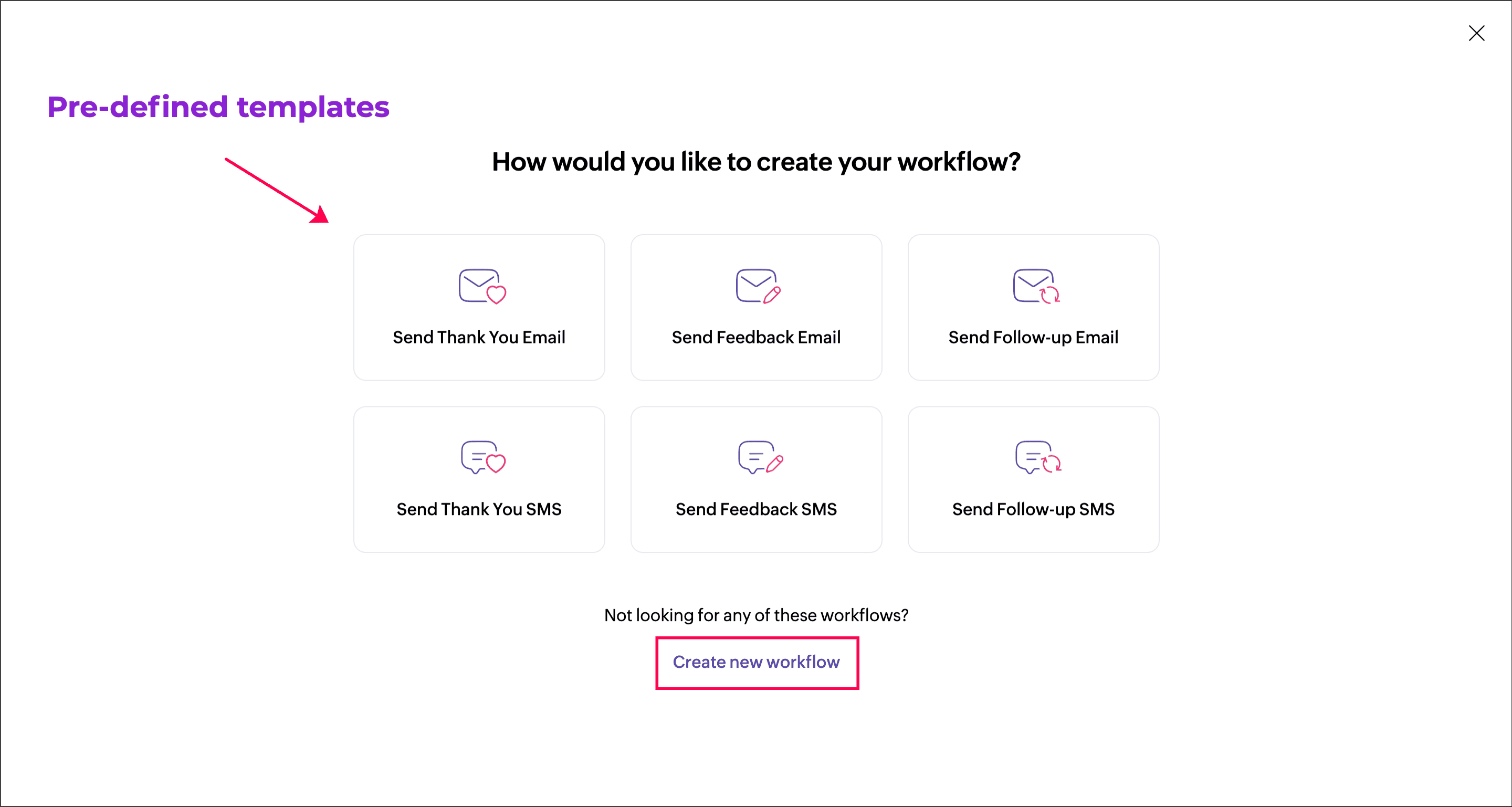 - To create a workflow using a pre-defined template, click any one of the cards shown. To create your own workflow, click Create new workflow at the bottom of the screen.
