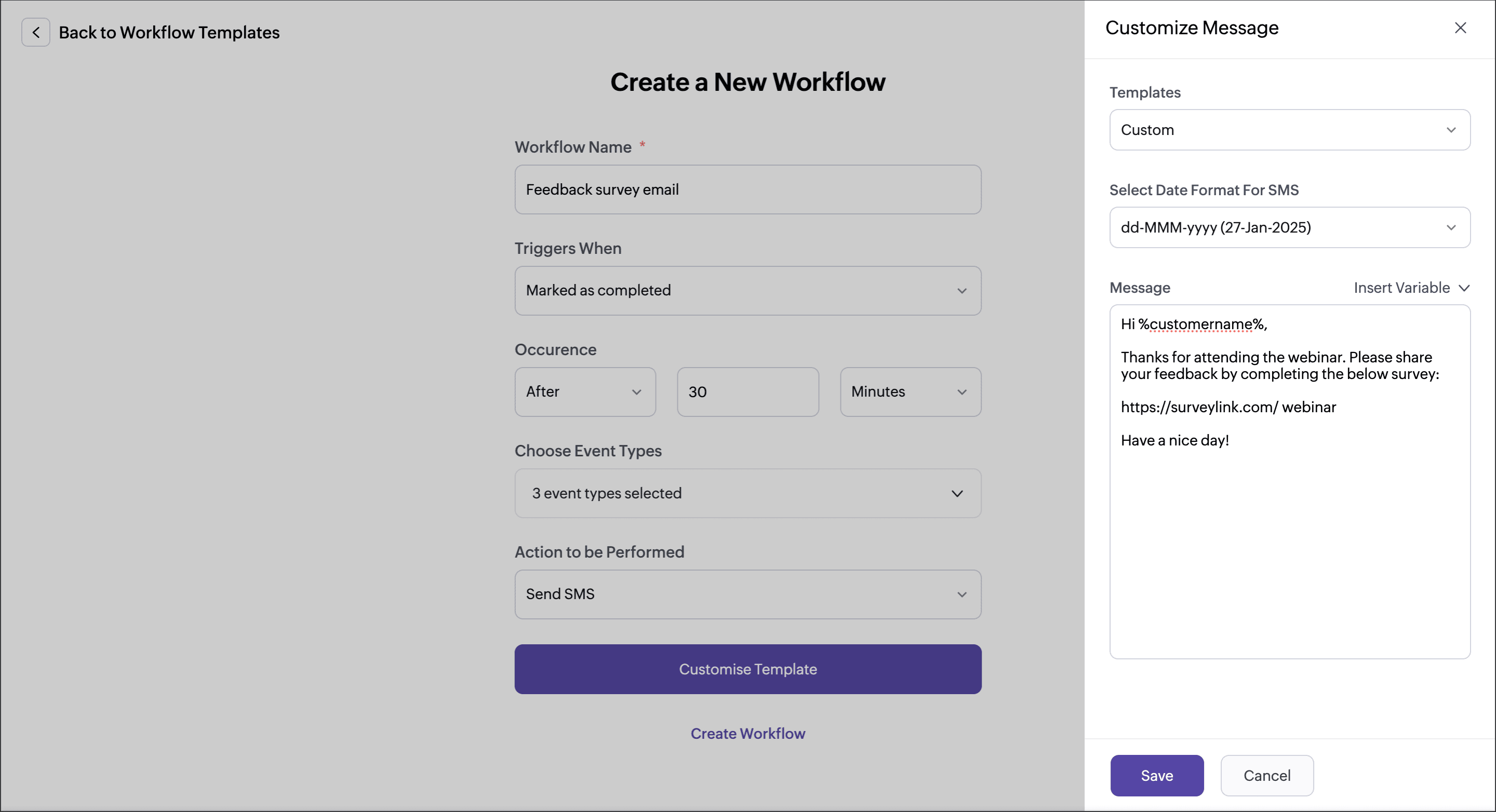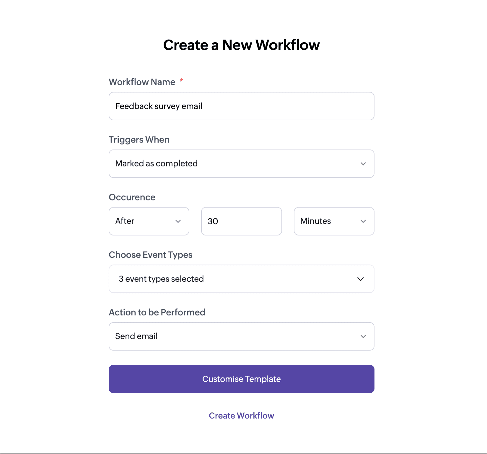 Imagine that you've conducted a webinar and want to send a feedback form to all the participants afterwards. This can be achieved by having a workflow that gets triggered a few minutes after marking the webinar as complete. Similarly, these workflows can be configured to address various other notifications.