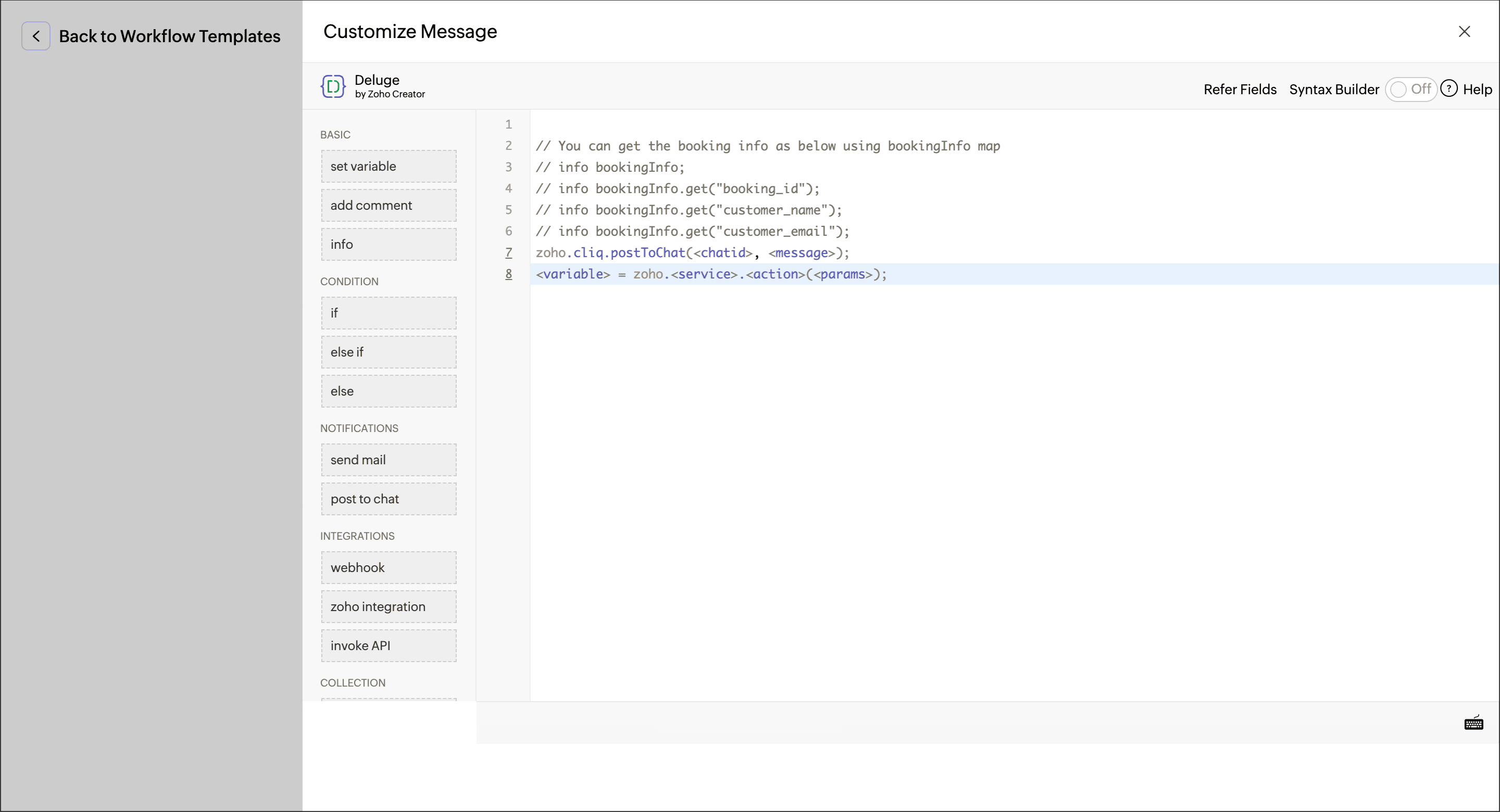 Custom functions are scripts written in Deluge, Zoho's scripting language. It allows you to extend the capabilities of the Bookings application by performing complex logic or integrating with other applications.