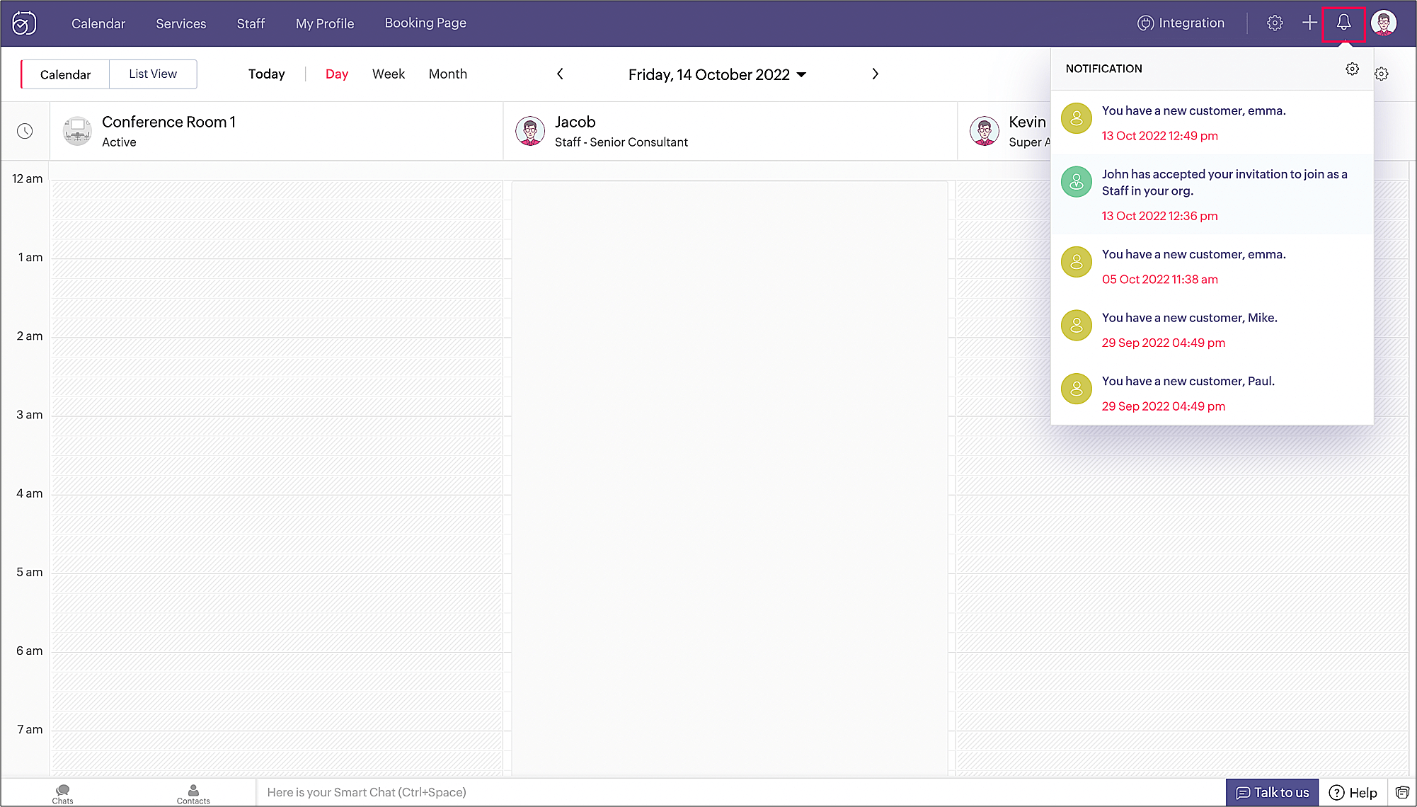 The notifications can be viewed by your staff by clicking the Notifications  icon in top-right corner in Zoho Bookings.