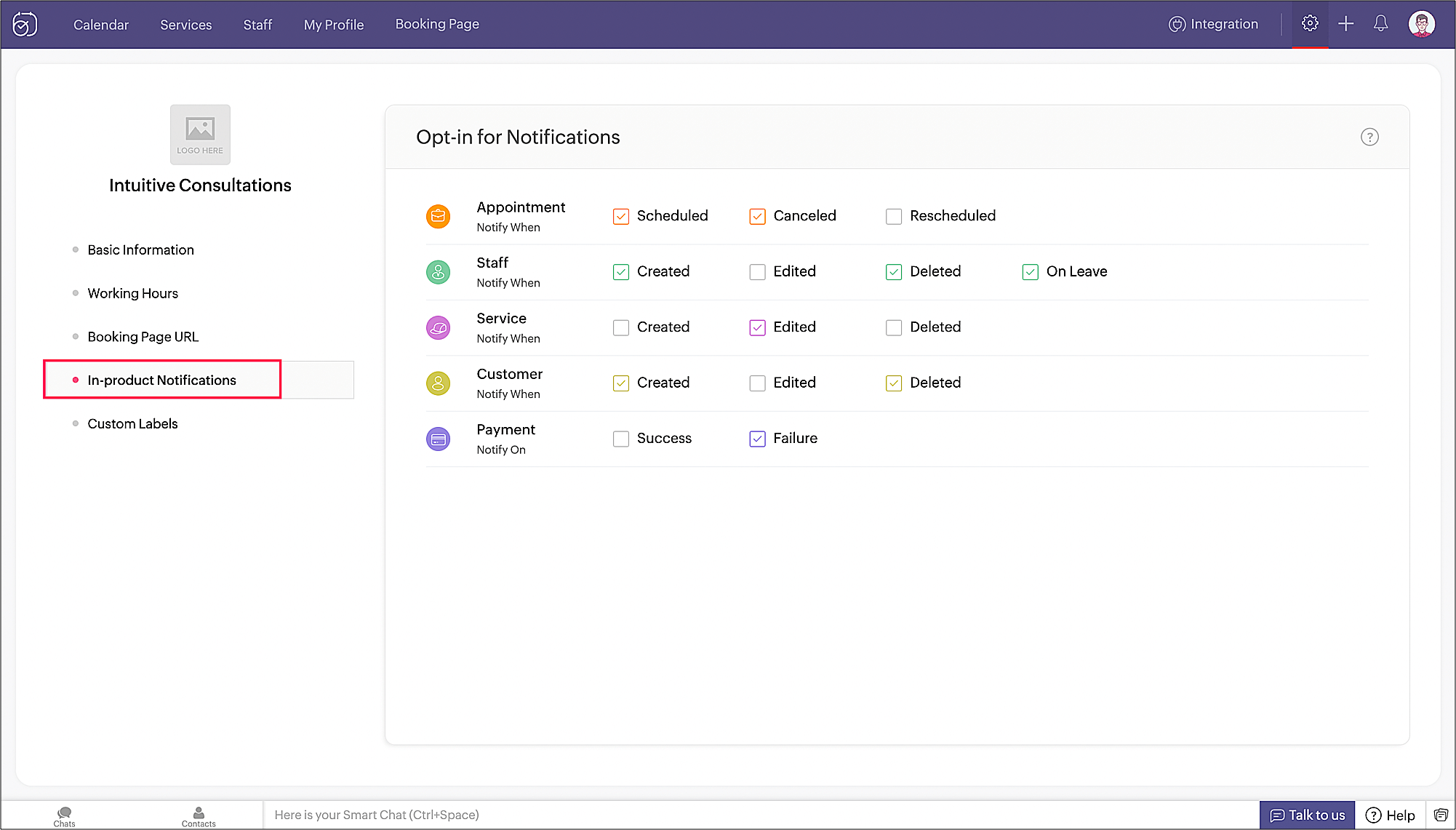 These notifications are for your staff, and are received inside Zoho Bookings. To learn how to configure SMS and email notifications for staff and customers, refer to this page