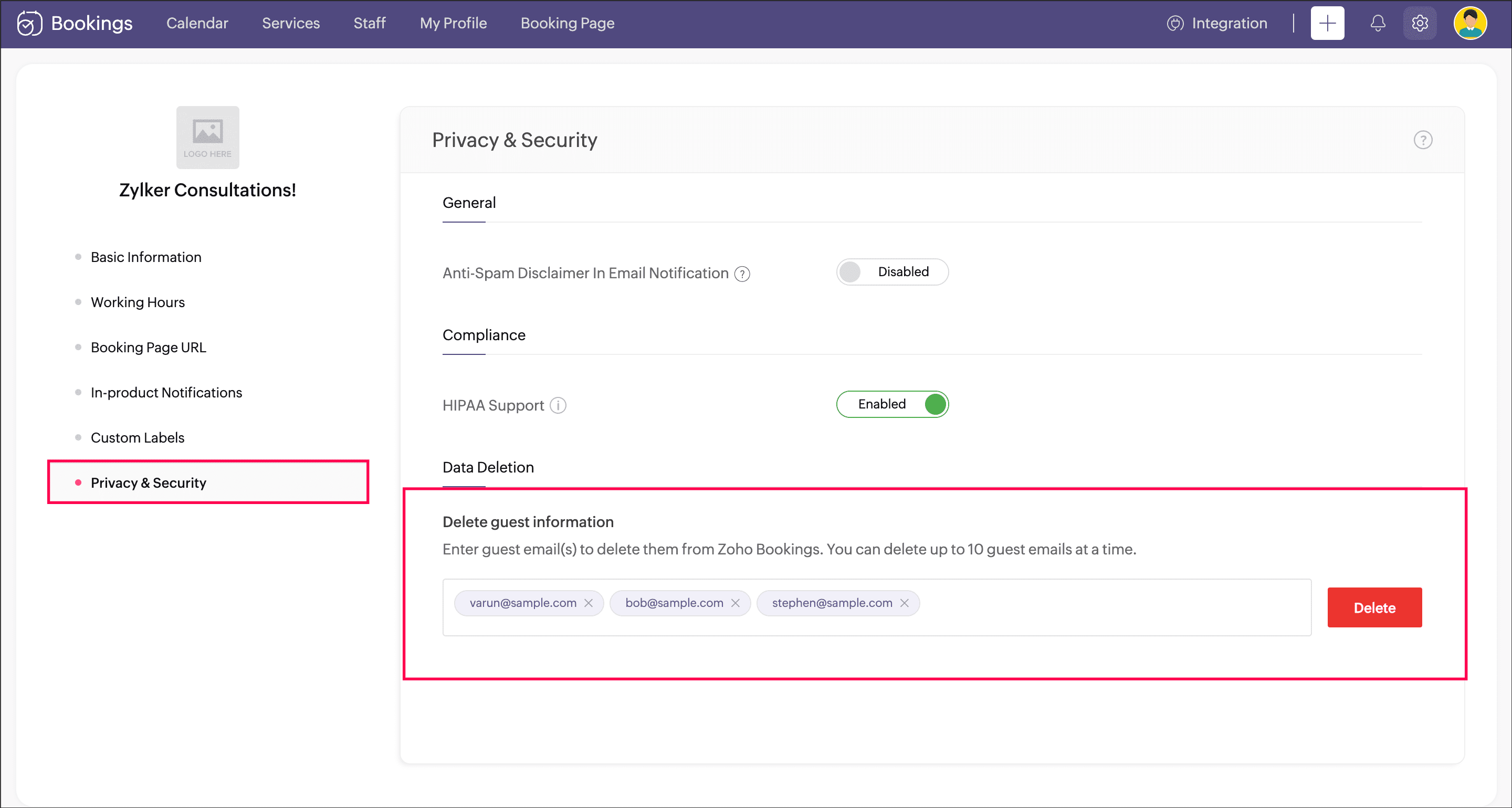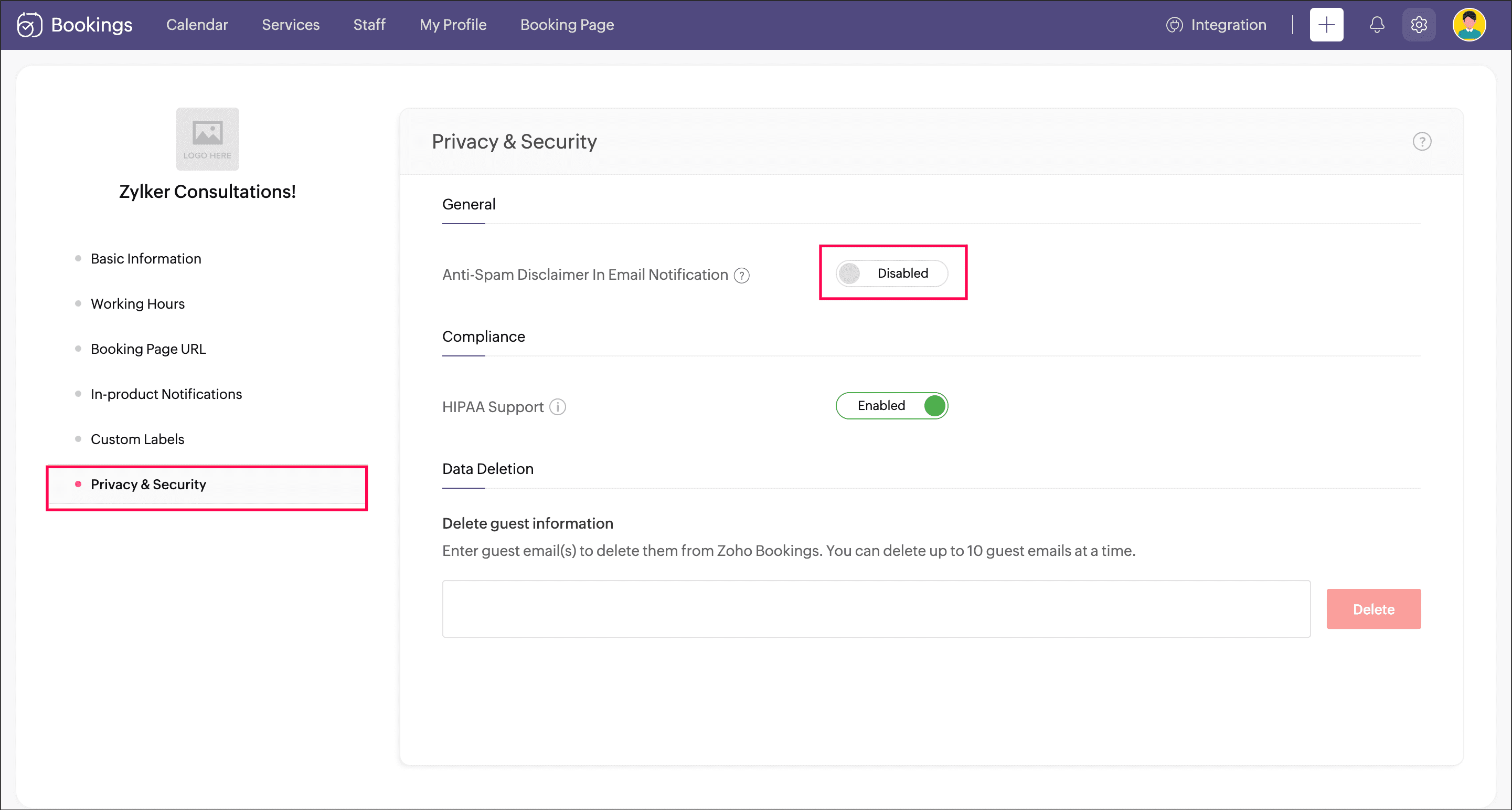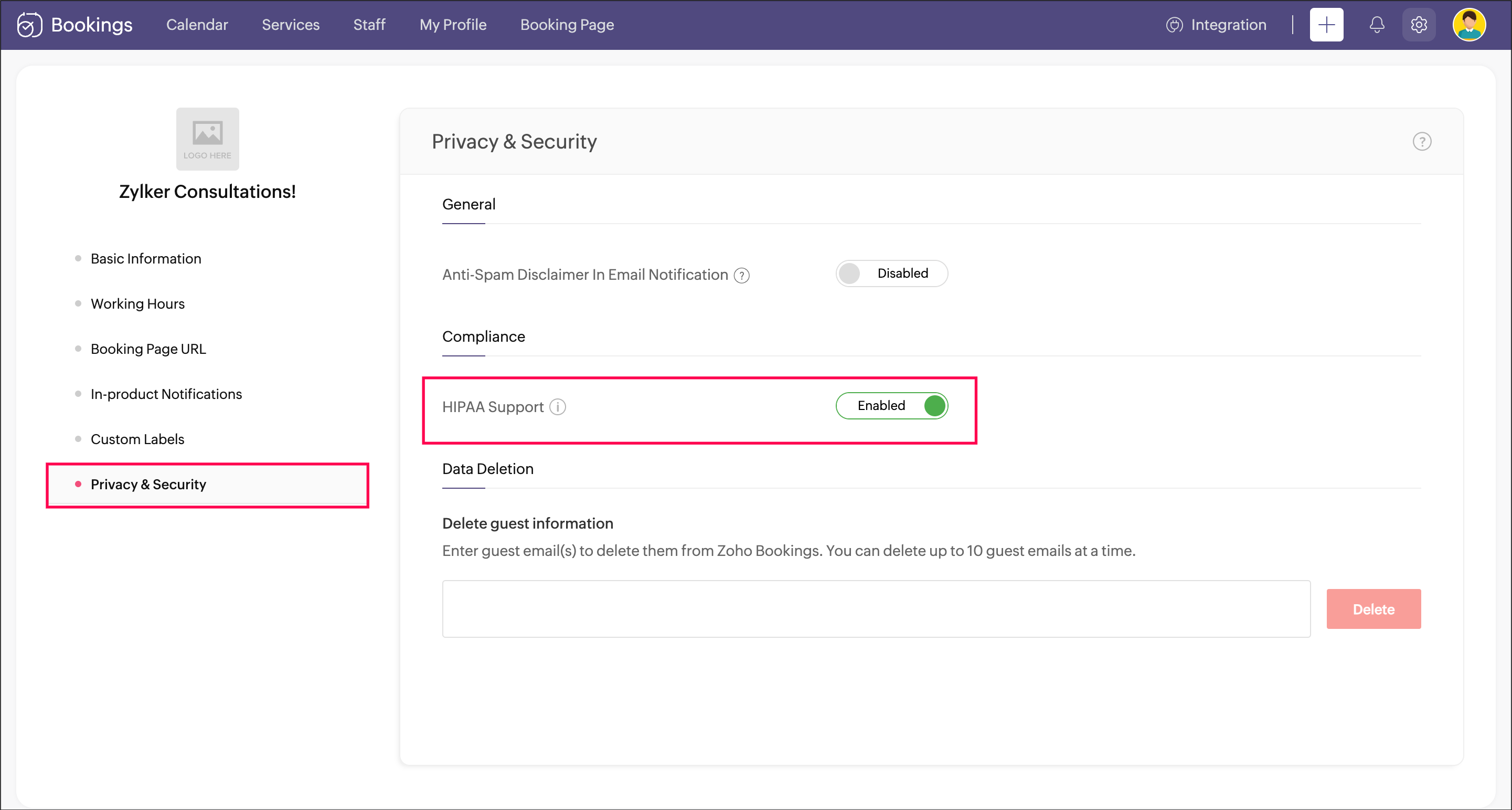 Zoho Bookings protect health information that can identify an individual in a HIPAA compliant manner. Read this detailed help article to learn about it.