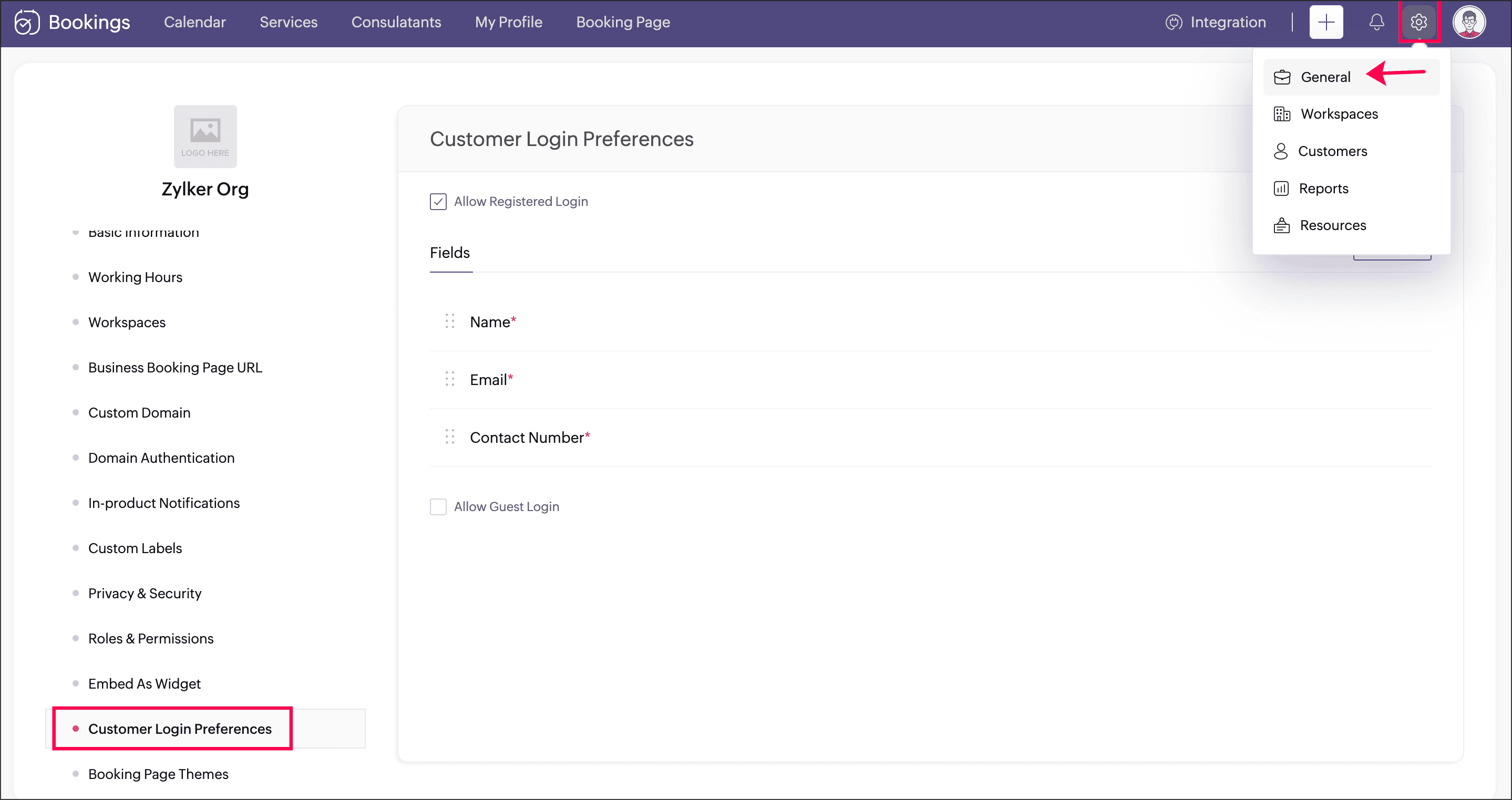 icon and Choose General at the top-right corner of the Zoho Bookings menu bar.
