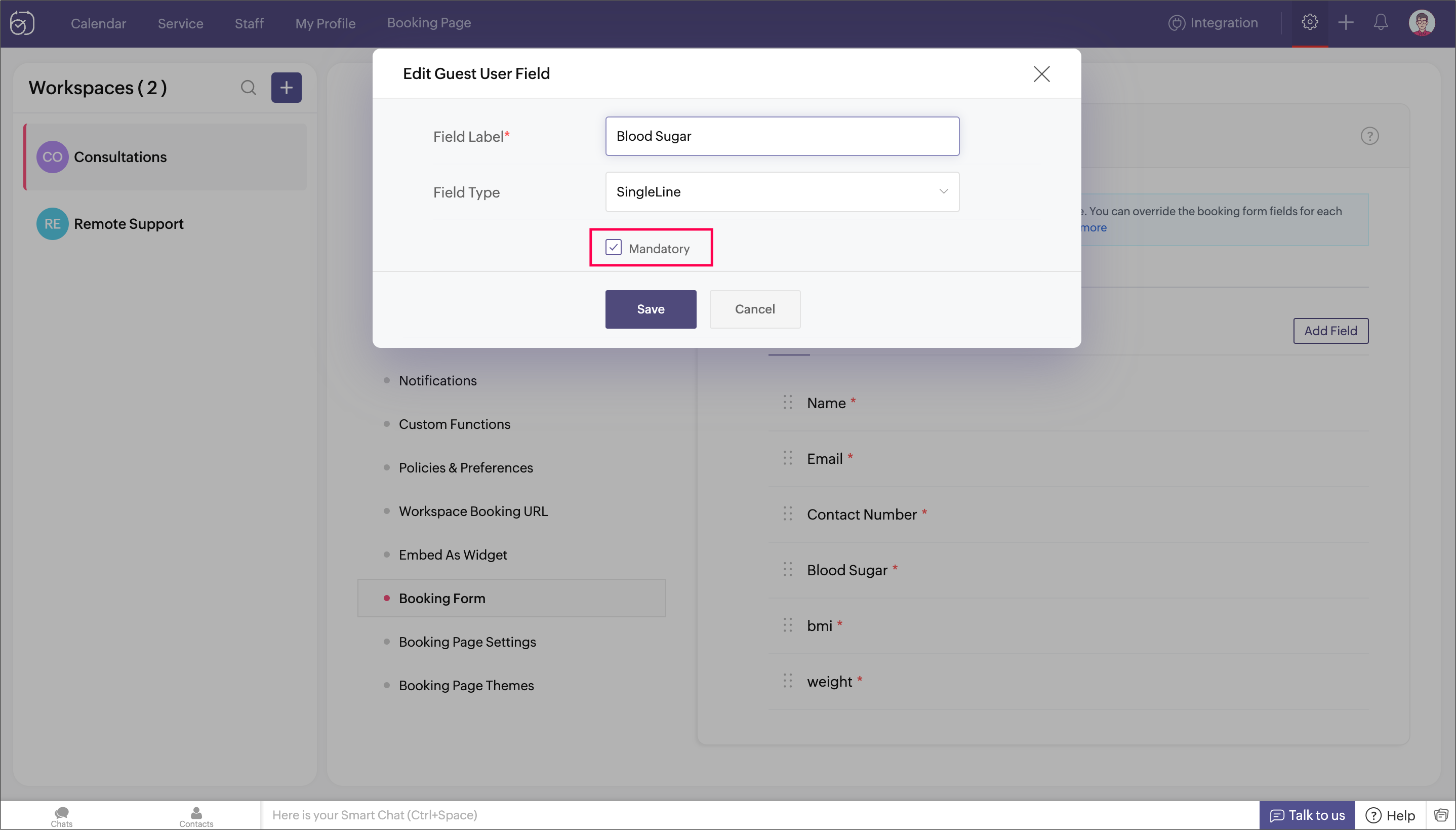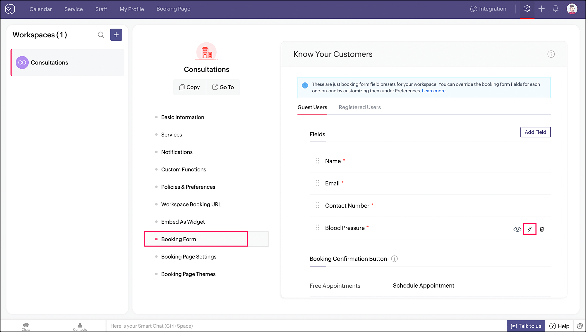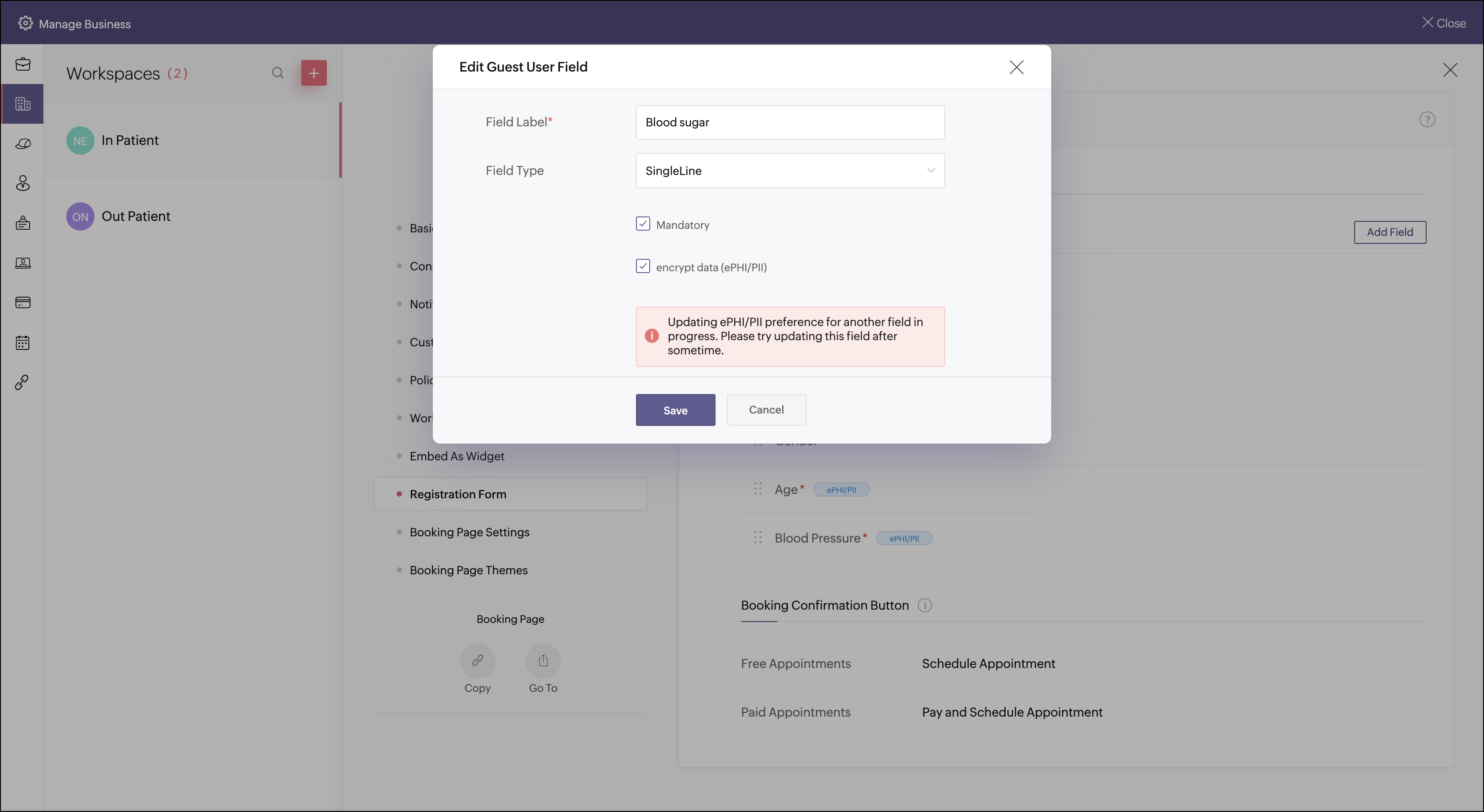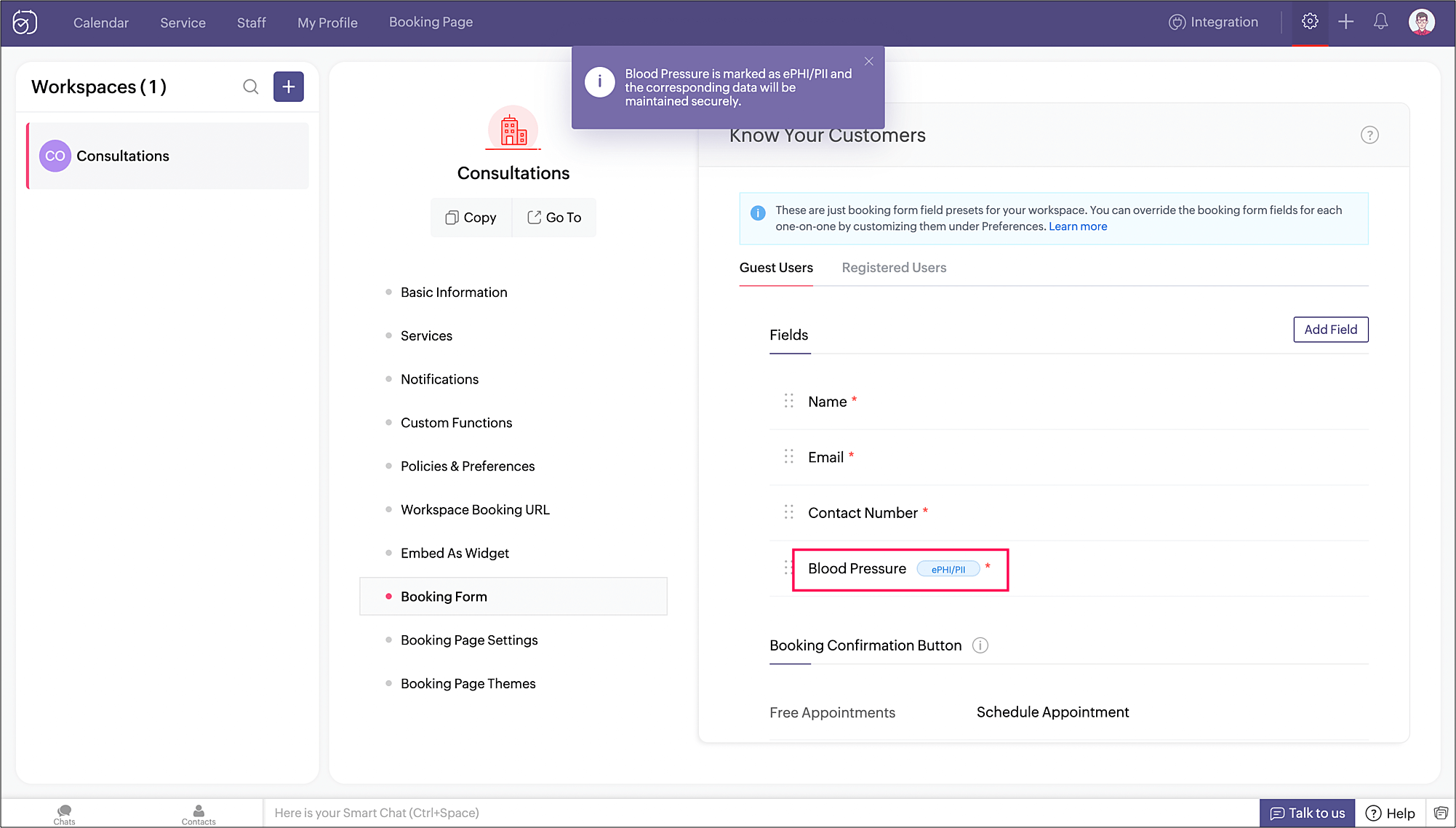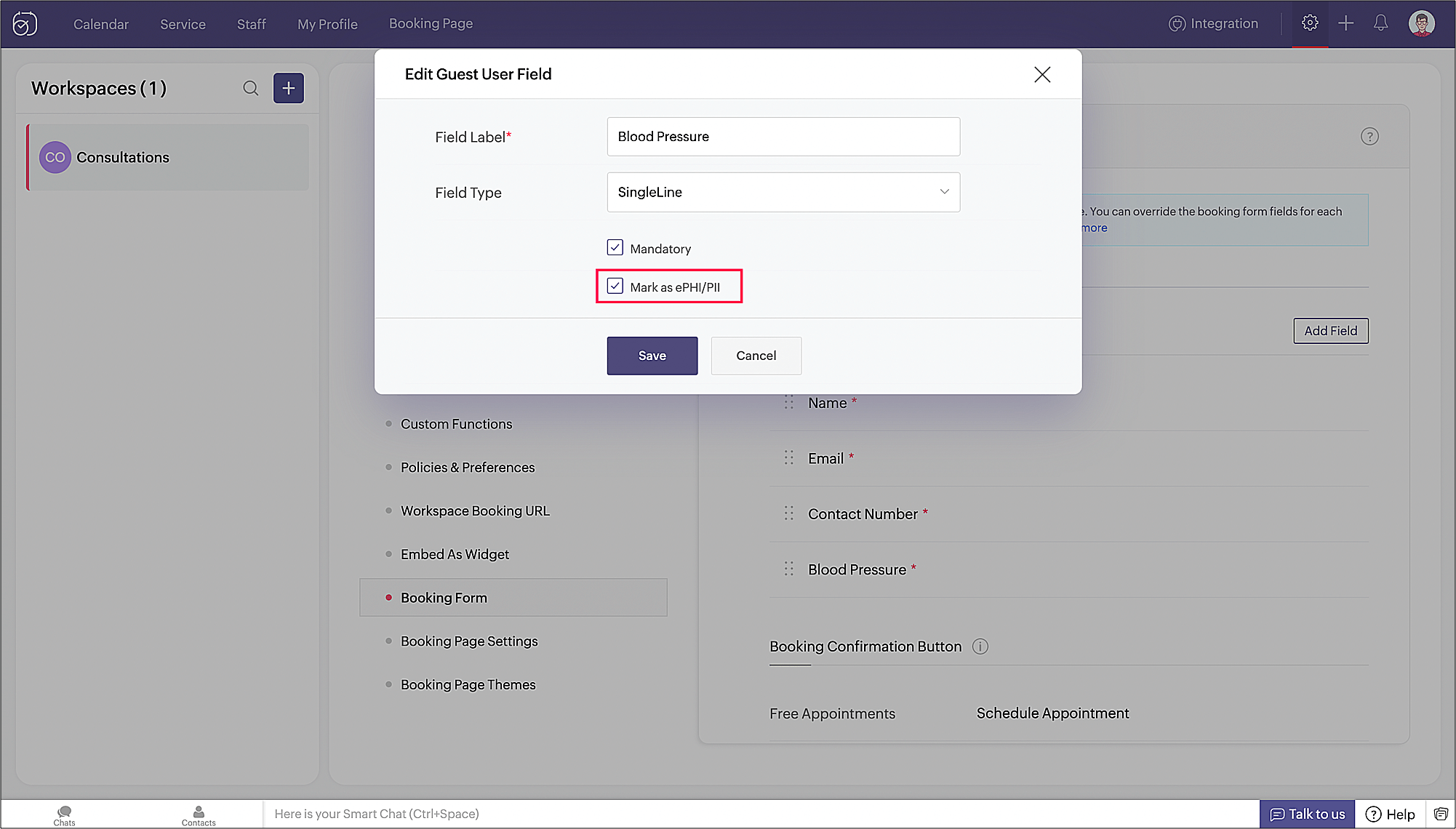 - Navigate to Manage Business > Workspaces > (select a workspace) > Booking Form. Edit the field (Blood Pressure, in this case) that would contain sensitive information.
