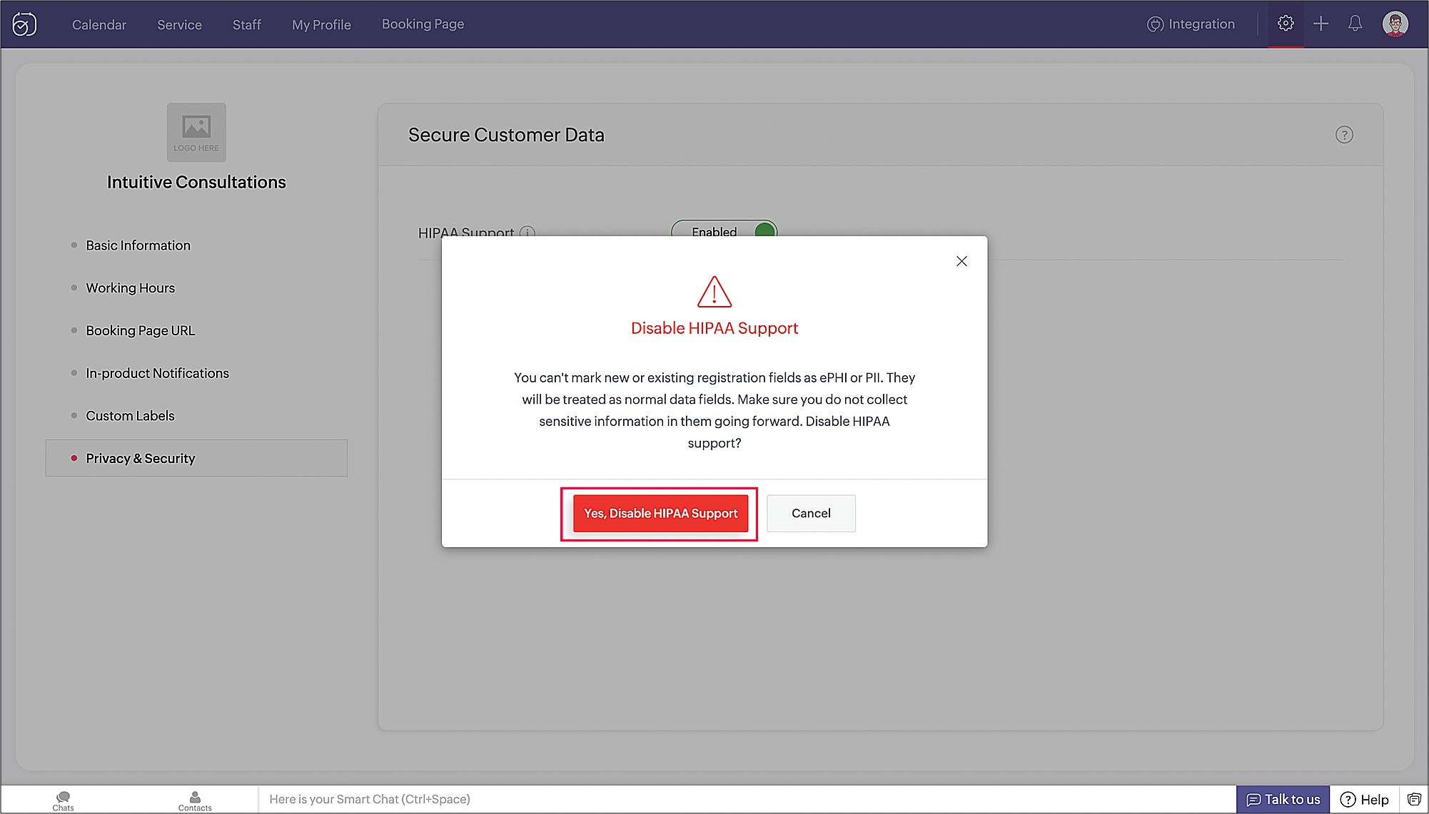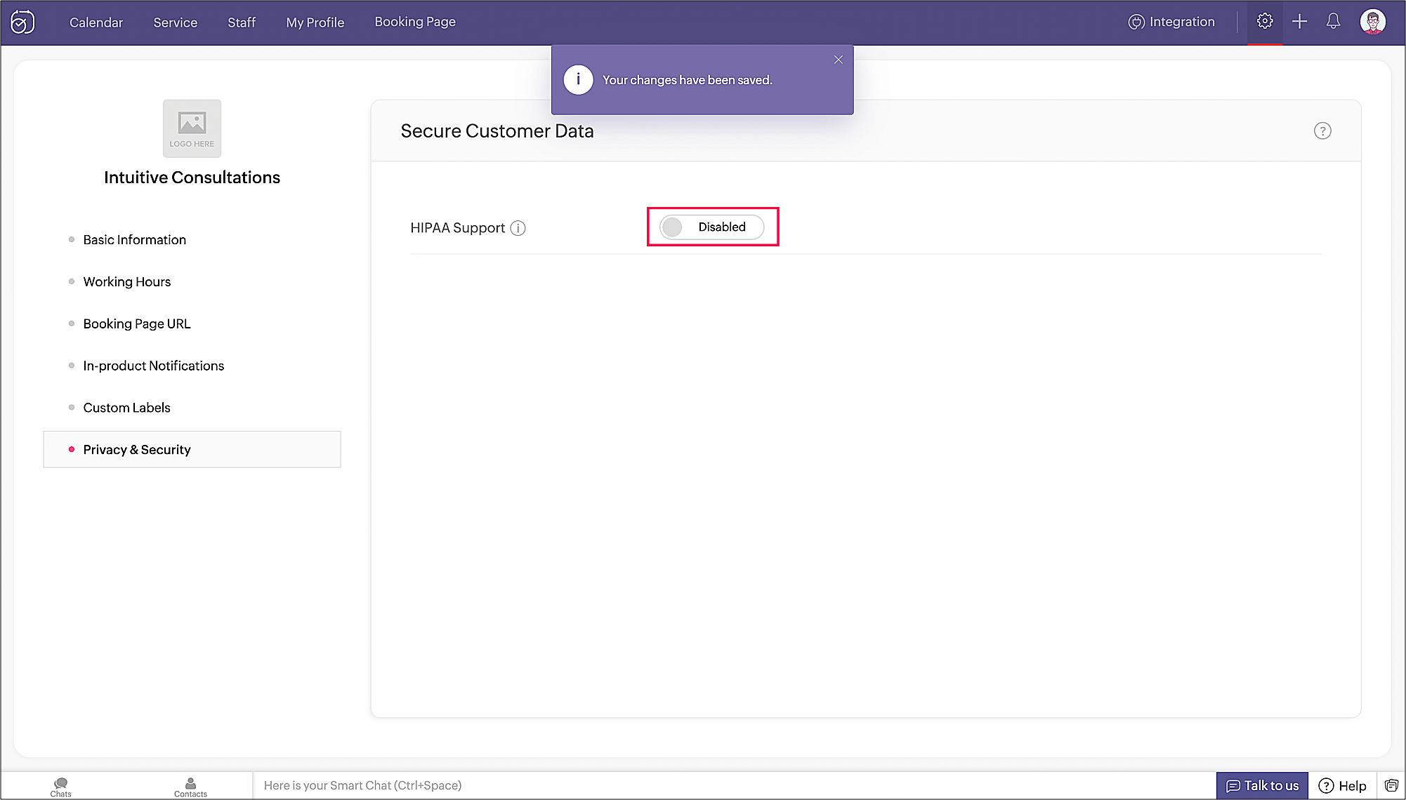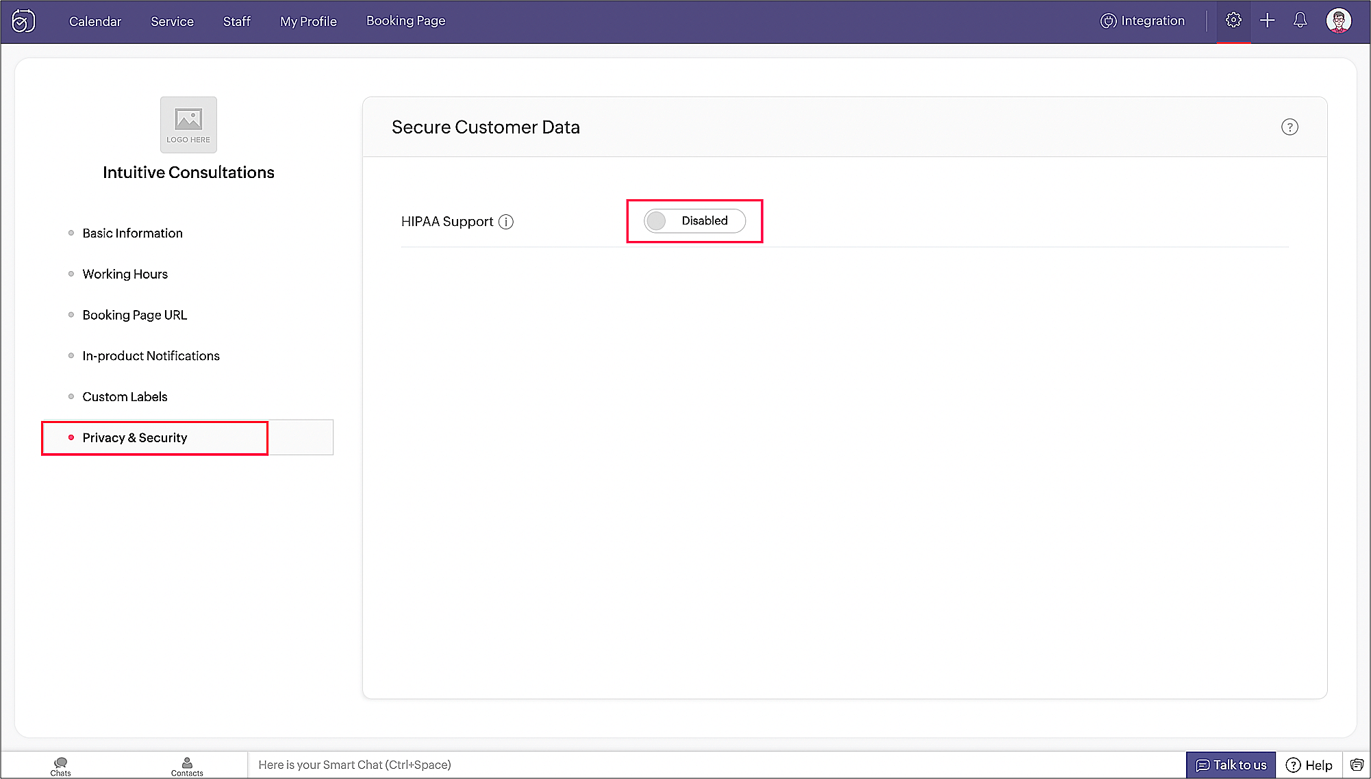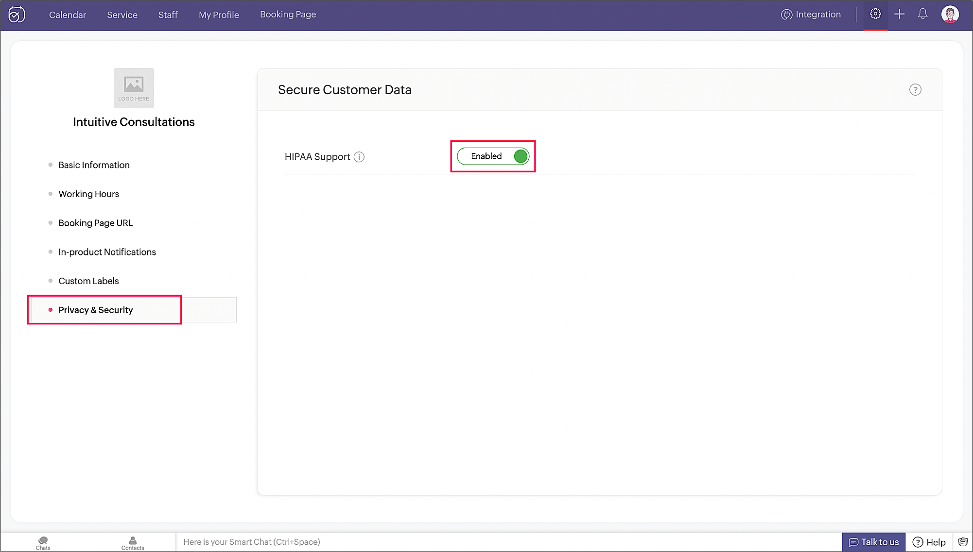 Below are what you can do with respect to HIPAA compliance inside Zoho Bookings: