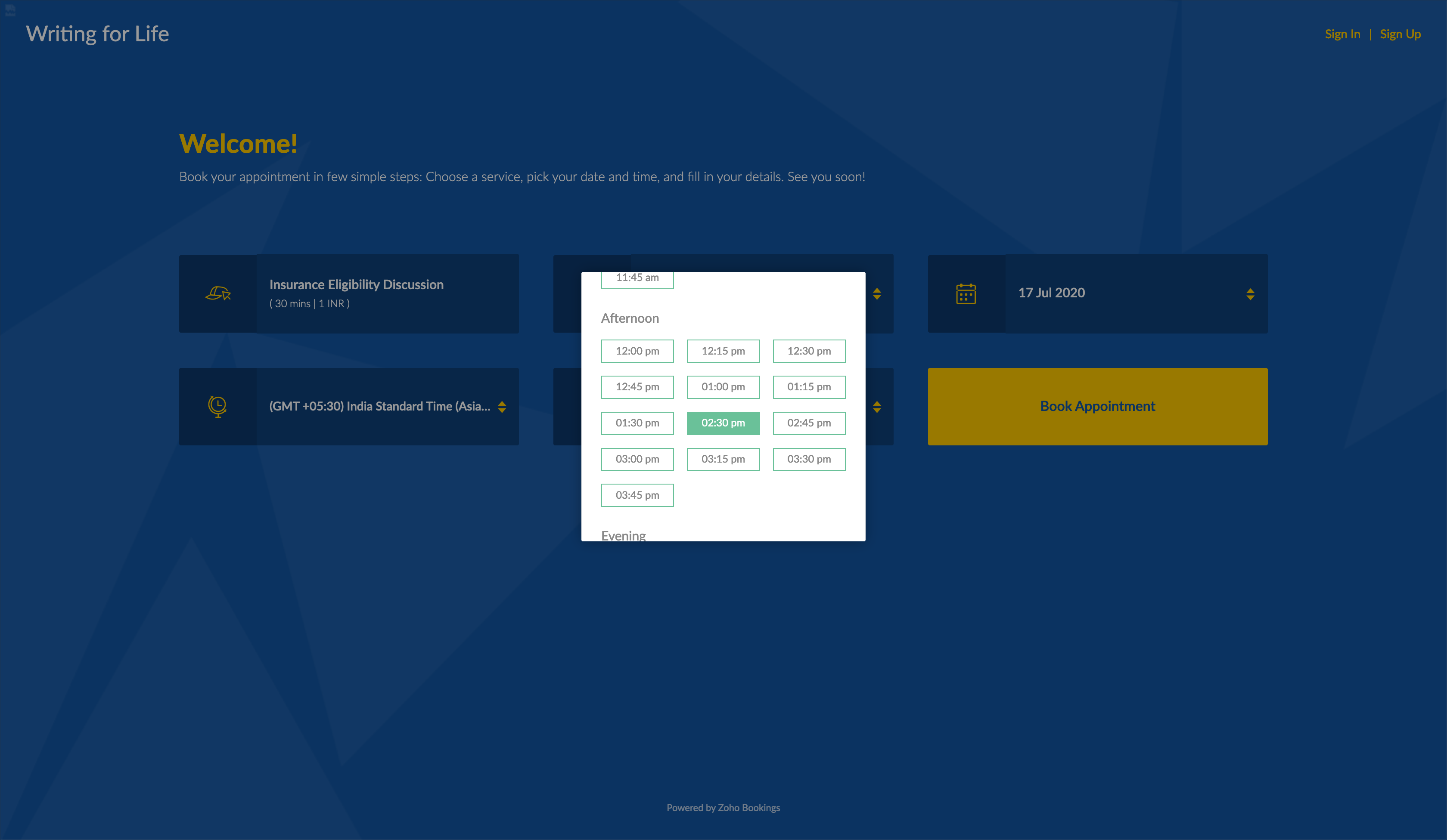 2. Once the Outlook event blocks the Zoho Bookings Calendar, the corresponding Staff (John in this case) is not available for booking during this period (2:00 PM to 2:30 PM).