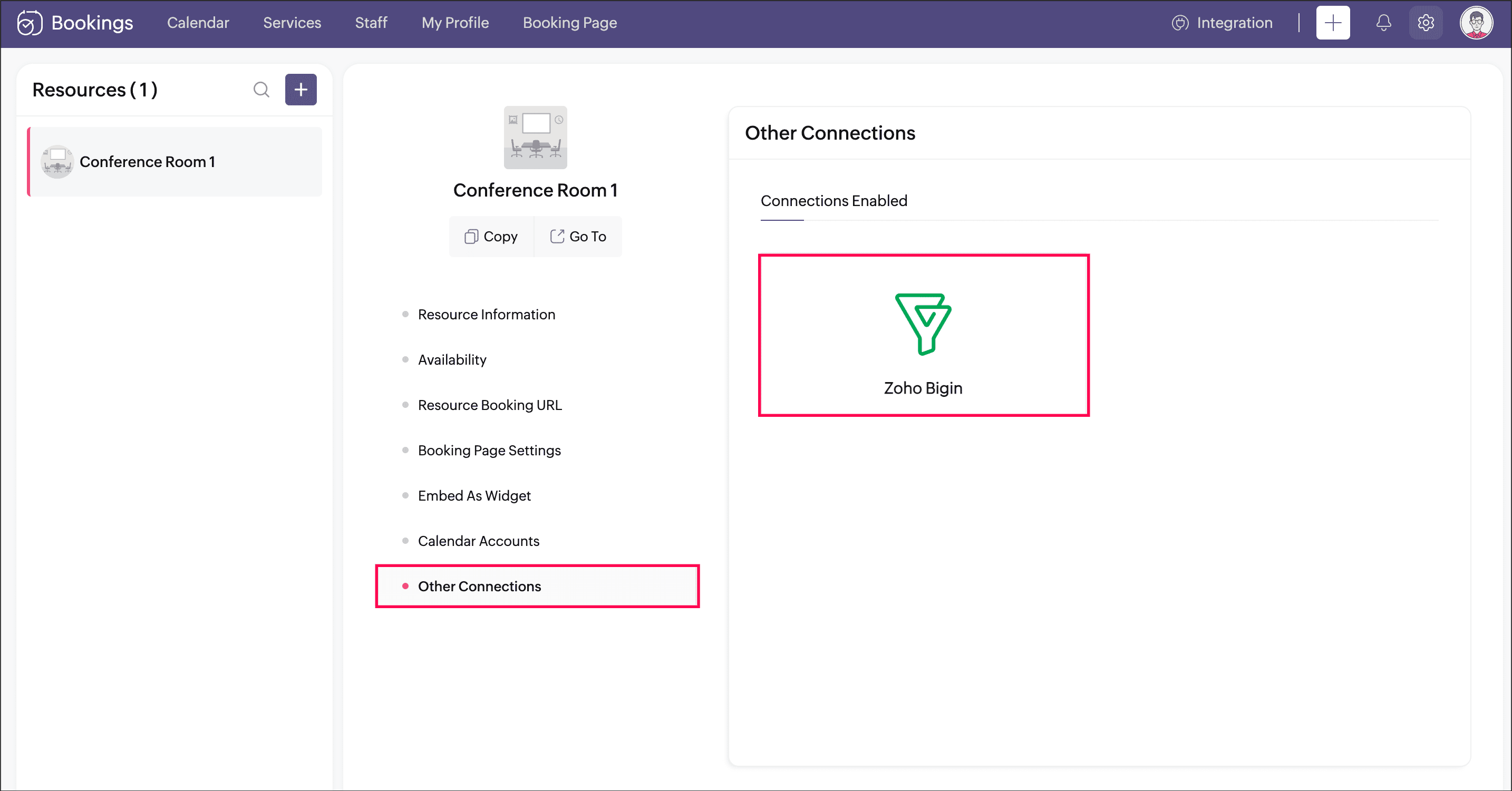 Any one of the admin's or in-charge staff member's calendars can be linked to a resource. This can be useful if a staff member should be blocked when the resource is booked. Under Resources > Other Connections, you can select the Bigin calendar of any one of the users.