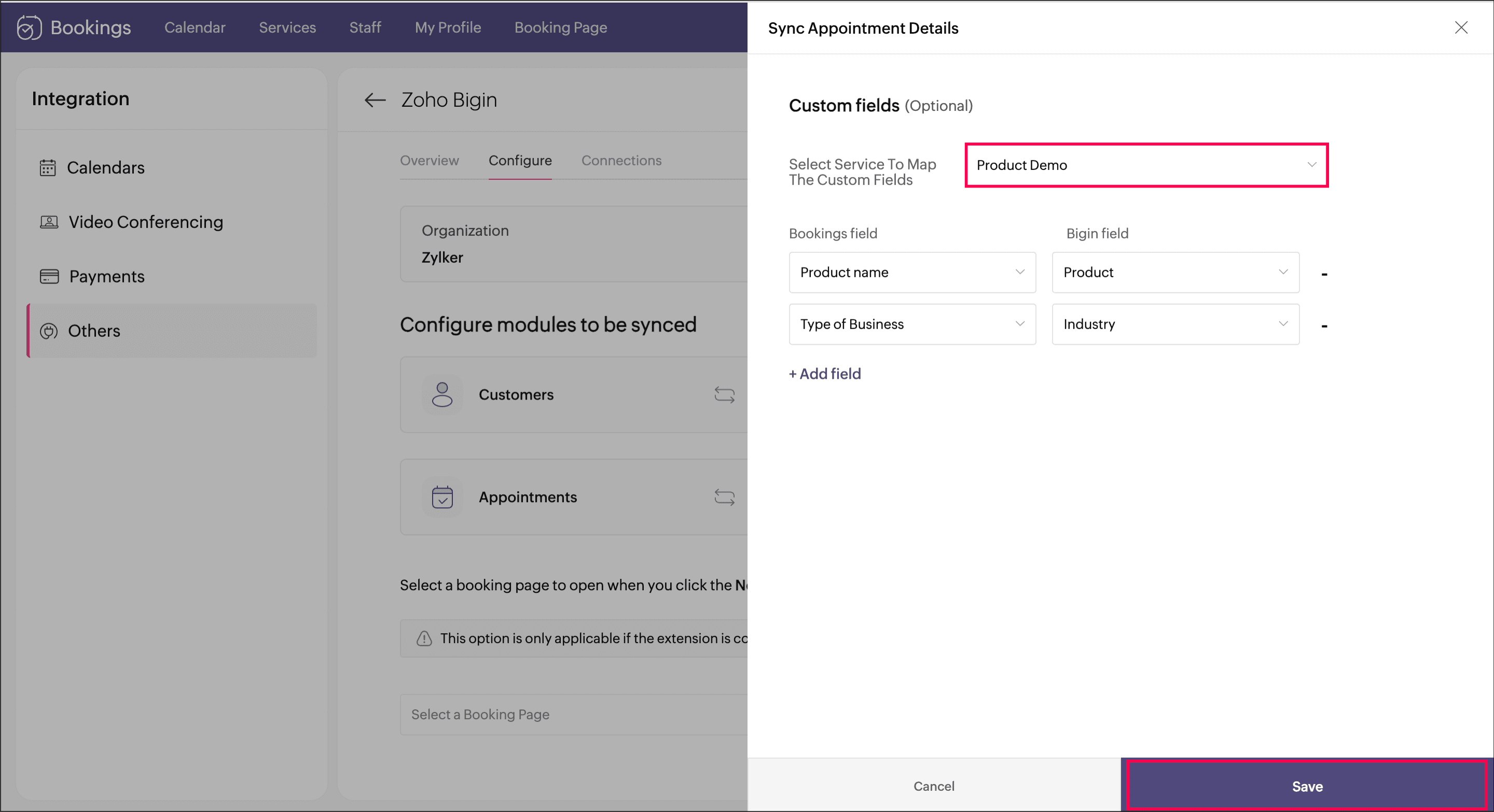 Note: In custom fields mapping, when you change the services, the previous service mappings are still retained. You can choose multiple services and map their custom fields. - Click Save. The integration is all set.