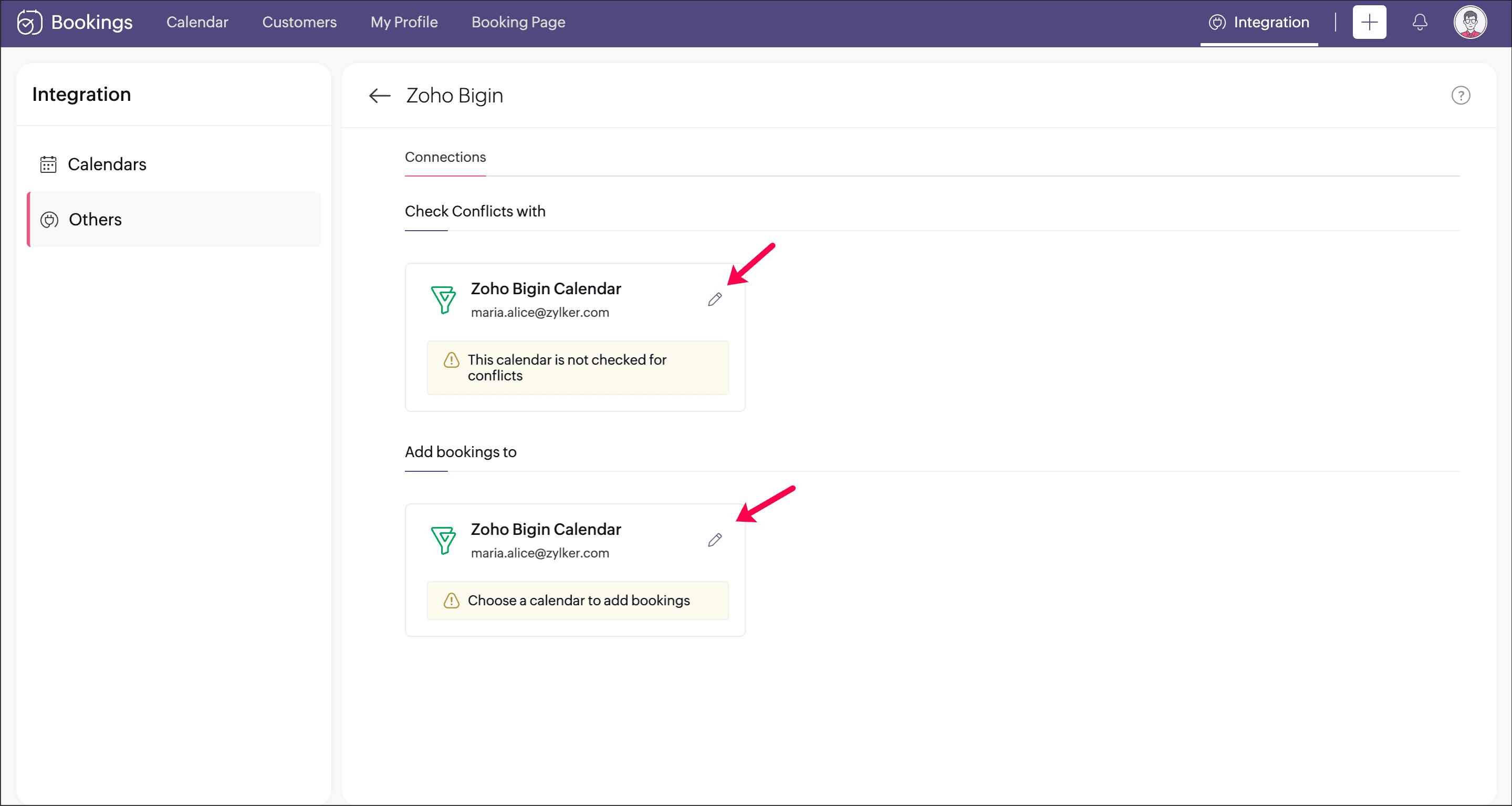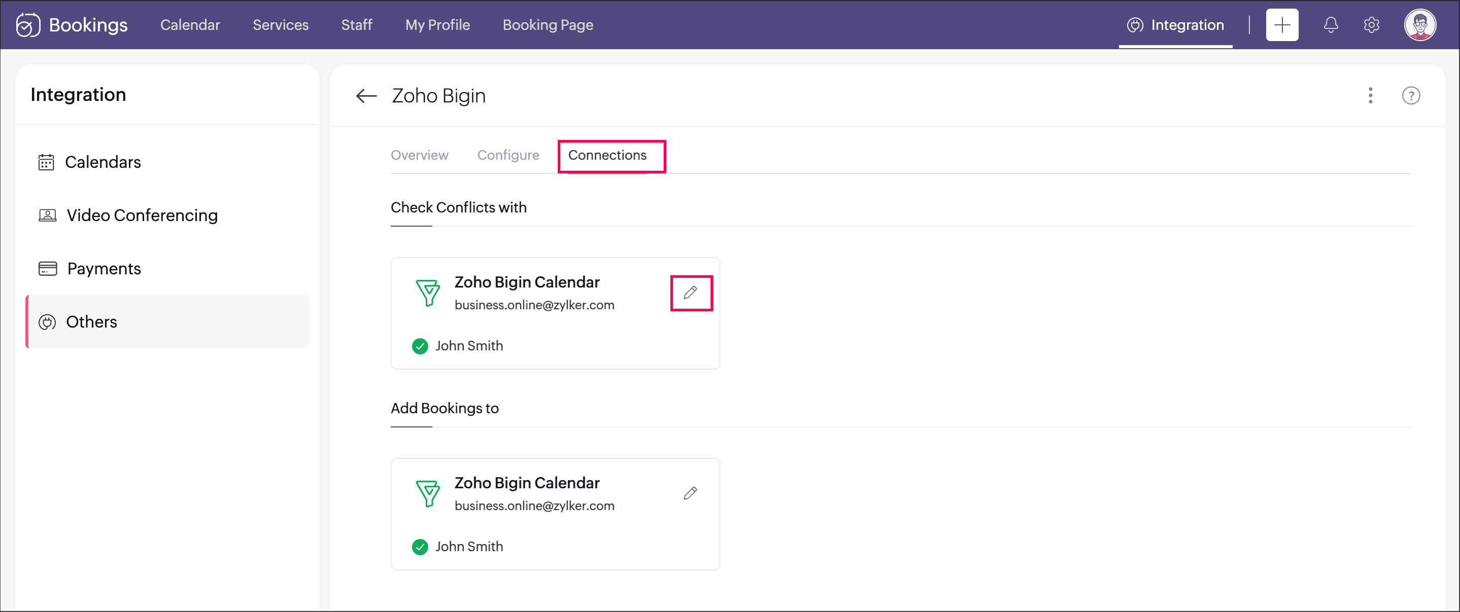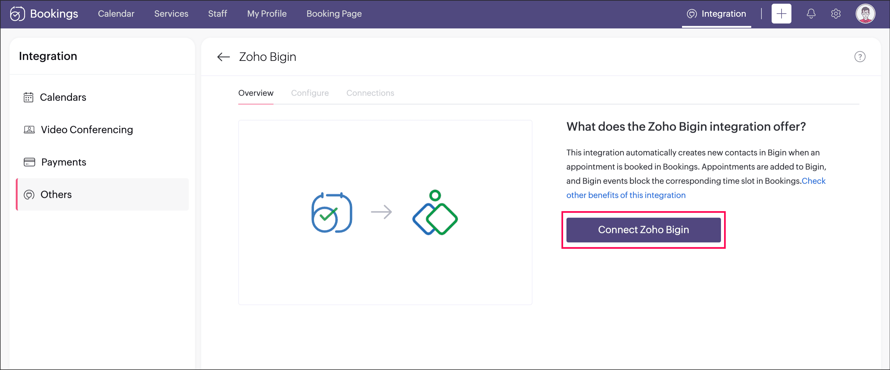 Once an admin set up the integration, the staff can connect their Bigin account to Bookings to check conflicts and add their appointments to Bigin. To connect, the staff member has to be a user in Bigin.
