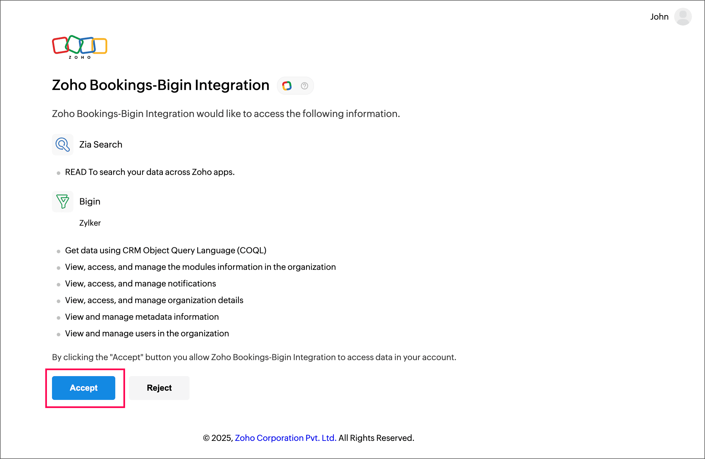 - Only the admin who integrated the connection can reauthorize the Bigin connection if the connection is revoked.