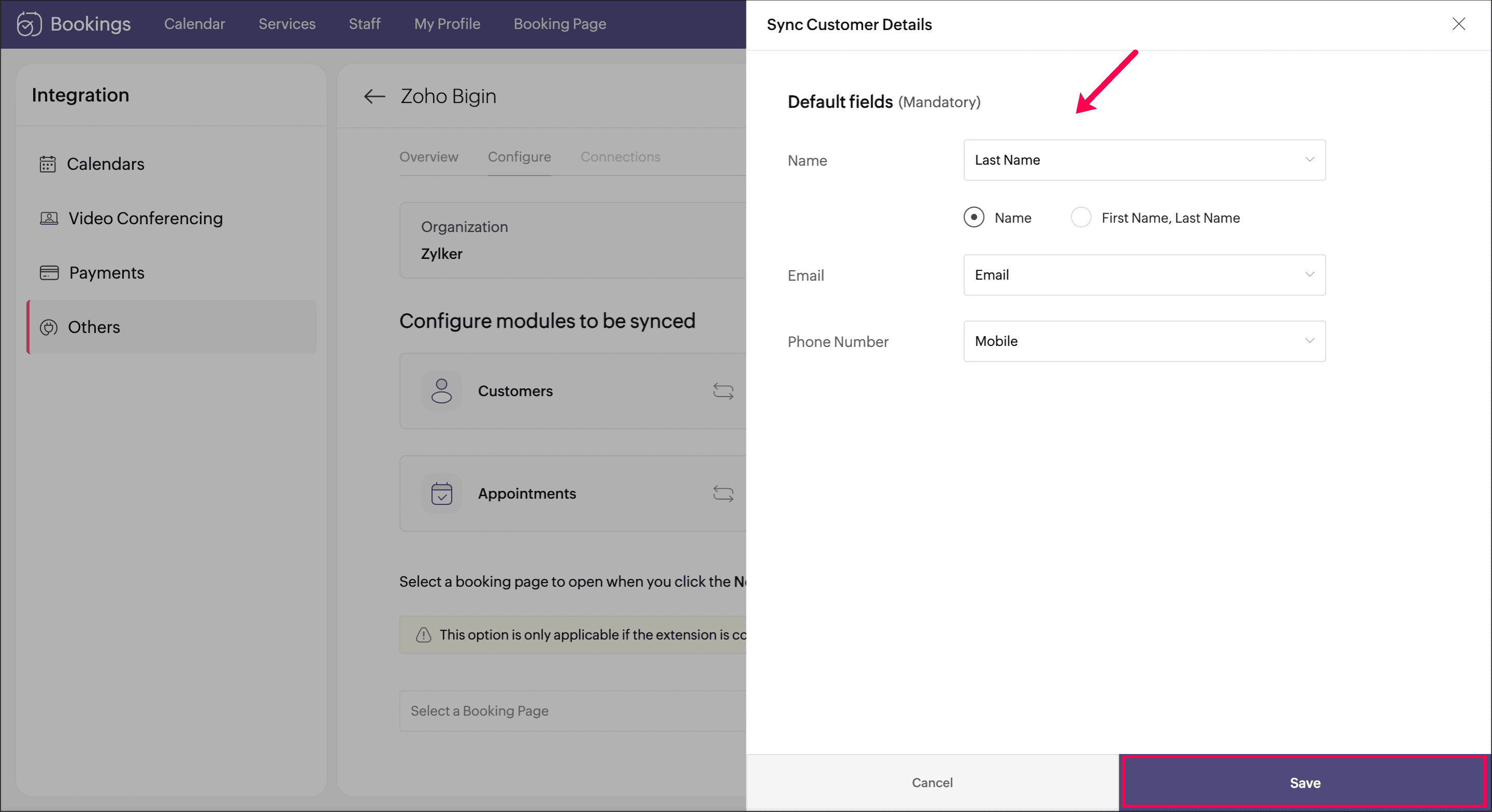 - A slider will be shown where you can map the booking form fields to Bigin fields. The first slider, Sync Customer Details, lets you map the default Bookings fields like Name, Email, and Contact Number to Bigin's Contacts module fields. Select the required Bigin fields in the right side dropdowns as shown in the below image.