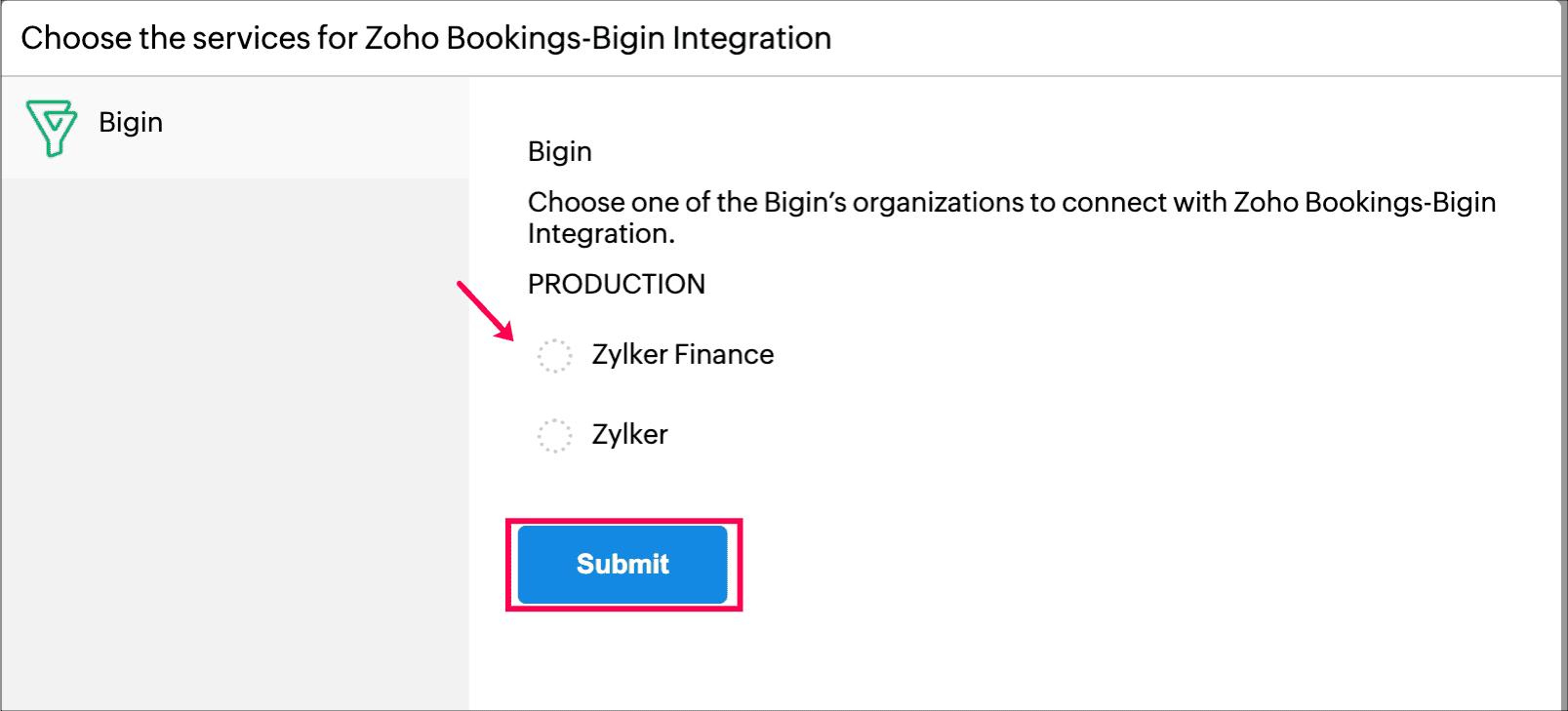 - Choose the Bigin organization that you want to connect, then click Submit.