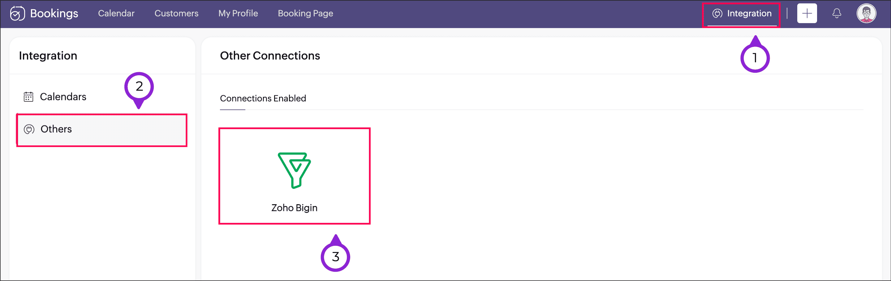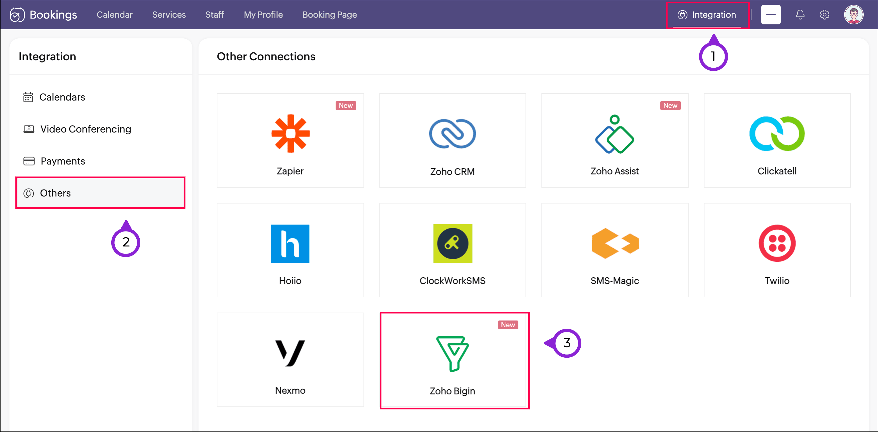 - Click Integrations in the top-right corner of the Bookings menu bar and select Others on the left side pane.