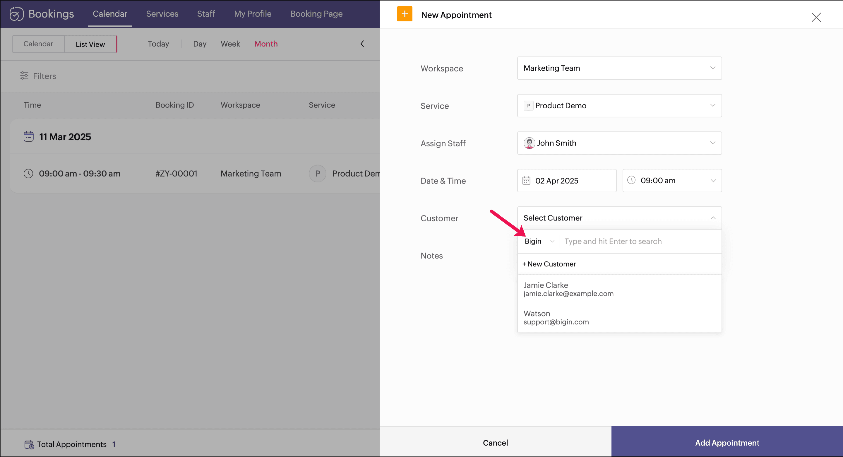 - Bigin customers can be accessed in Bookings while adding an appointment.