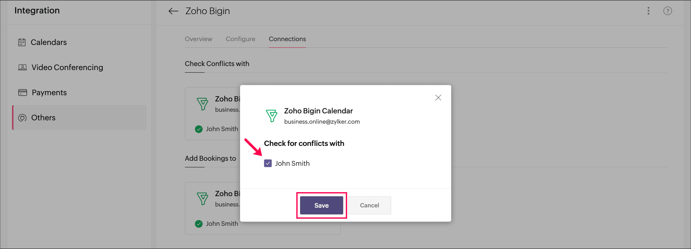 - Select the Bigin calendar in the Check conflicts with section to block the conflicting slots as explained in section 5.2.