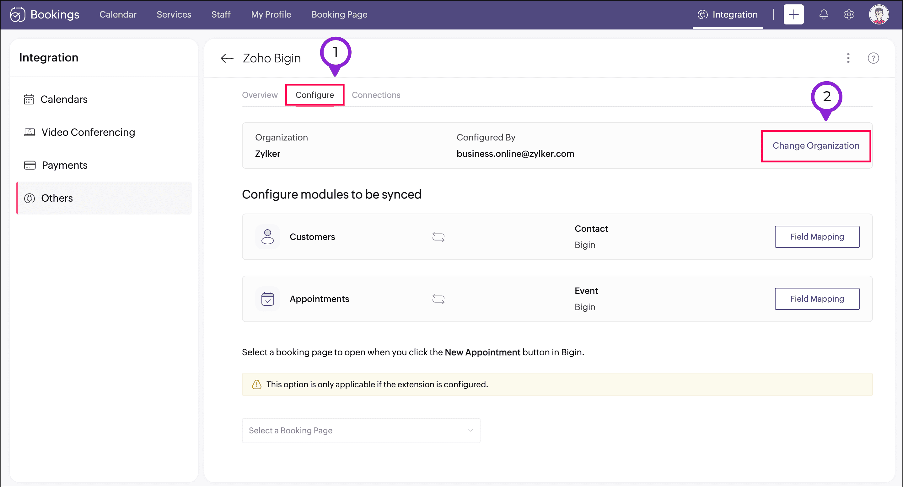 This integration connects Bookings org to any one of the Bigin organizations. You can change the required Bigin organization by clicking the Change Organization option in the Configure tab as shown in the below image.