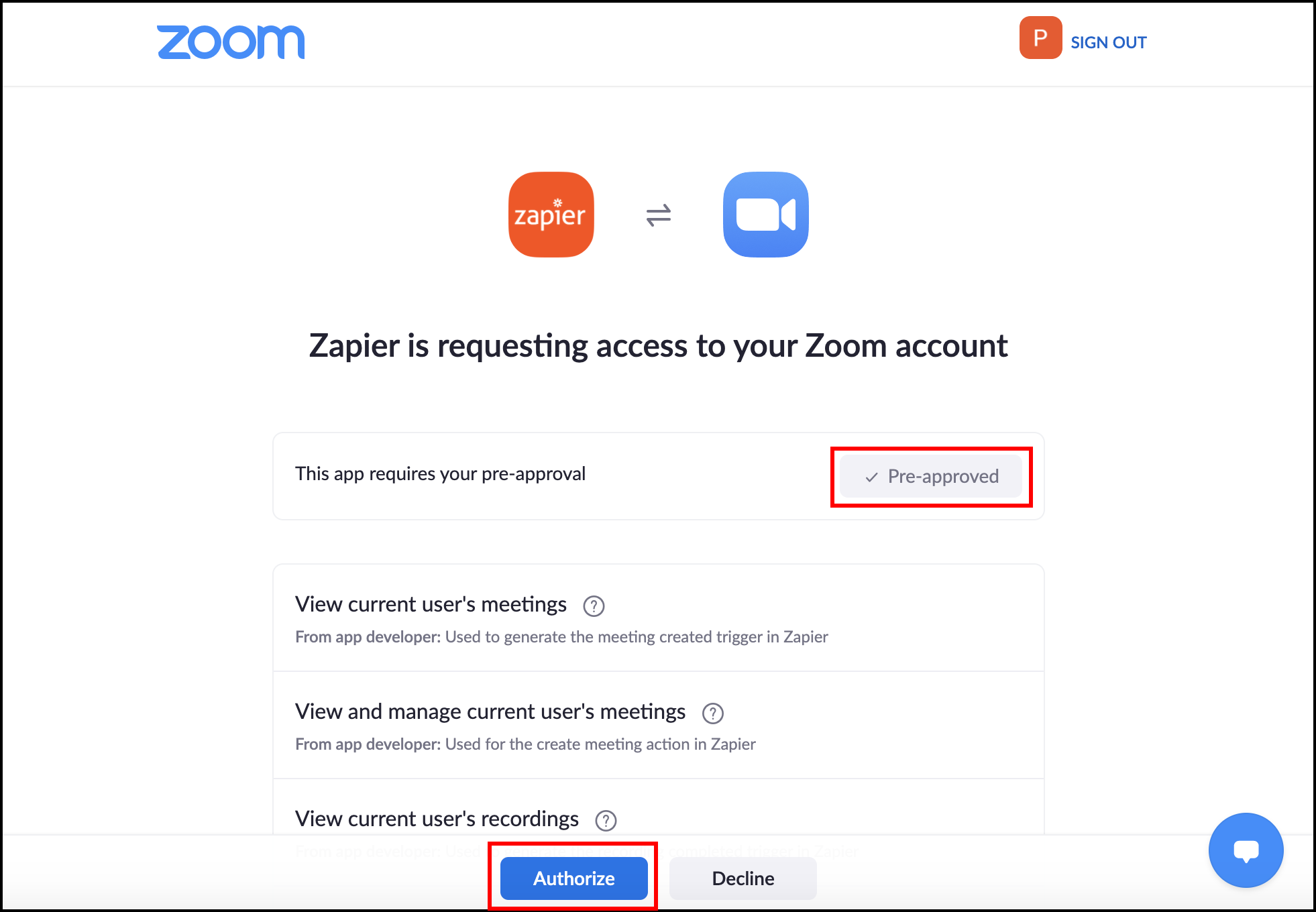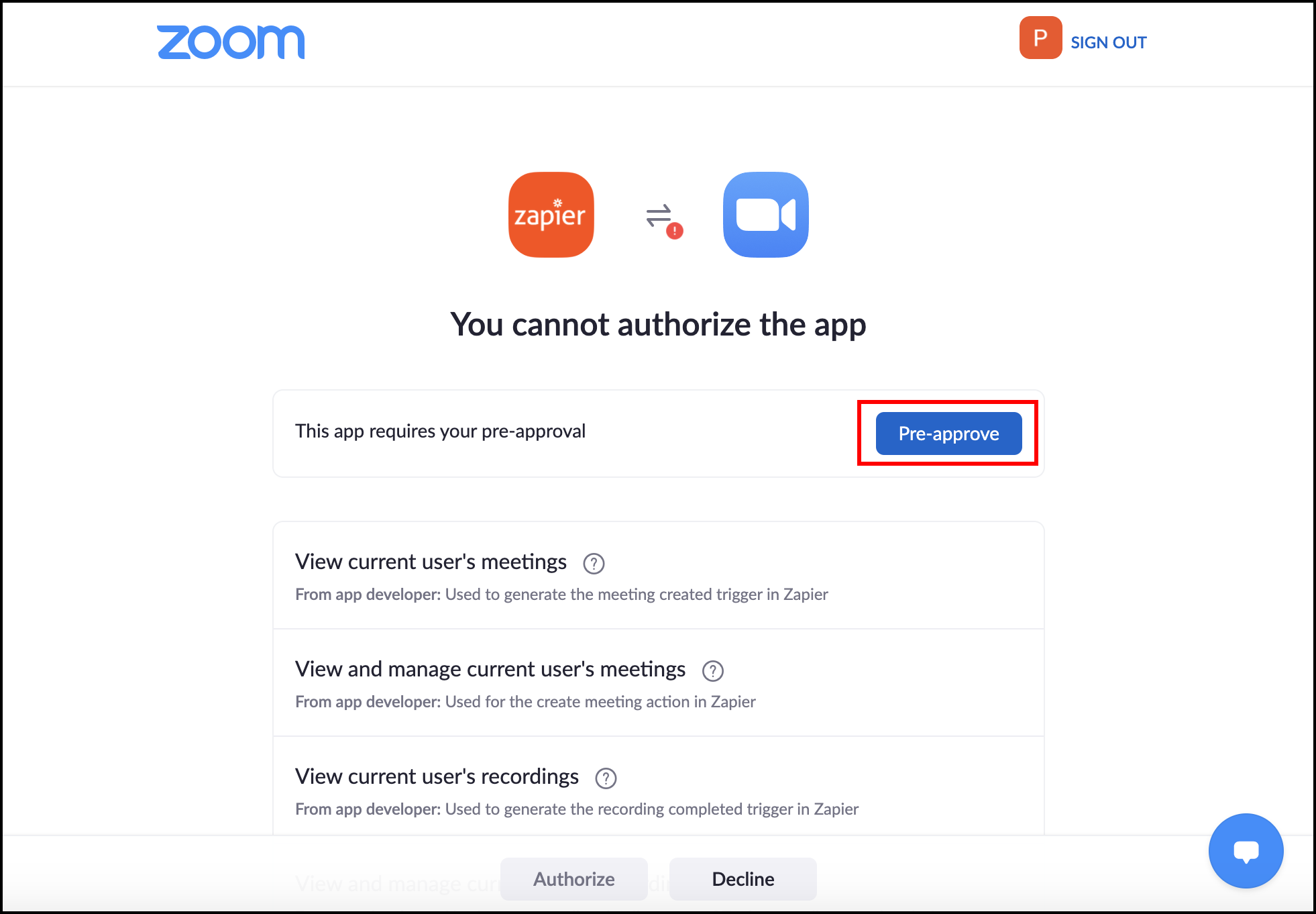 Only Super Admins and Admins can create a zap to connect to Zoom.