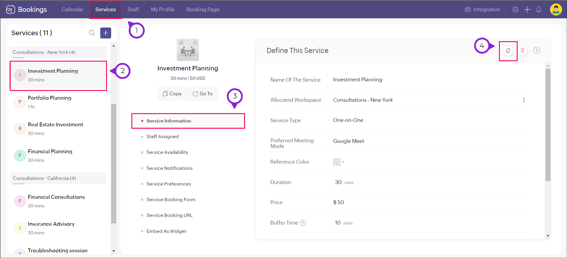 When a new service is added, it involves configuring various settings like preferences, availability, notifications, and more. When multiple services need to be created, it can be time-consuming to configure the same settings repeatedly. To avoid this, a service can be copied to create new services with the same set of configurations.