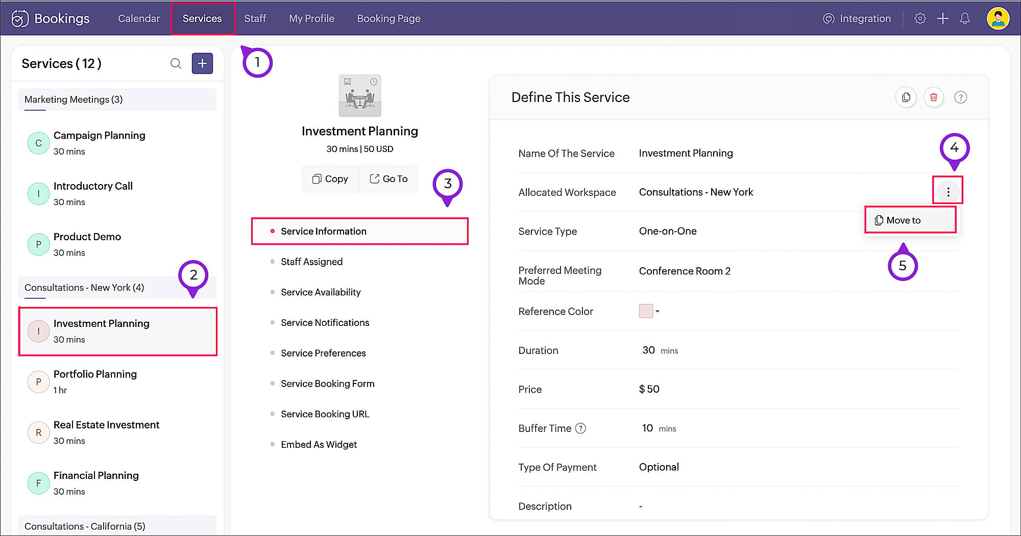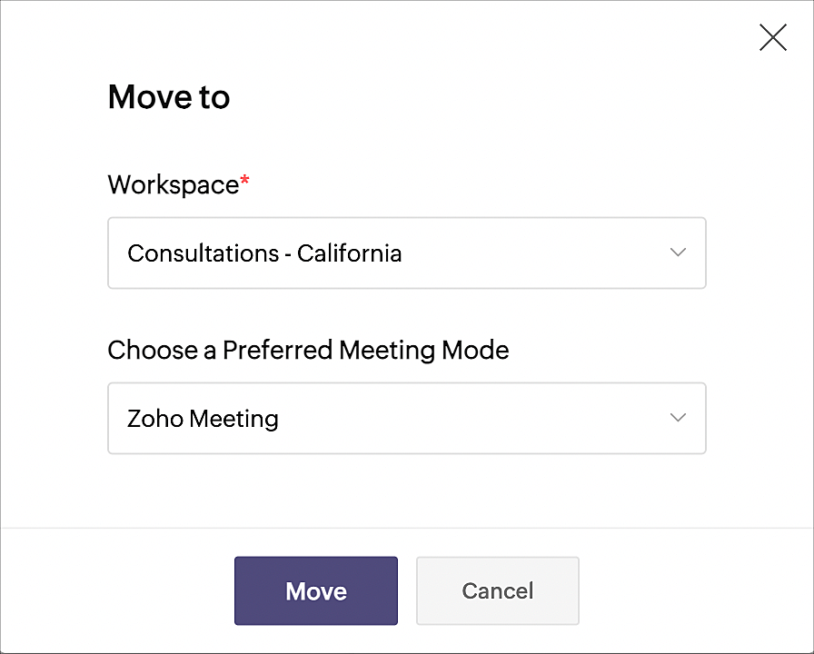 Choose a Preferred Meeting Mode if required, then click Move. This moves the service to the chosen workspace.