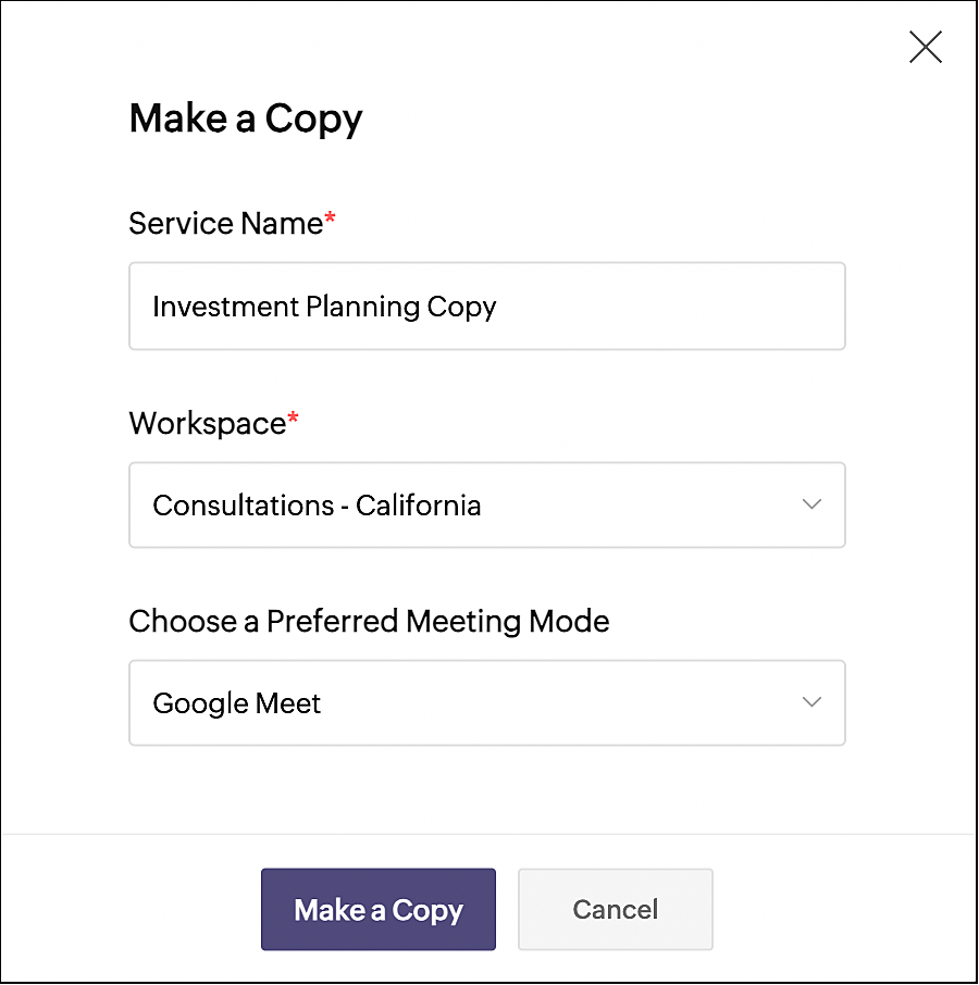 Choose a Preferred Meeting Mode if required, then click Make a Copy. This creates a new service in the chosen workspace.