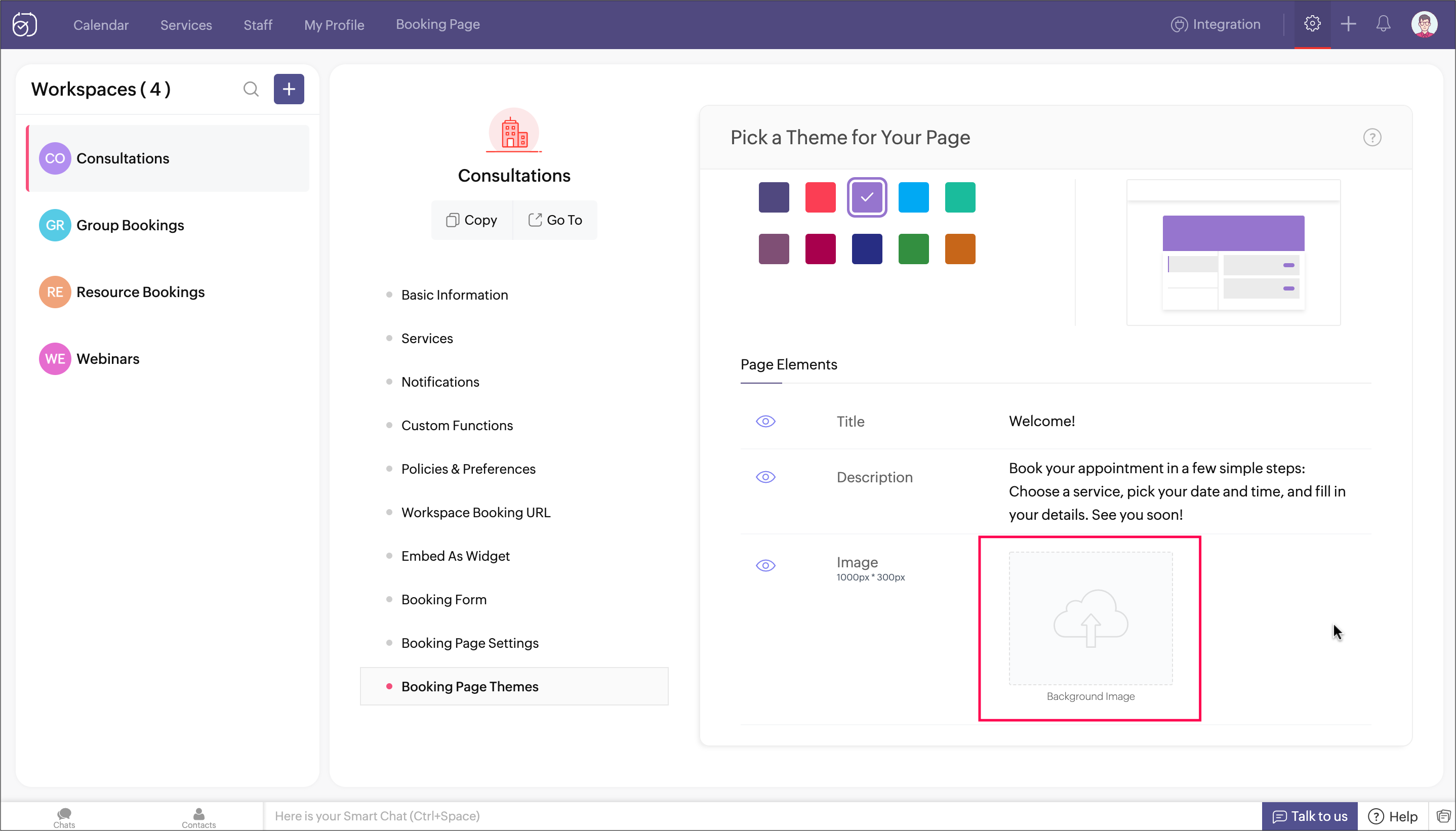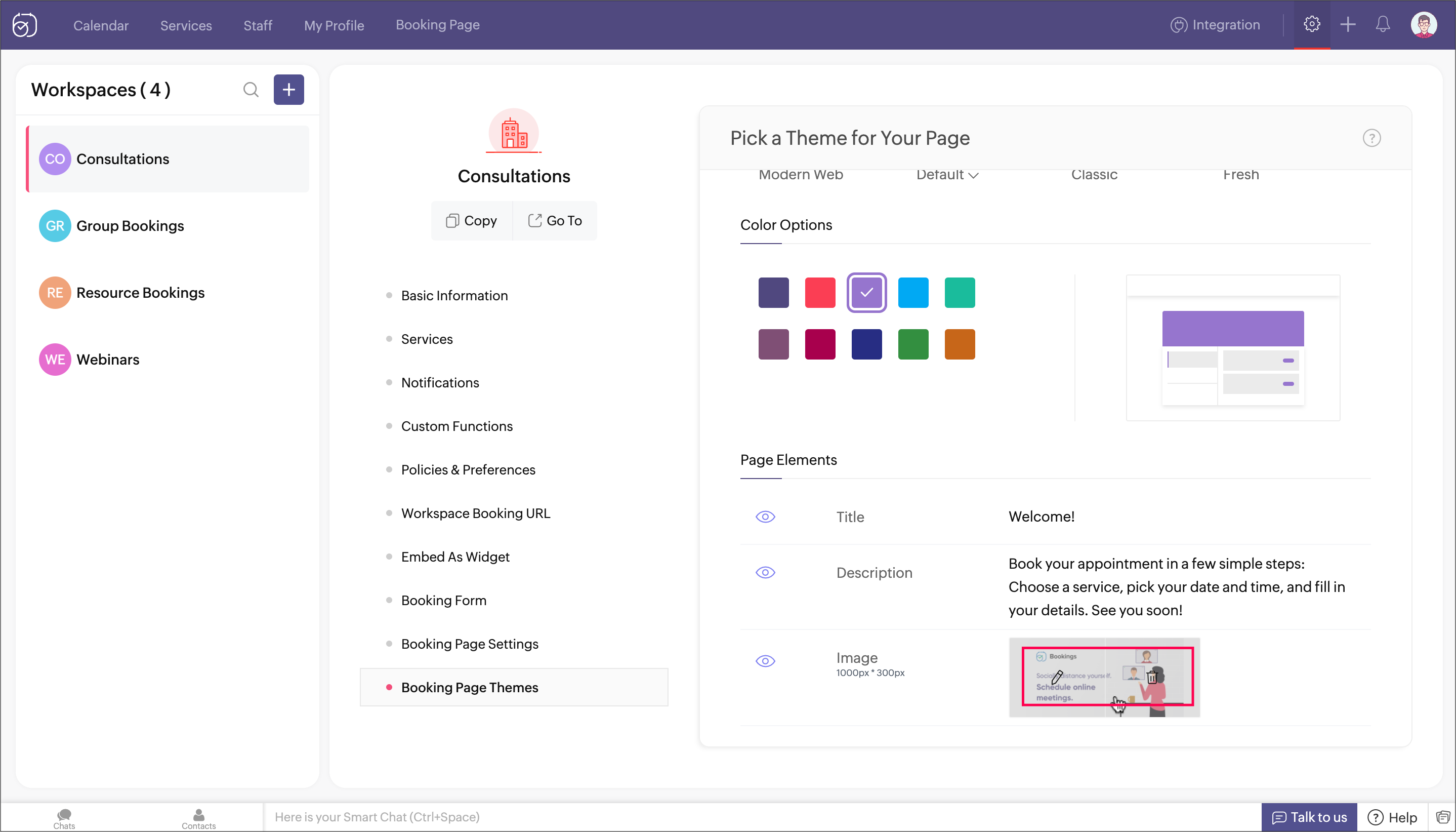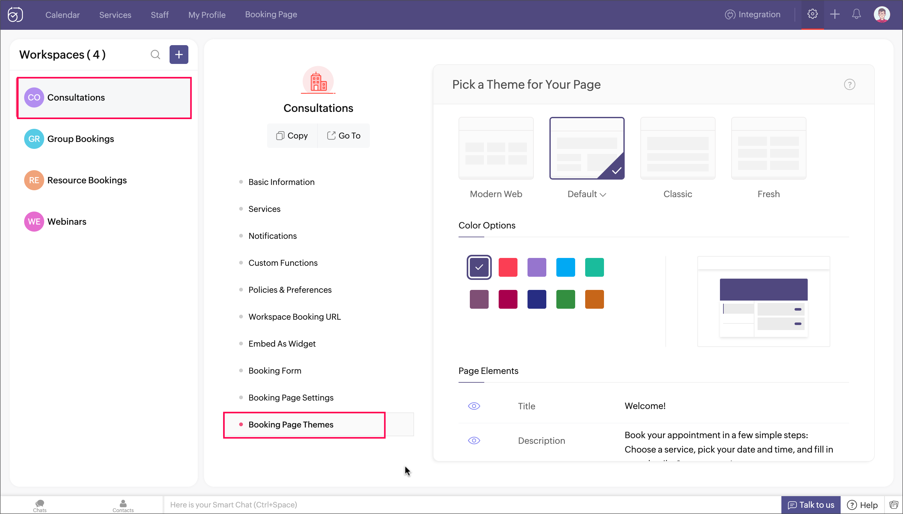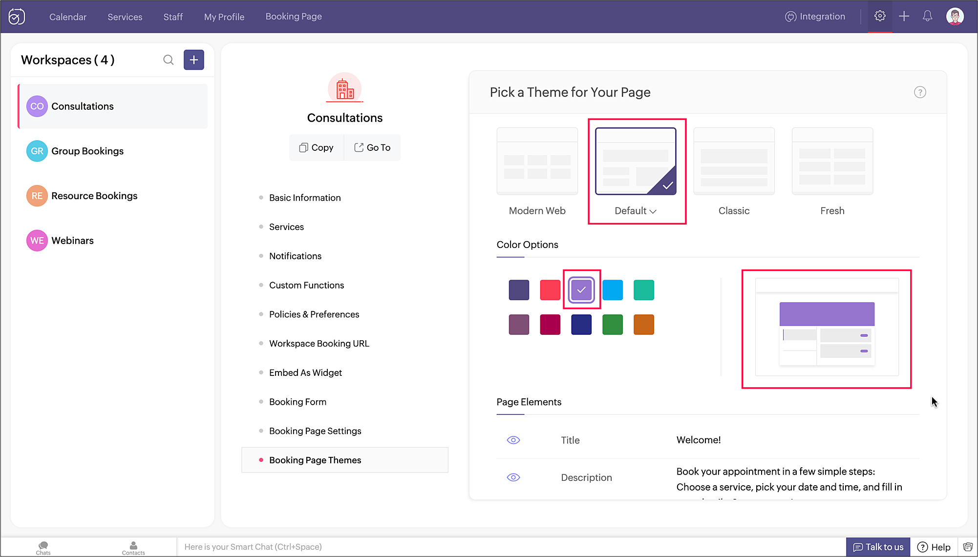 There are four pre-defined themes along with numerous color options to choose from, for your booking page - Default, Modern Web, Classic, Fresh. A preview of the selected theme and color will be shown to help you make a selection. You can also set other elements like a title for the booking page, a description, text for the appointment booking button, and a background image for the booking page header.