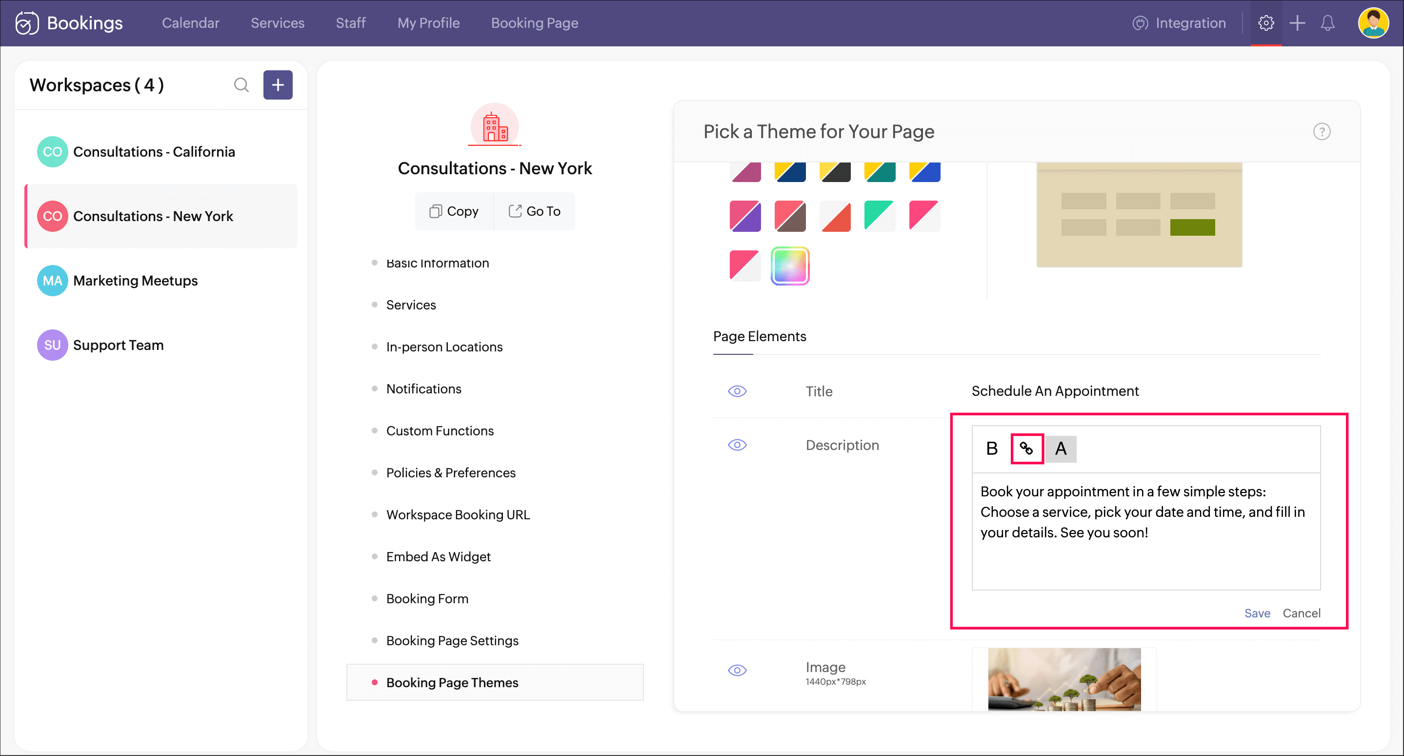 2. Click the required workspace, then click Booking Page Themes.