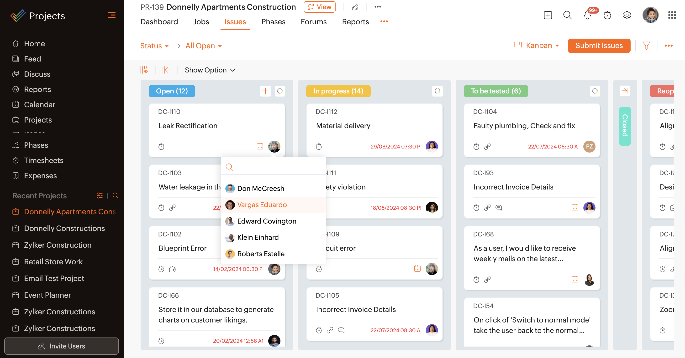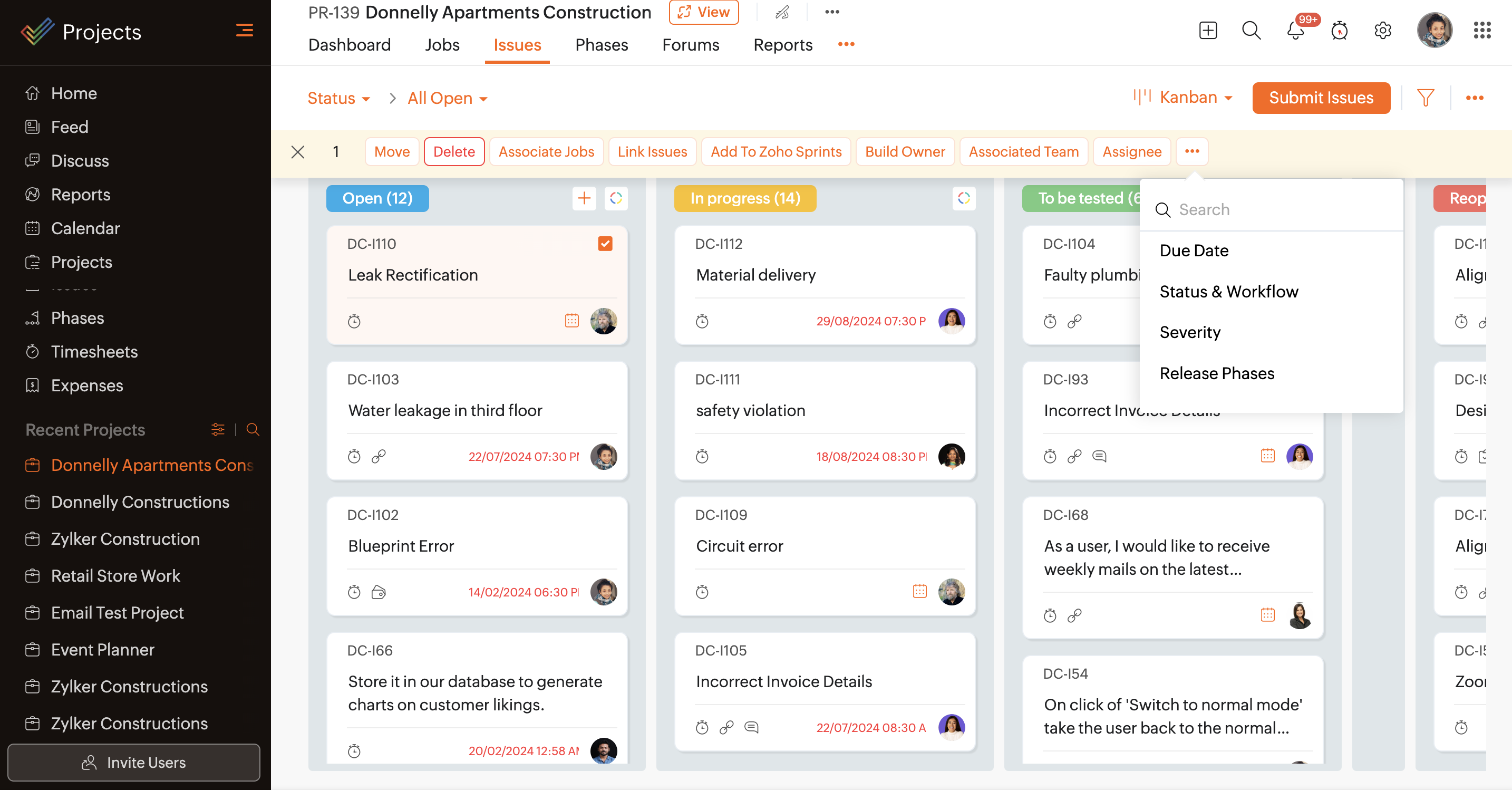 - Change bug status in Kanban cards by clicking the status dropdown and selecting the desired option.