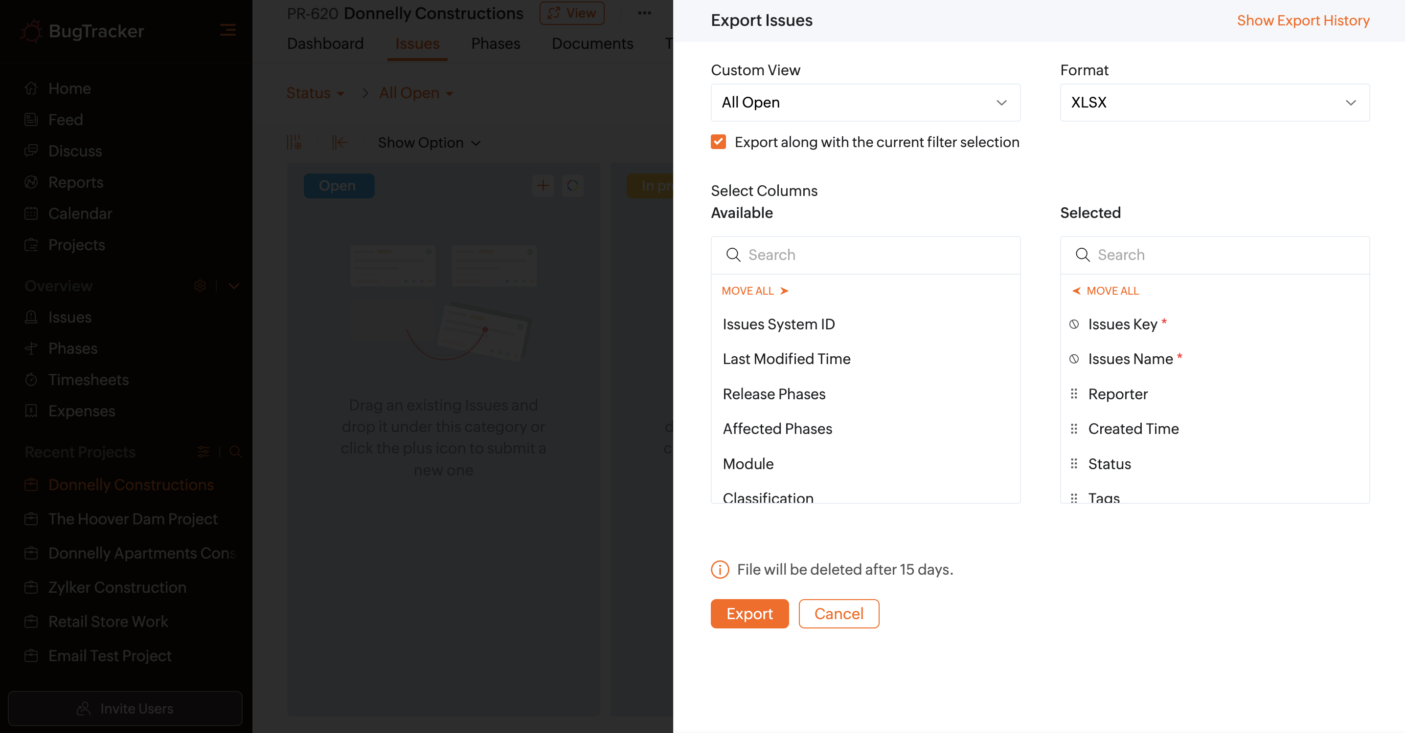 3. Click  and choose the Export Bugs option.