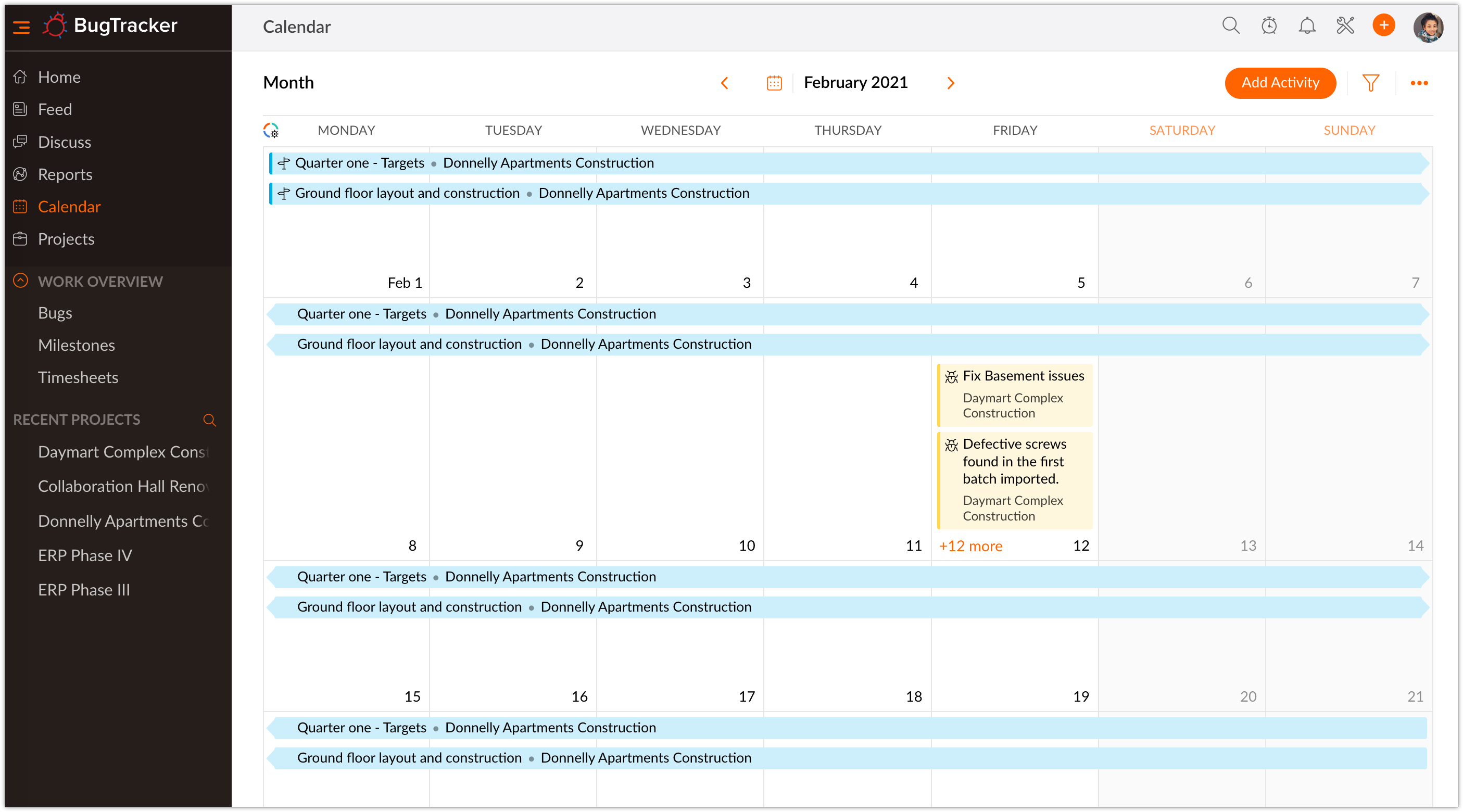 Zoho BugTracker calendar displays on phases, bugs, and events for any time period. In addition, you can also delete the created project events. View Events To view all the project activities like the phases, bugs, and events in your project select ...
