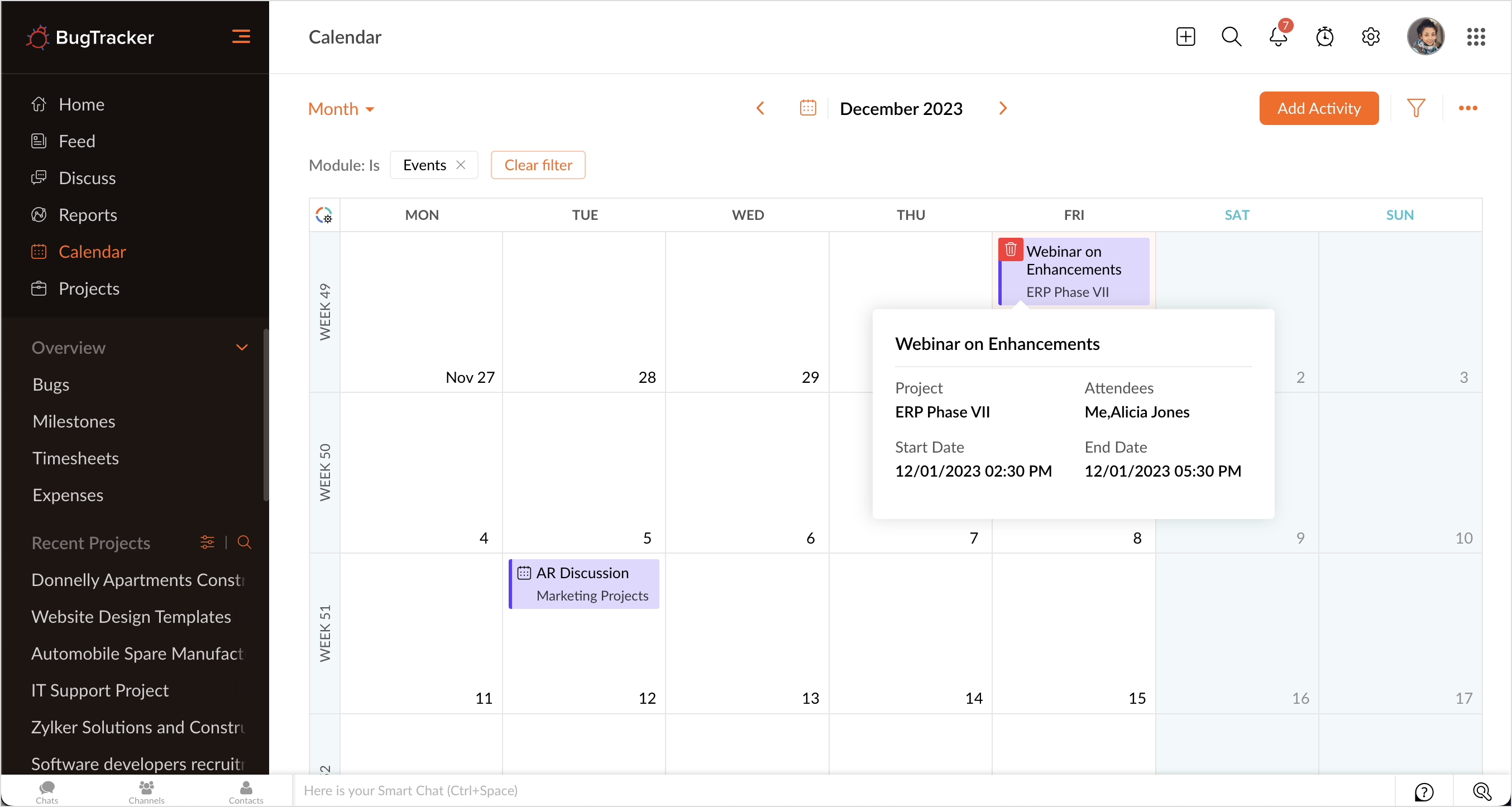 Zoho BugTracker calendar displays on phases, bugs, and events for any time period. In addition, you can also delete the created project events.