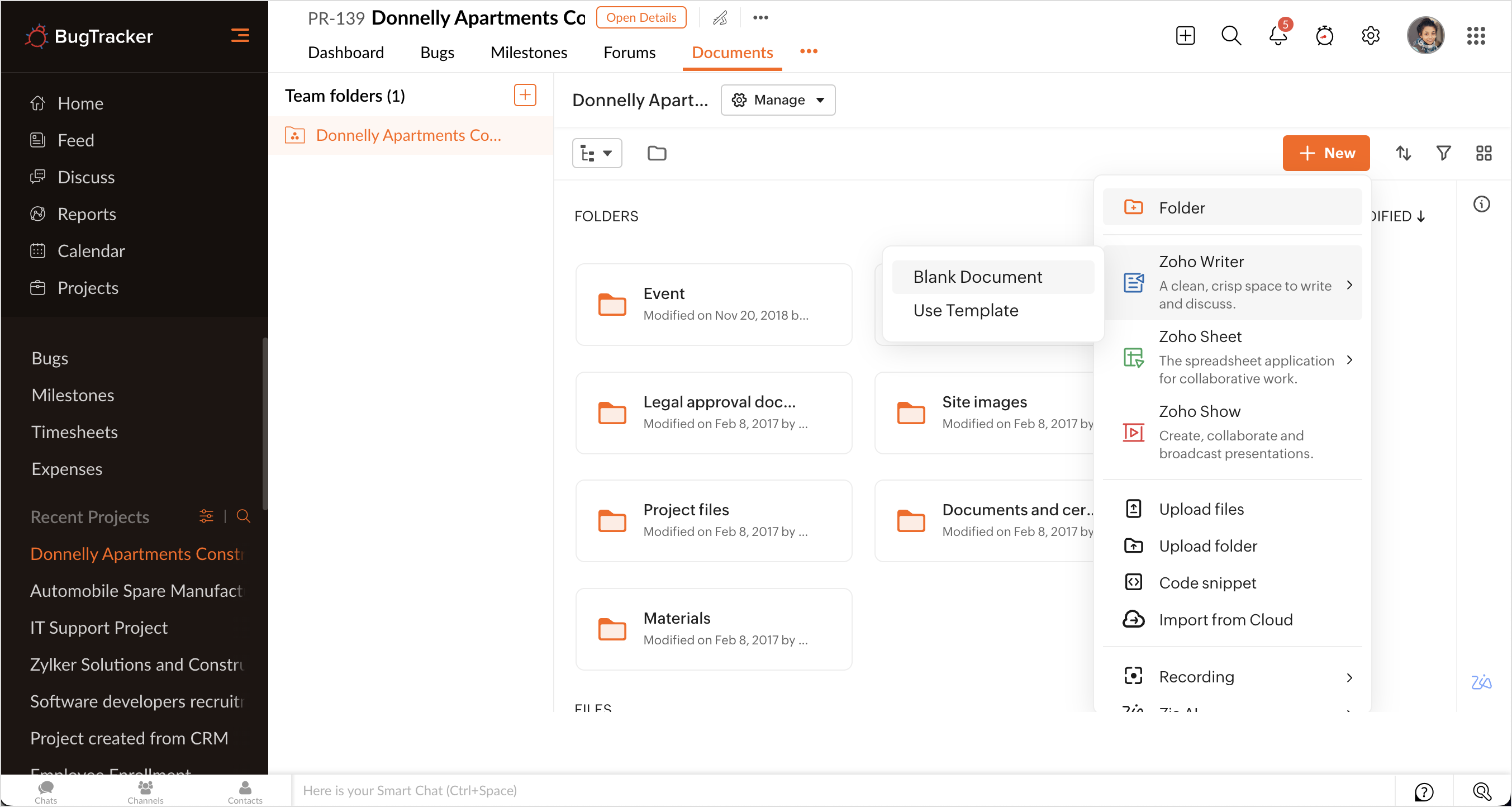 4. Hover over Zoho Writer, choose Blank Document to create without template or choose Use Template if you have any existing templates.