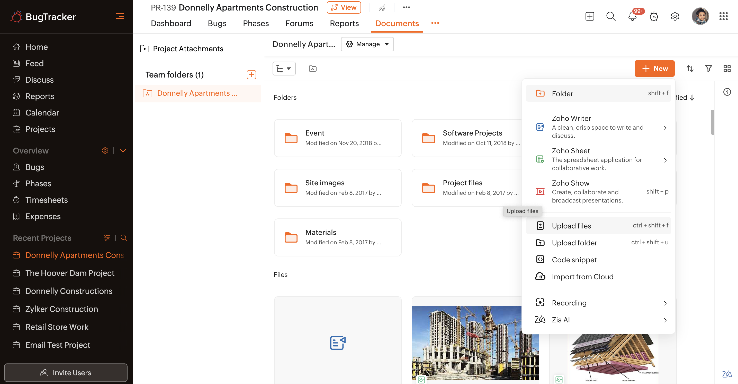 Zoho BugTracker allows you to browse and upload your files from your personal desktop, and cloud services such as Google Drive. You can upload any file type like *.jpg, *.png, *.doc, *.docx, *.ppt, *.xls, *.csv, *.mpeg, *.zip, *.wmv etc.