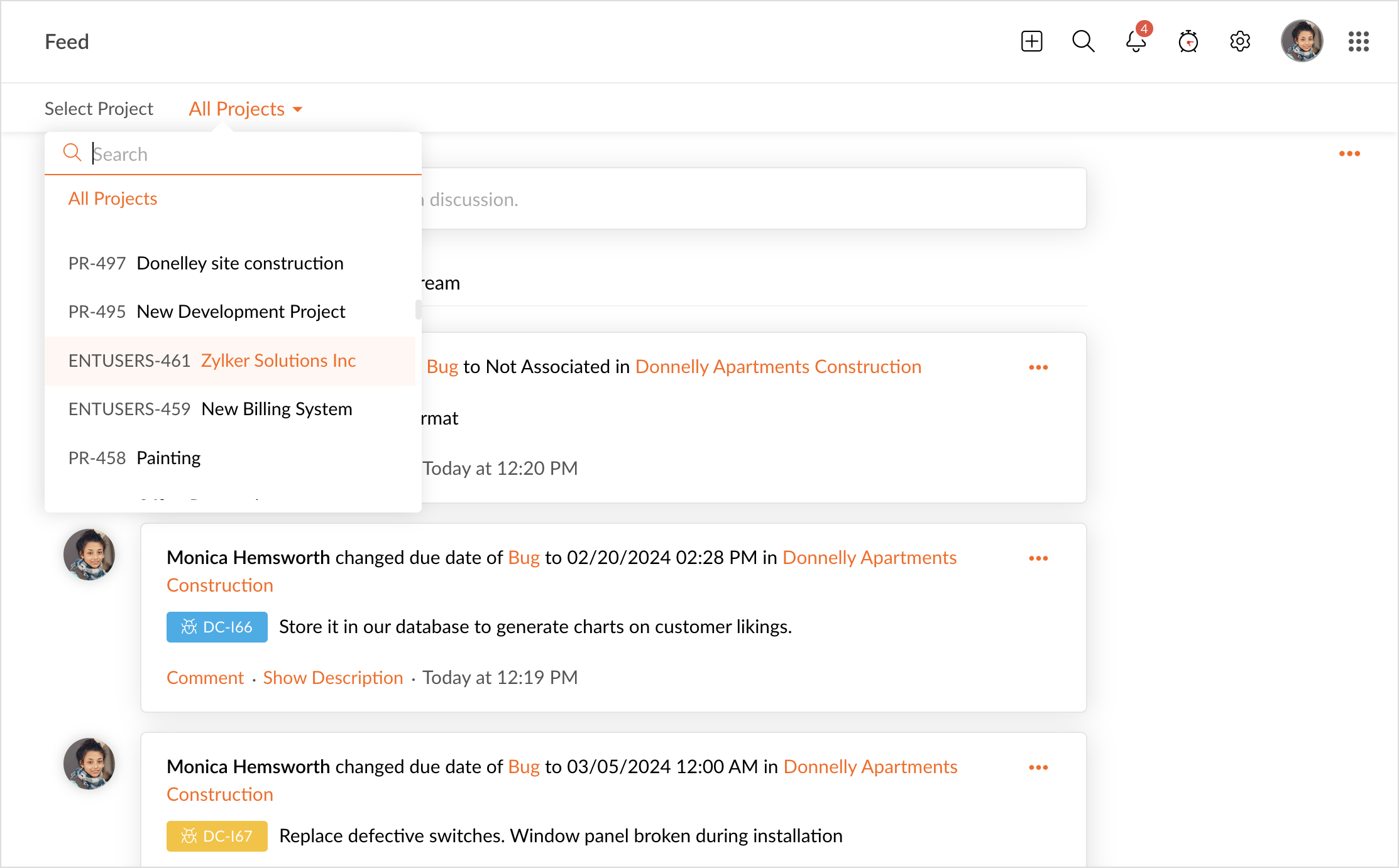 2. By default, the feed is displayed for all projects. You can find them under the Feed section in the main body of the screen.