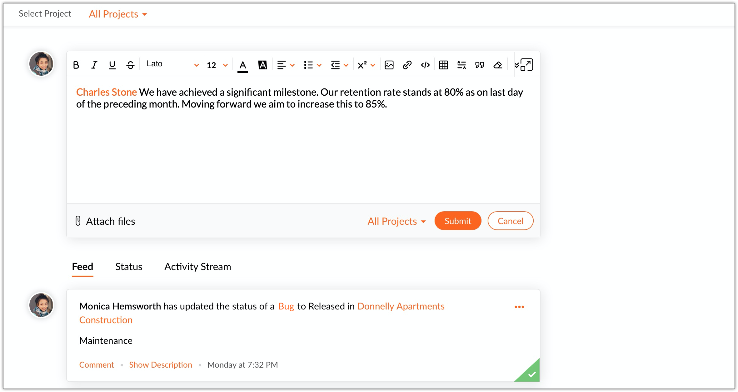 Status is visible to both organization and client users. If a specific project is selected, only users who are a part of the project can view the status. If the status is posted to All Projects, it can be viewed by all the users in the portal (including client users working on various projects).