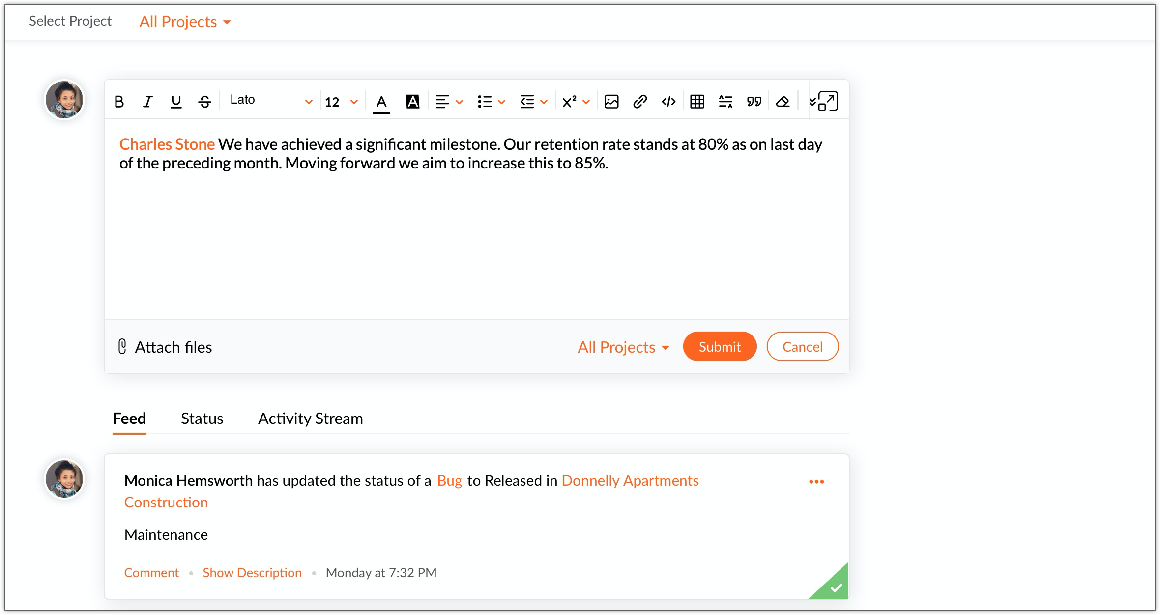 Quickly share an update or information using Status. Type @ to view user picklist. The selected user will be mentioned in the status and receive a notification. Type# and the first few characters of task or issue name. The picklist will display issues and tasks matching the characters. Selecting them will tag the task or issue on the status.