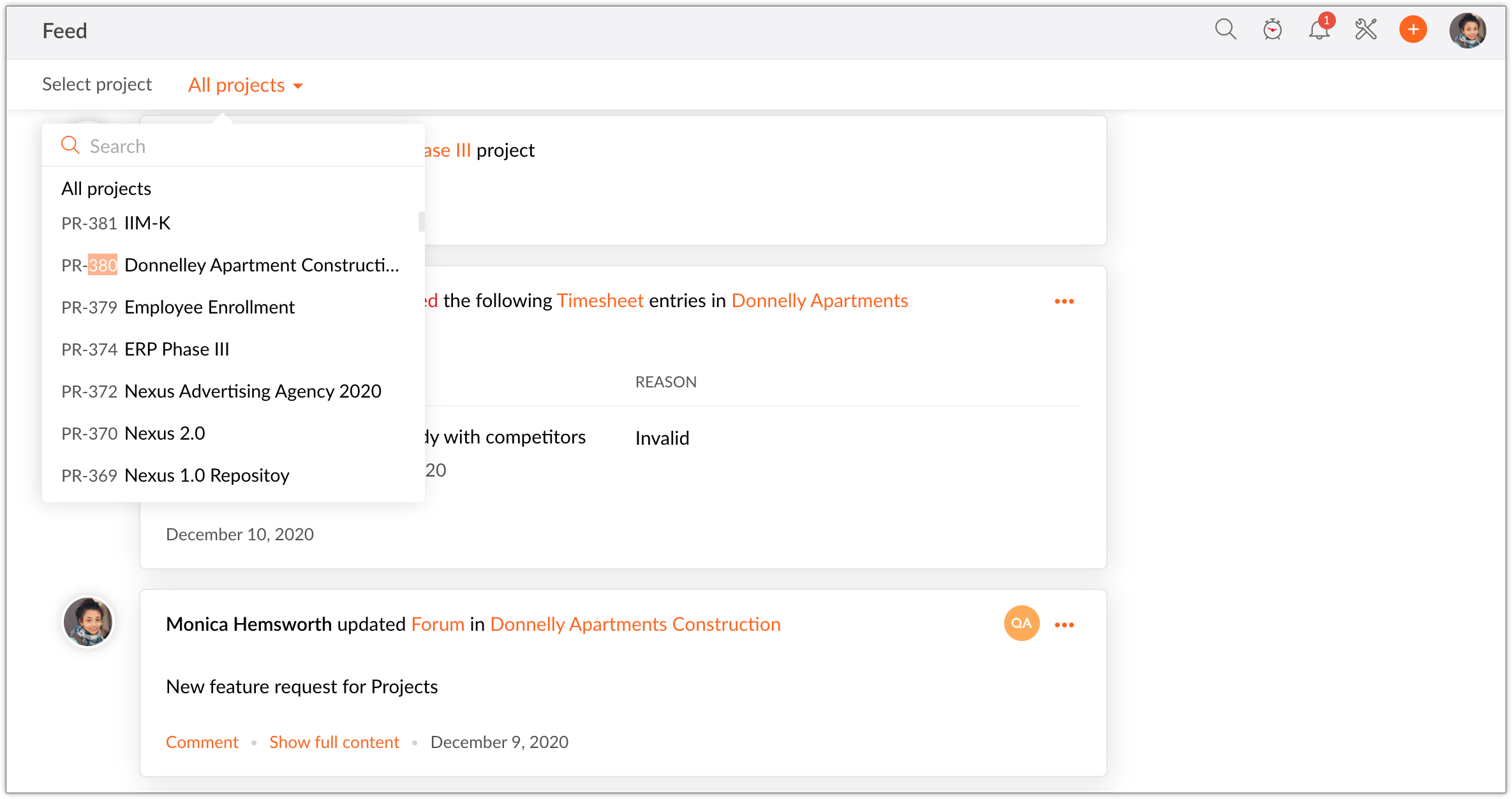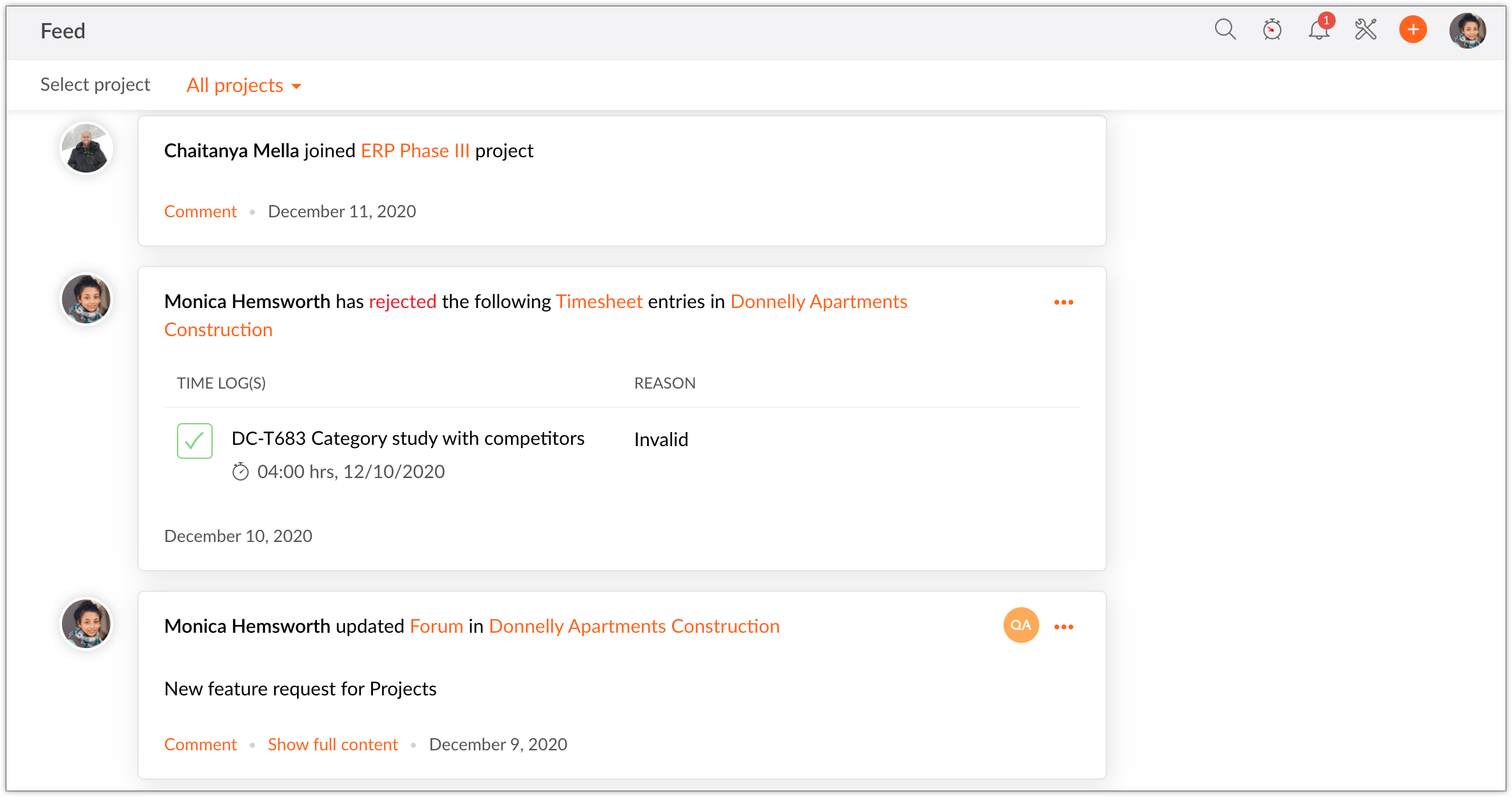 Say you manage a team and you've got a lot on your plate to address everyday. Tracking things might not always be easy when you handle a big team. At this point you might need an interface that shows the latest updates from your team members with the details. Our Feed helps you manage these notifications with ease.