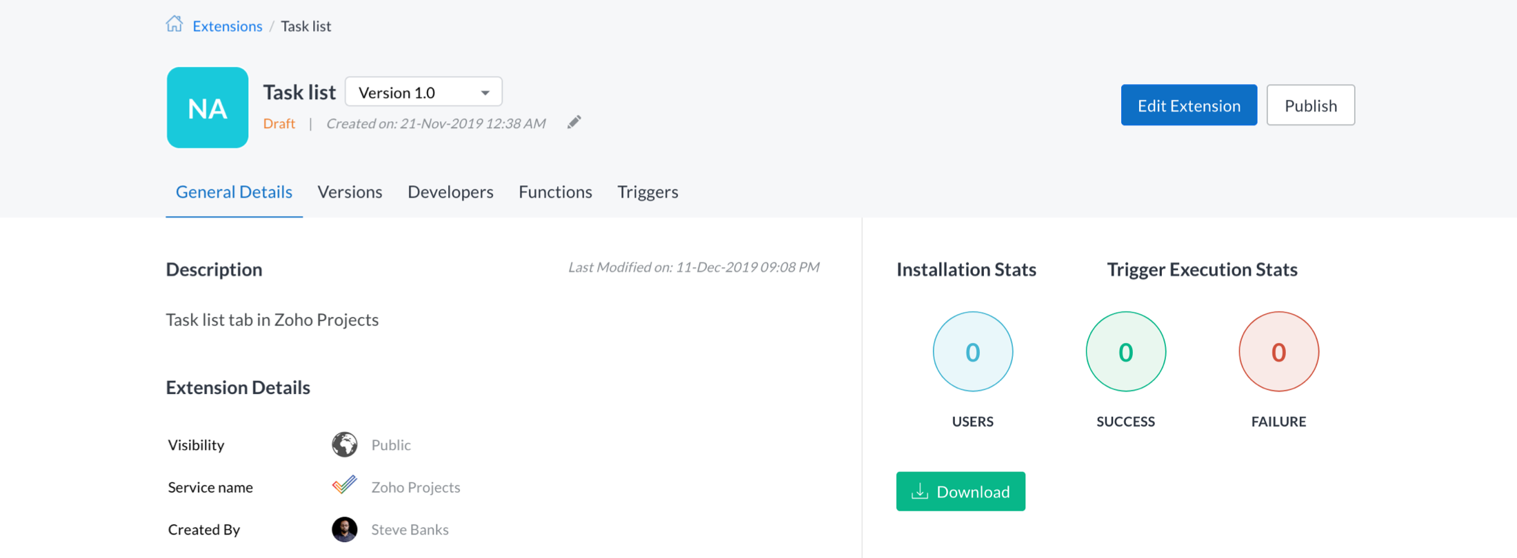 Our engineers will review the extension and get back to the developer with their feedback. When it passes their validation, it will be uploaded by us to Zoho Marketplace.