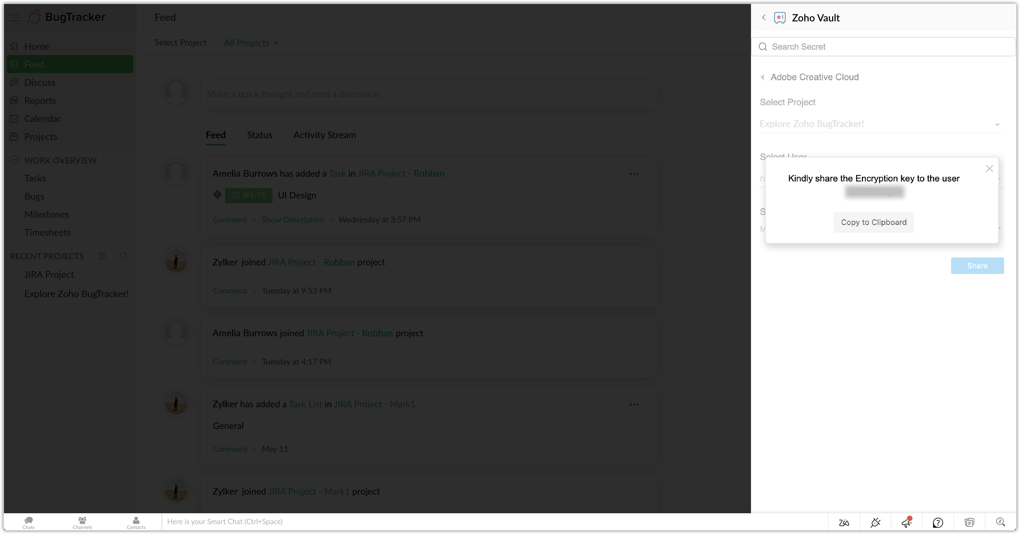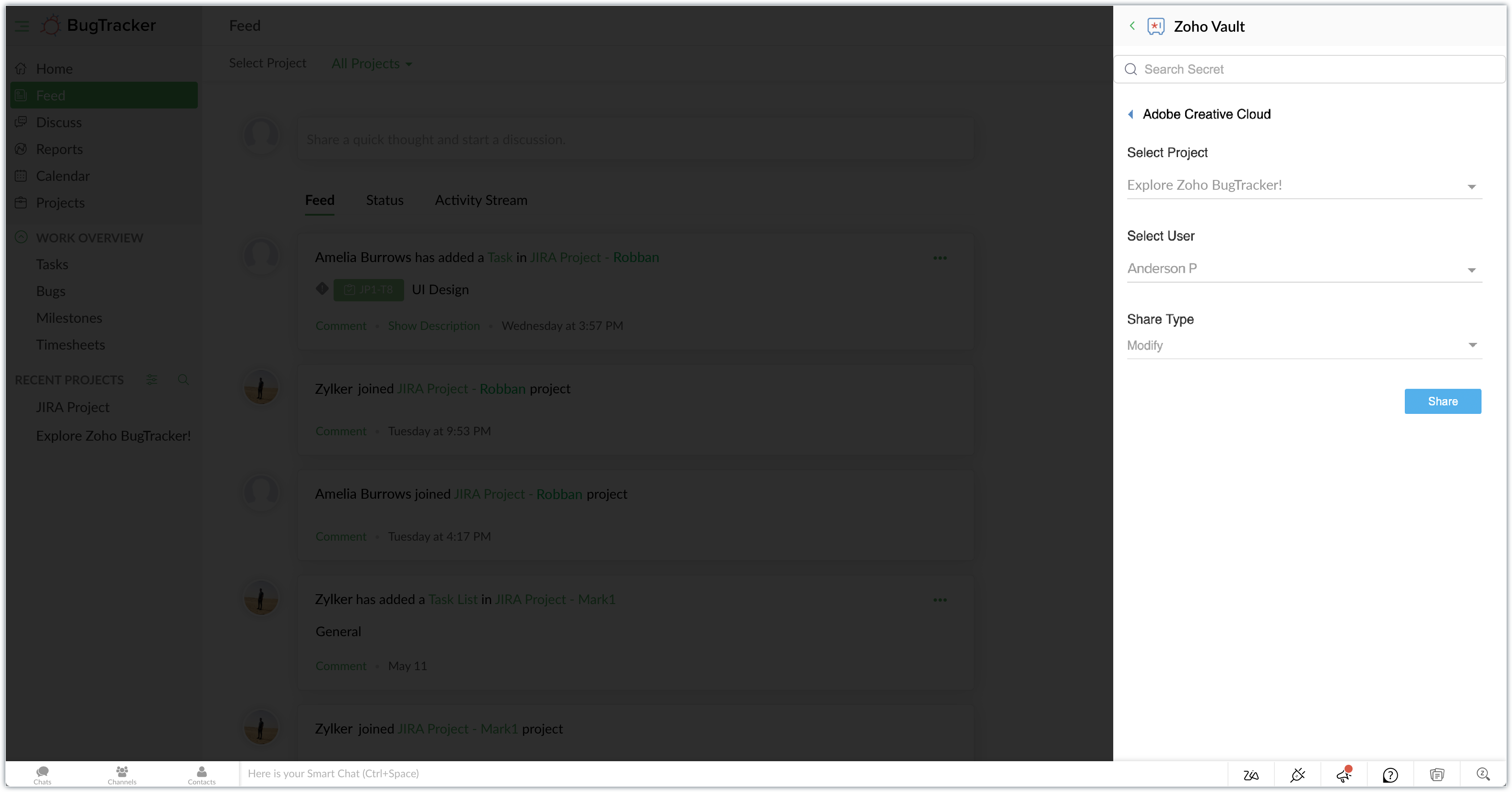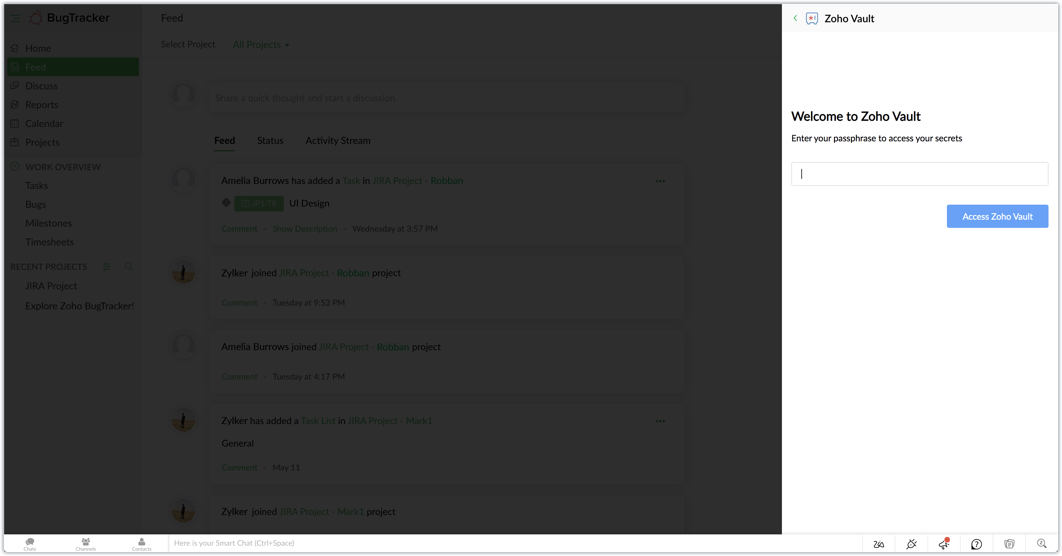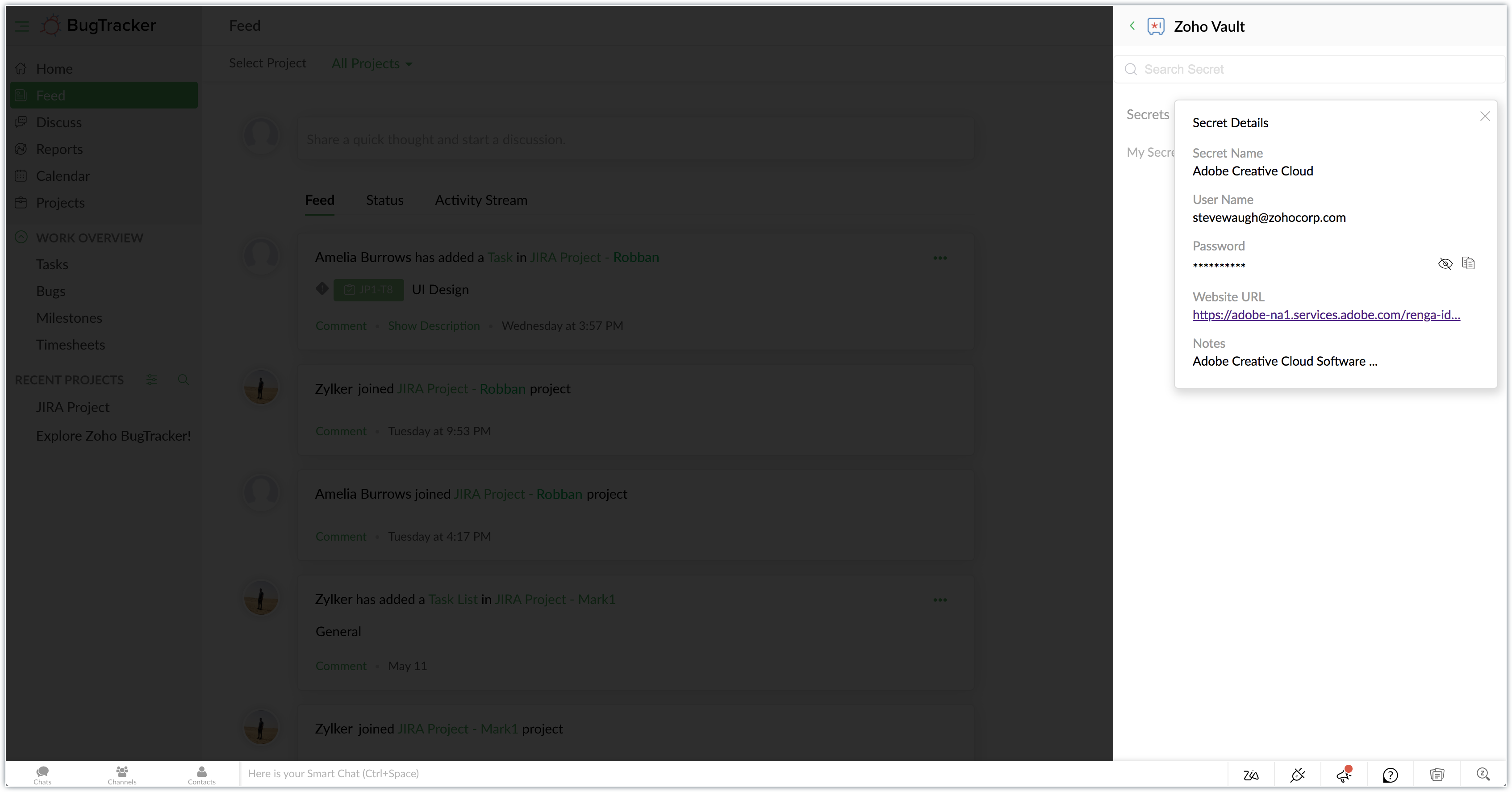 The Zoho Vault extension for Zoho Bugtracker enables you to share passwords with your contacts and third-parties while using different levels of access permissions. All you need to do is enter your Zoho Vault master password to access your passwords and other confidential data inside Zoho Bugtracker.