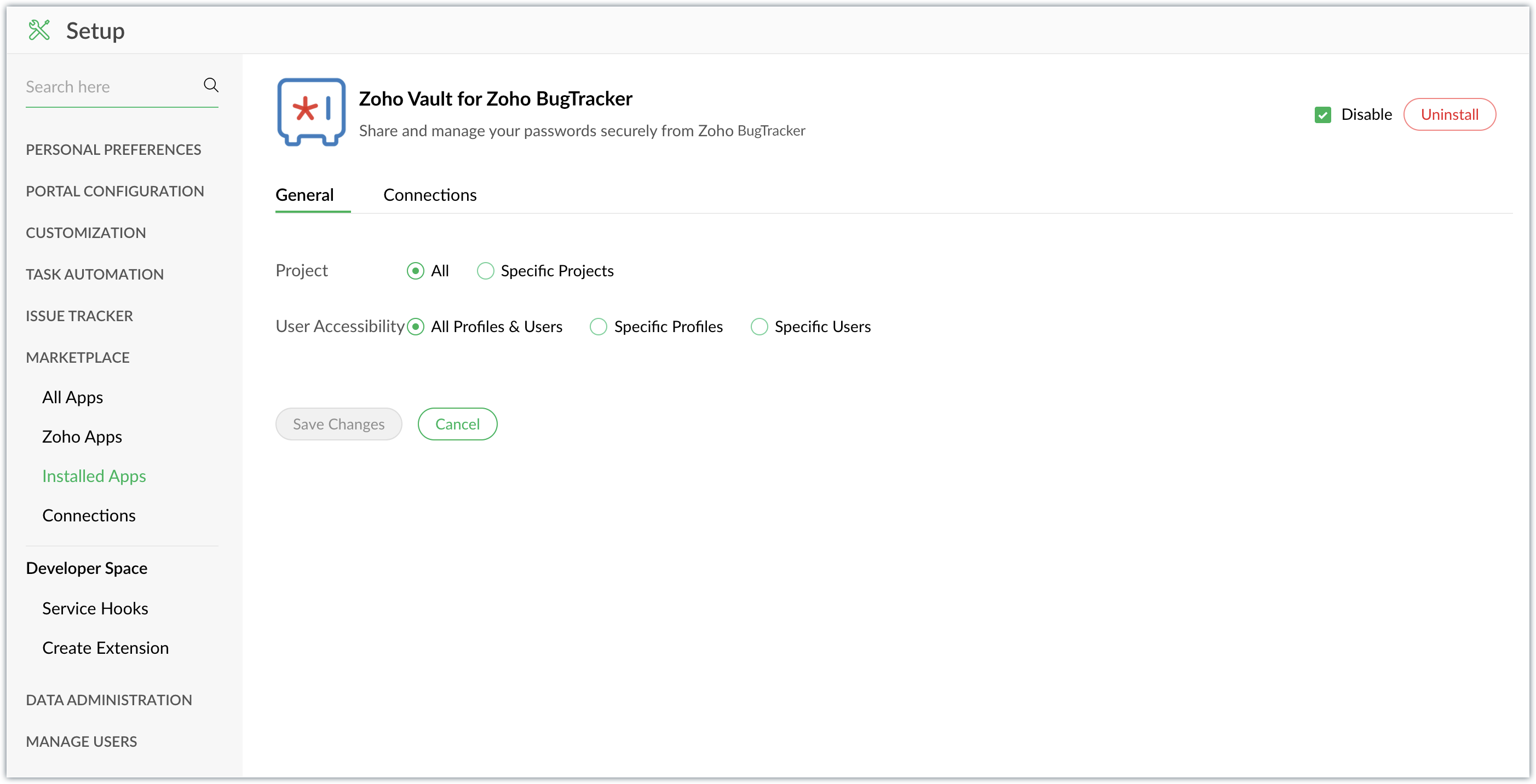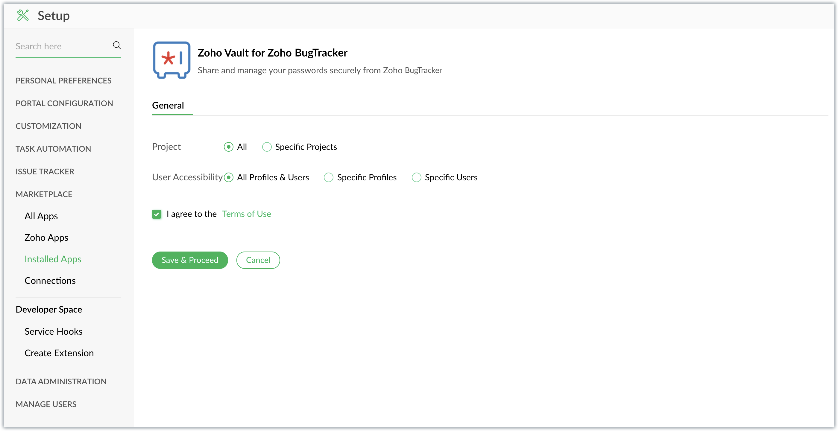 The Zoho Vault for Zoho Bugtracker extension can be installed either from the Zoho Marketplace or from within the Zoho Bugtracker account.