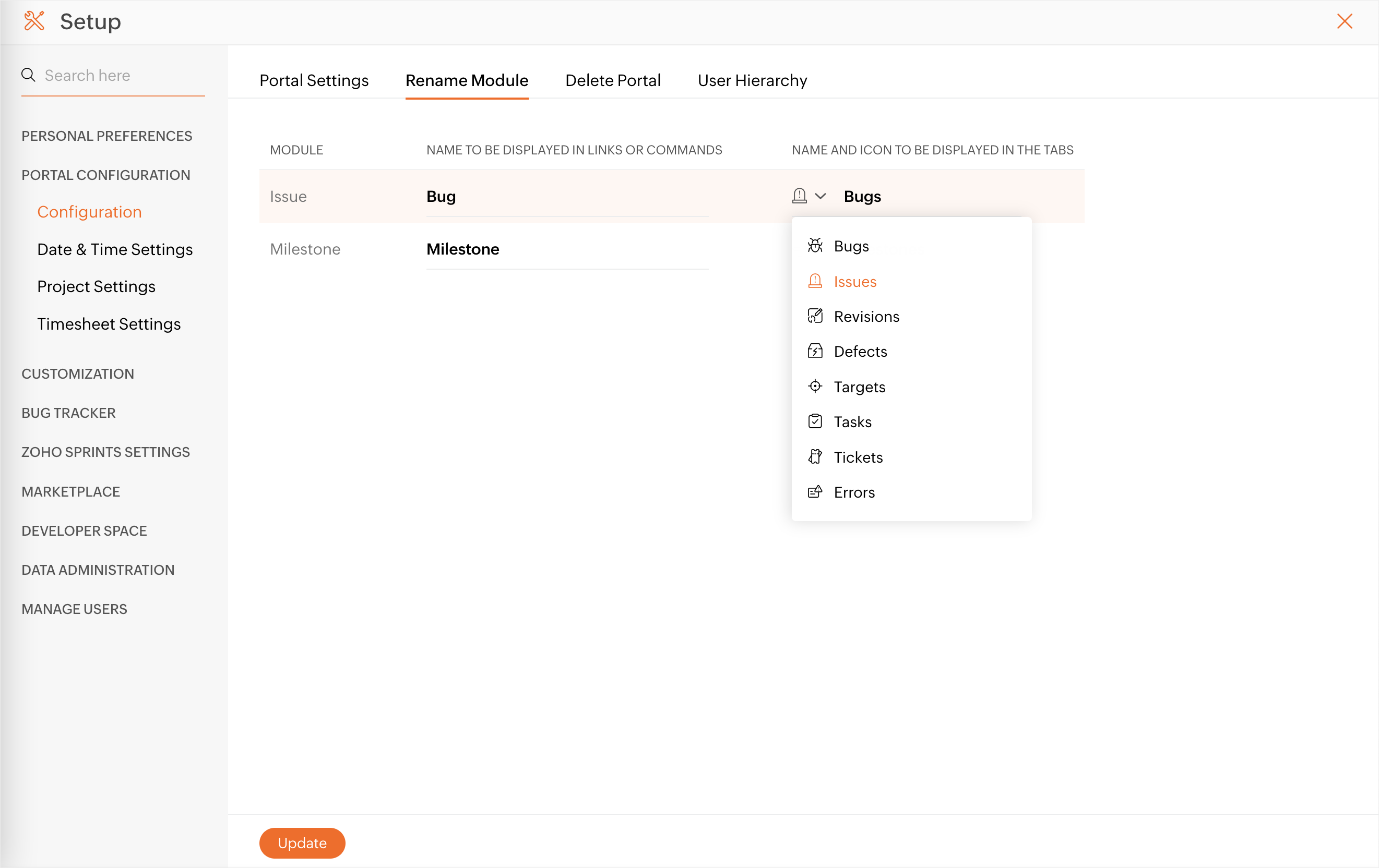 Can I rename the bugs tab and change the bugs icon? | Online Help | Zoho BugTracker