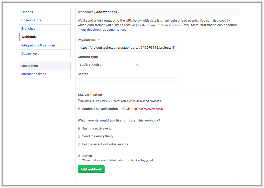 You must copy the Project ID and Token value in Zoho BugTracker to map the specific project with Github.