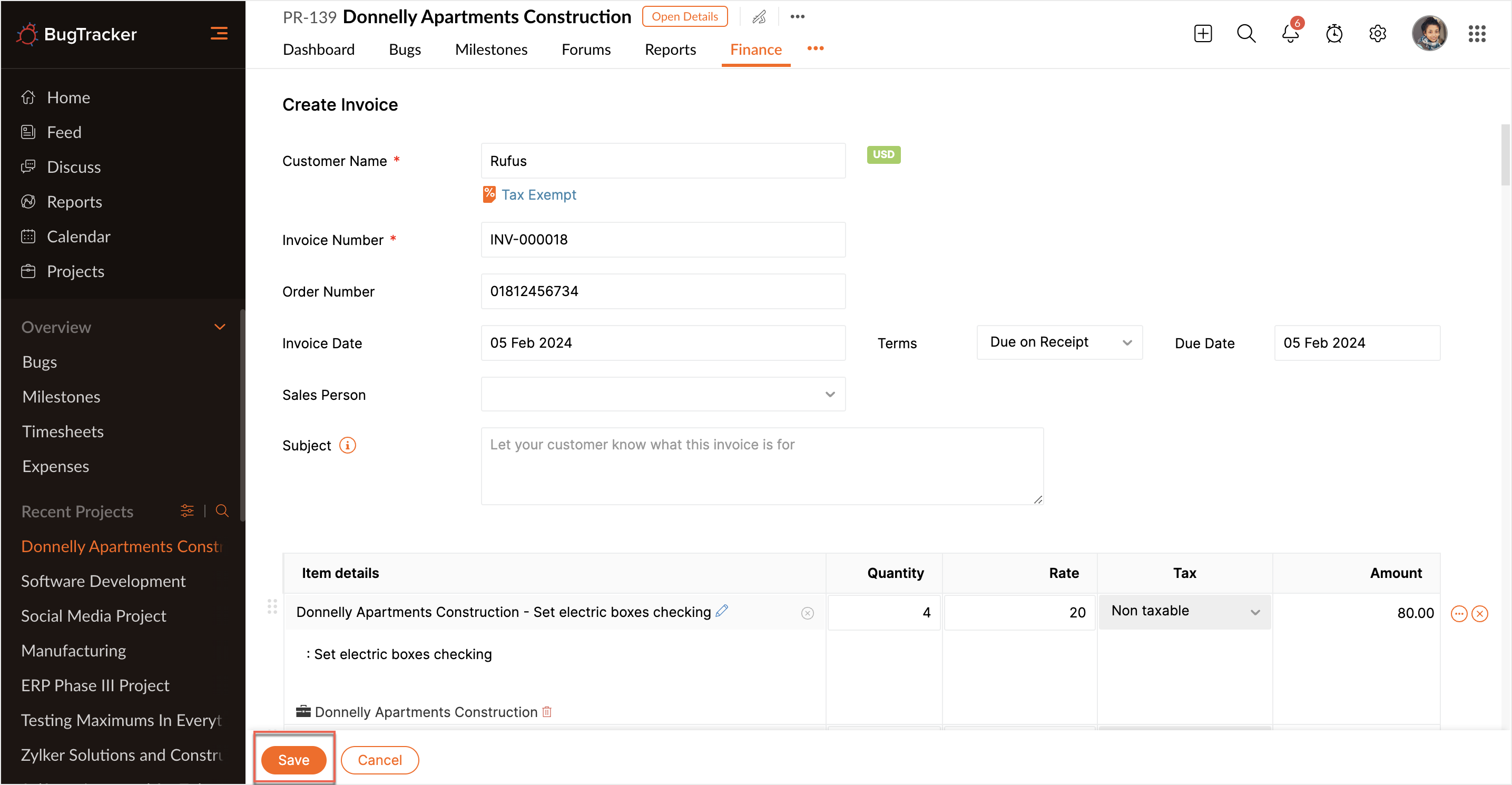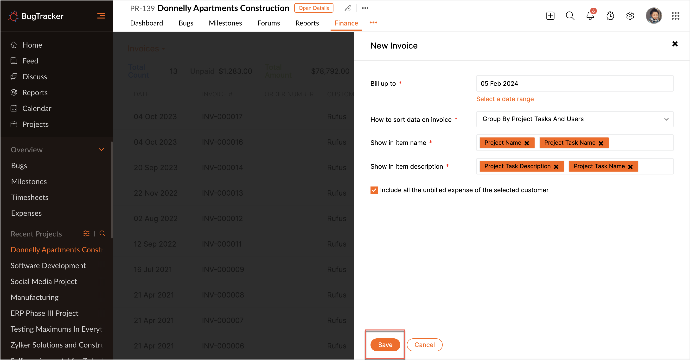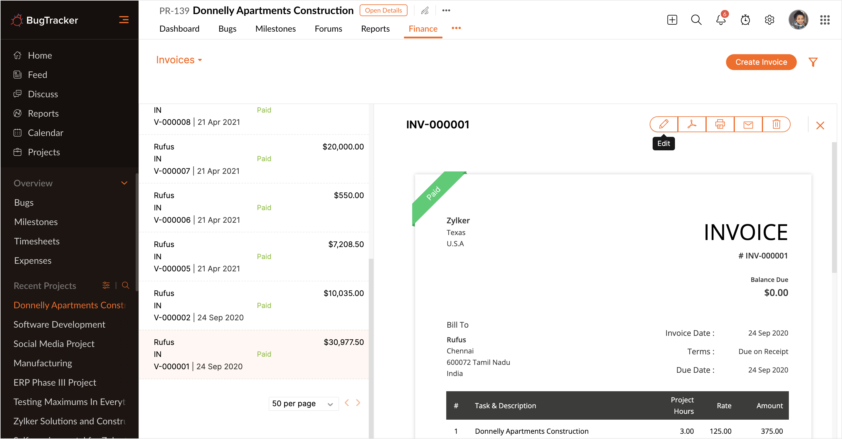 All the invoices created are saved in the Finance tab. Select the required invoice to edit or delete. Click to edit the invoice details and then click Save to update the changes.