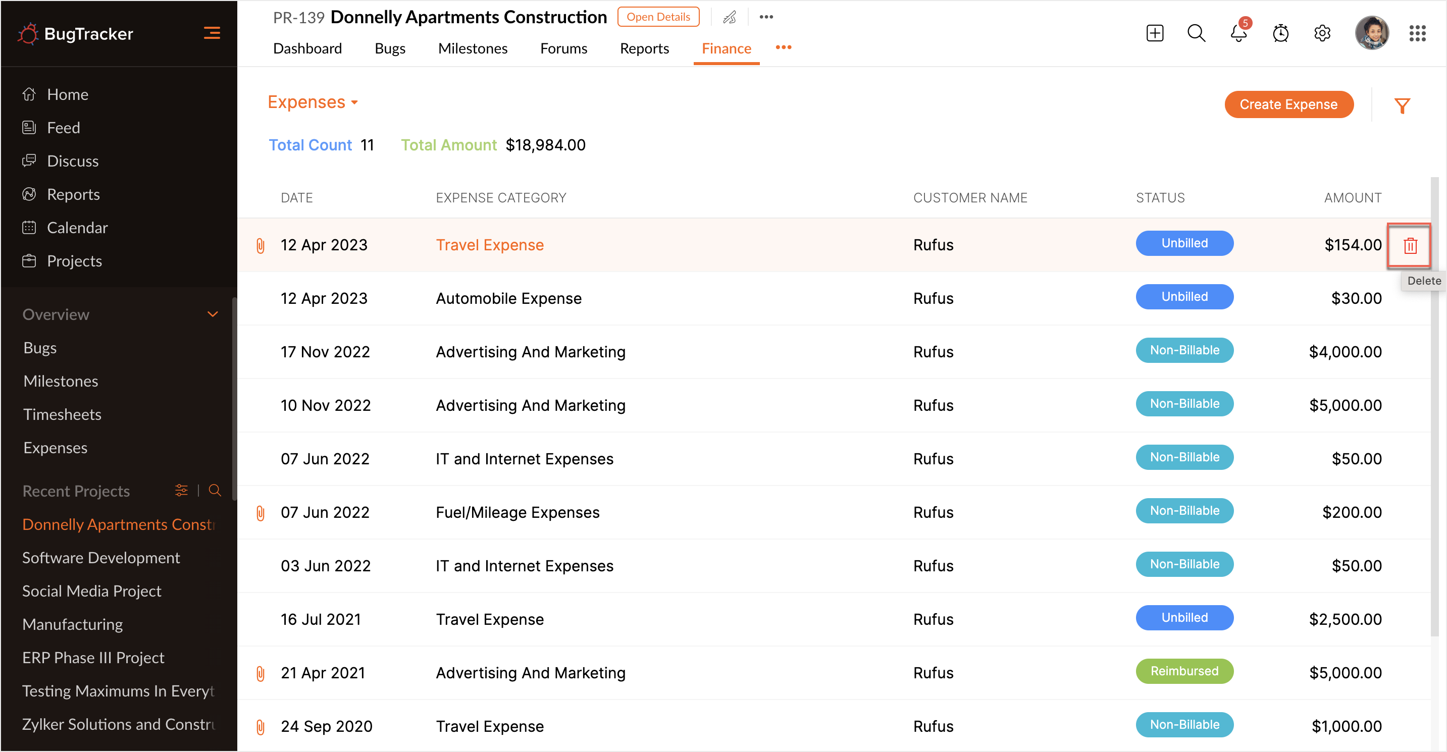 All the expenses recorded are saved in the Finance tab. Click on the required expense to edit or delete. Click to edit the expense details and then click Save to update the changes or hover over the required expense and click
