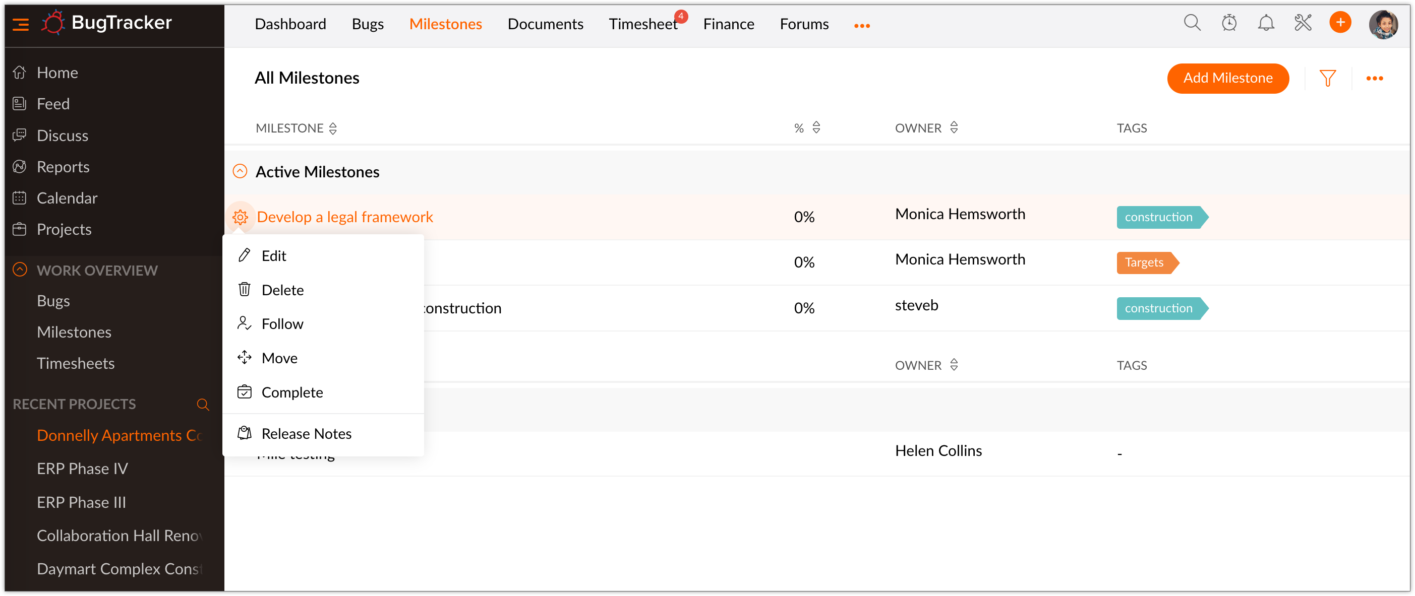 All current, upcoming, and overdue milestones are listed under Active Milestones category.