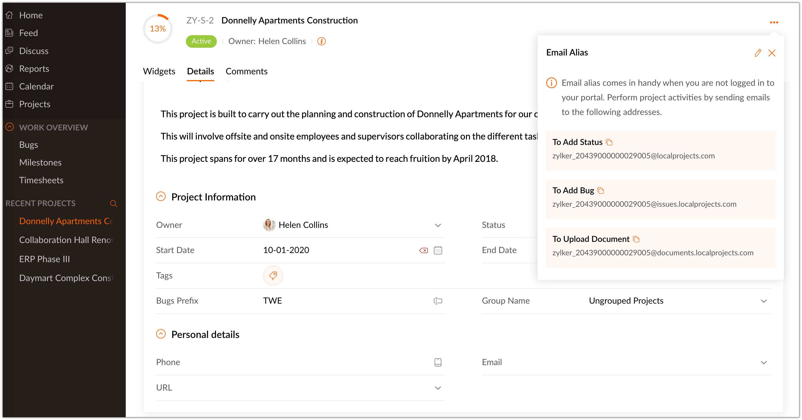 From the dashboard, you can also edit the project information and get the email Alias to add work items from your registered email address to your Zoho BugTracker portal.