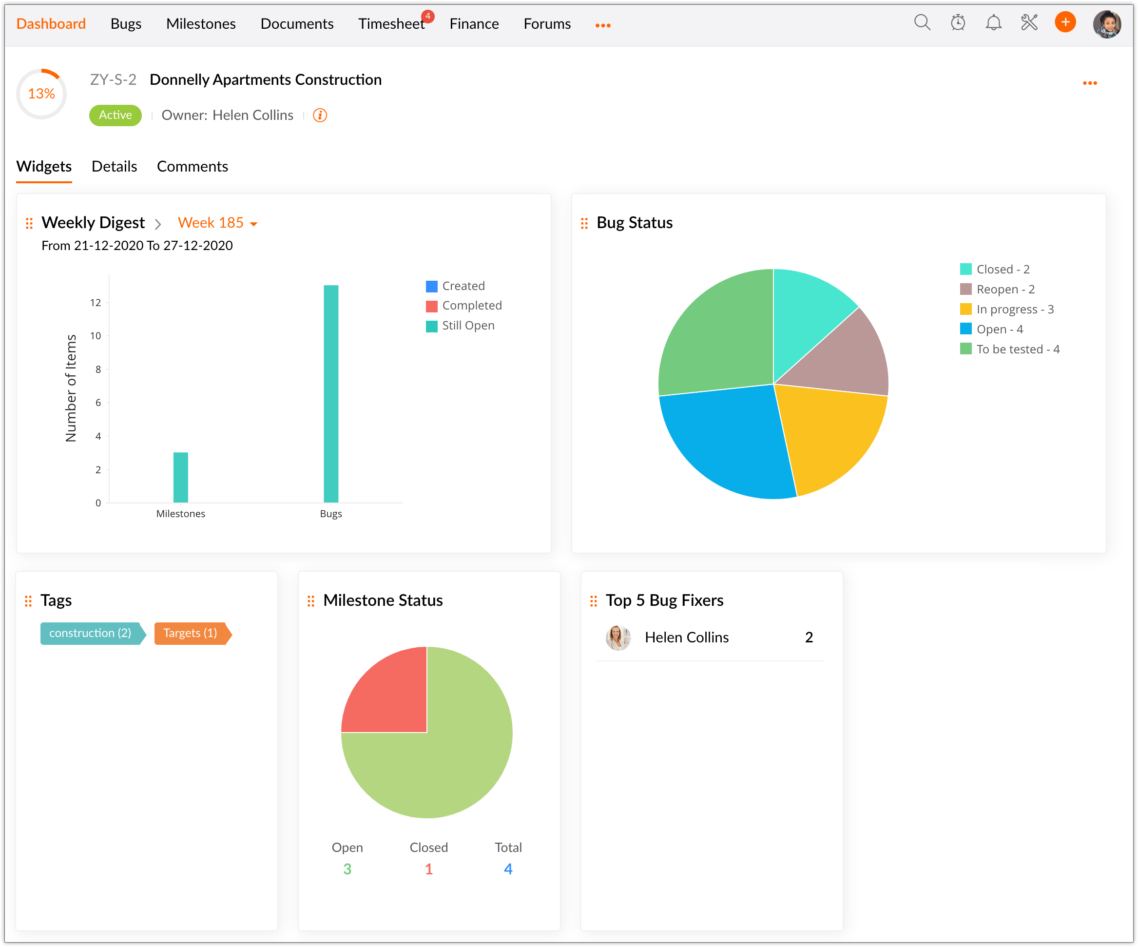- Weekly Digest - Get the status of milestones and bugs in the current week from this widget. Select a week from the drop-down to view its status. You can also select a different view from the lot in the upper right part of the widget.