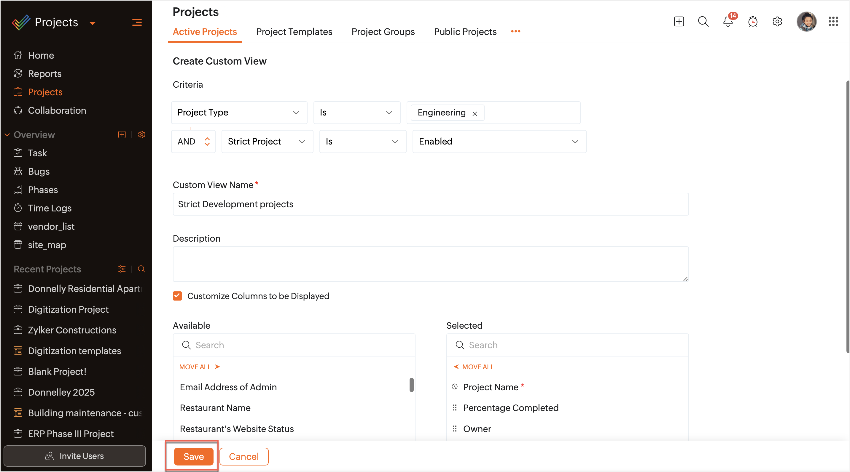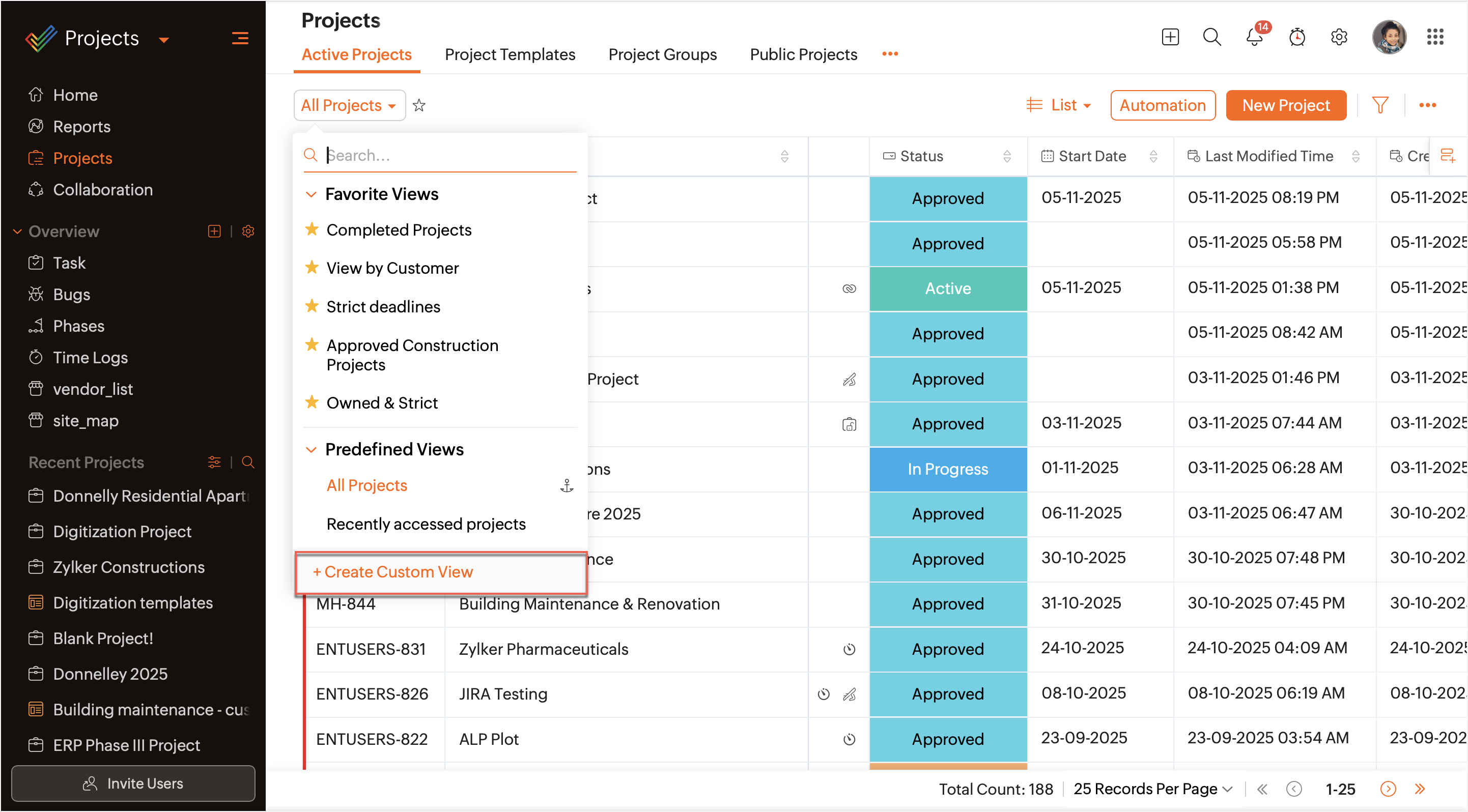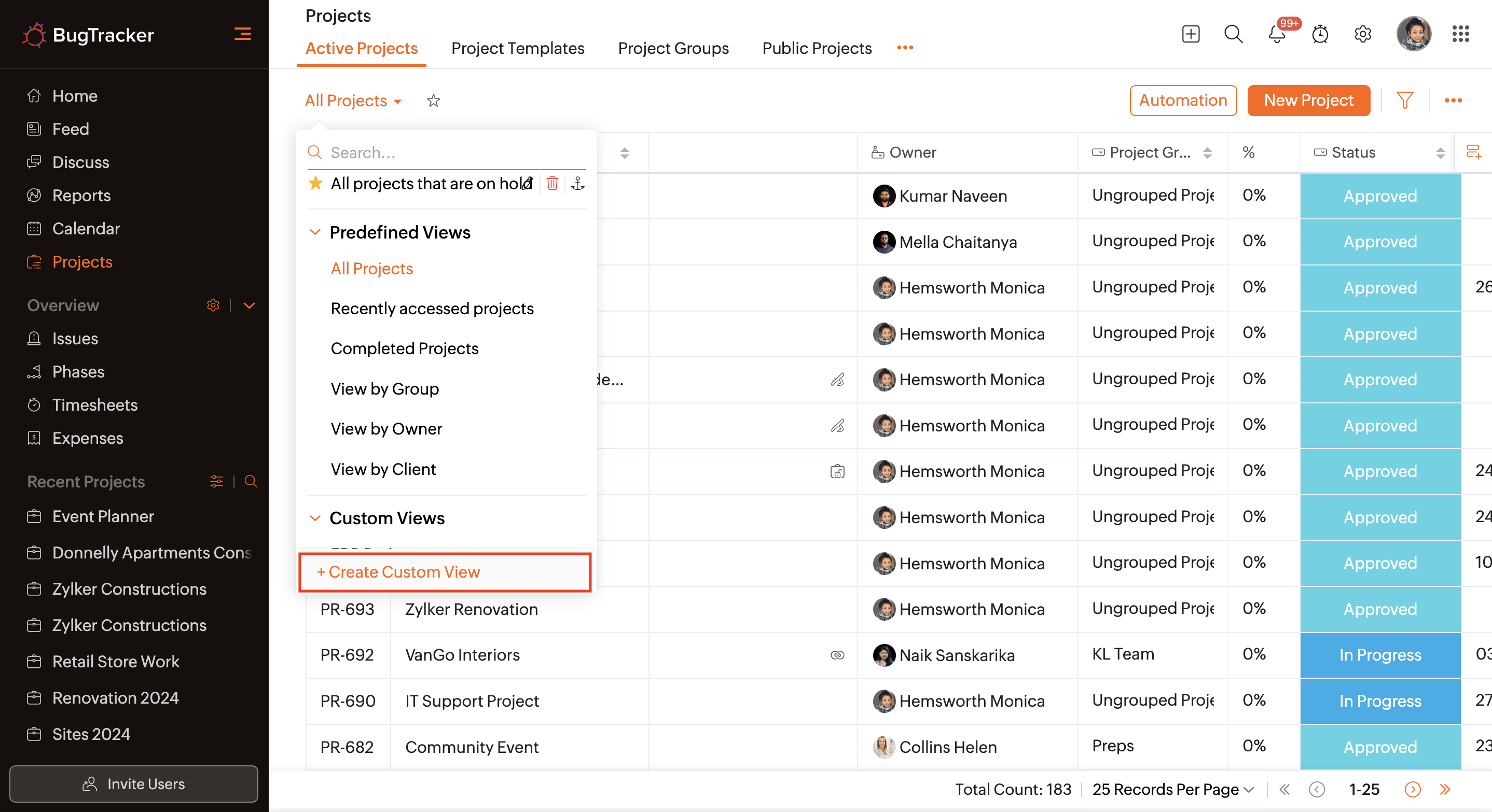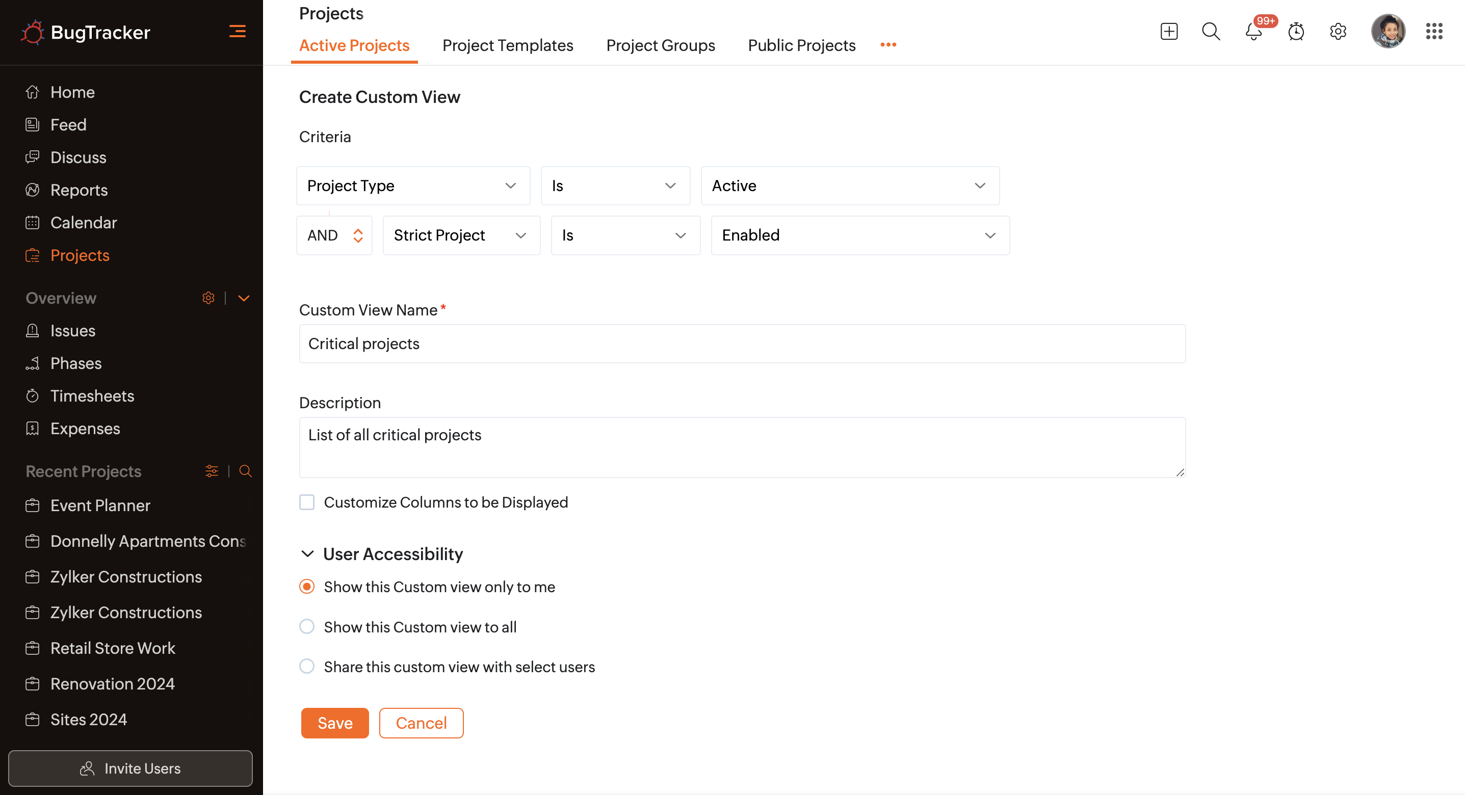 In addition to the predefined views, users can now create their own custom views for projects. Users can customize projects list view based on specific criteria by applying filters. These custom views can be marked favorite by clicking the icon.