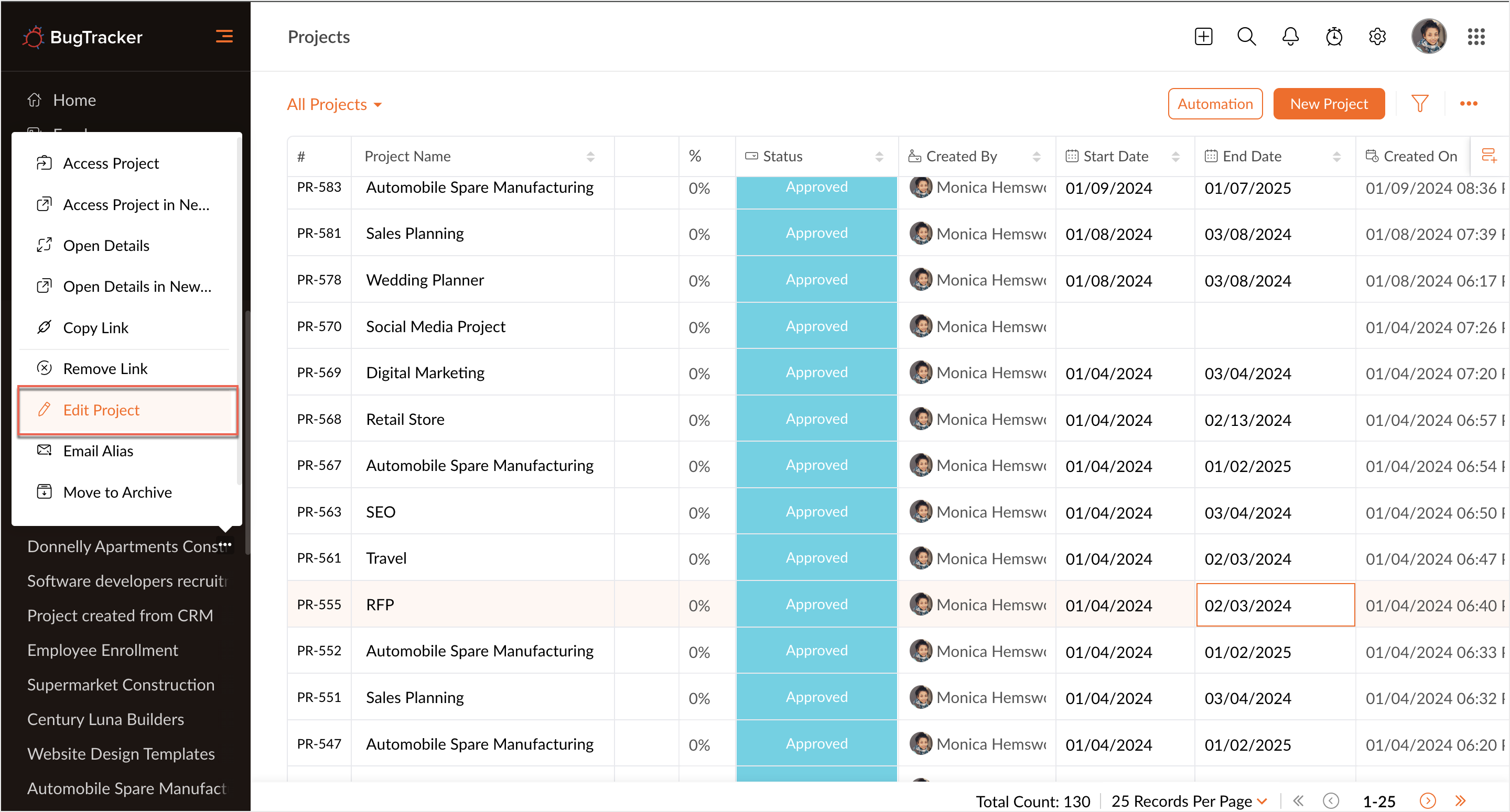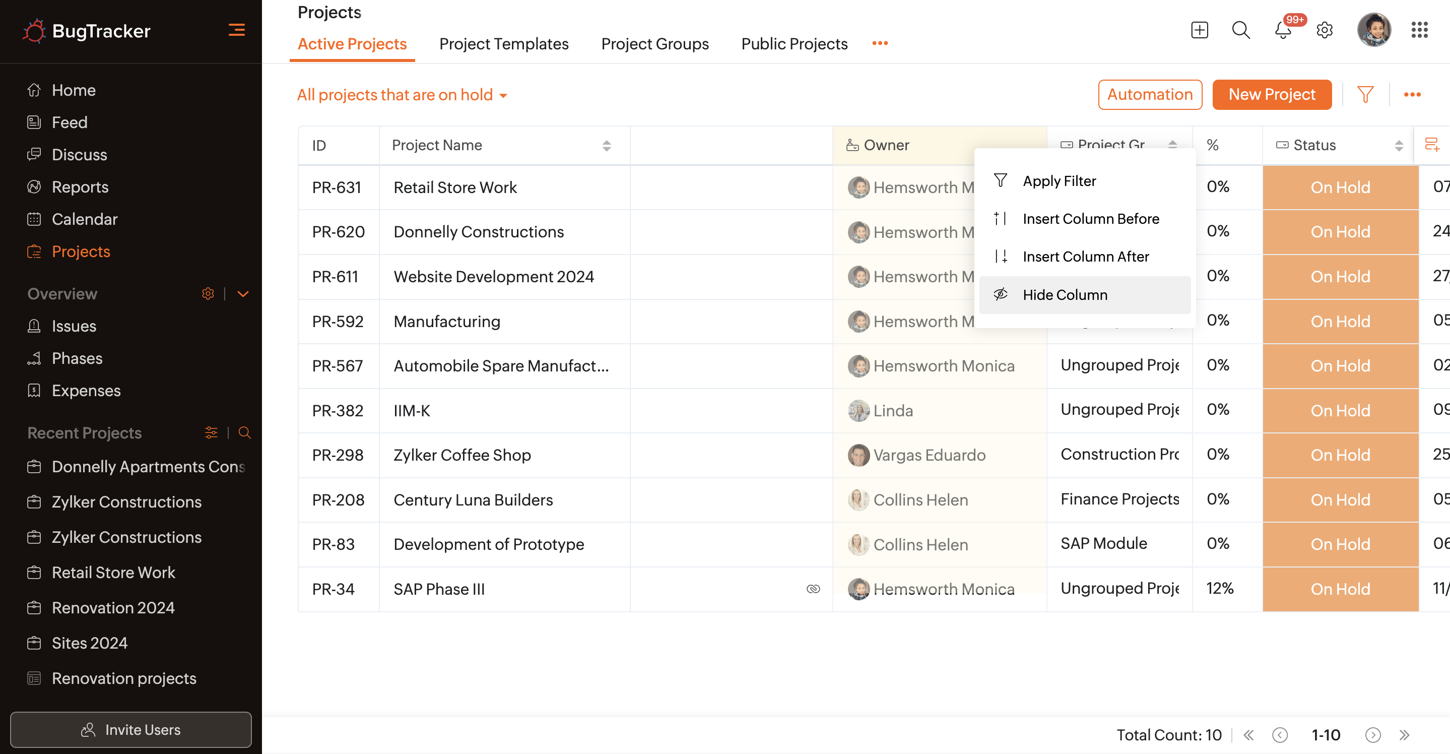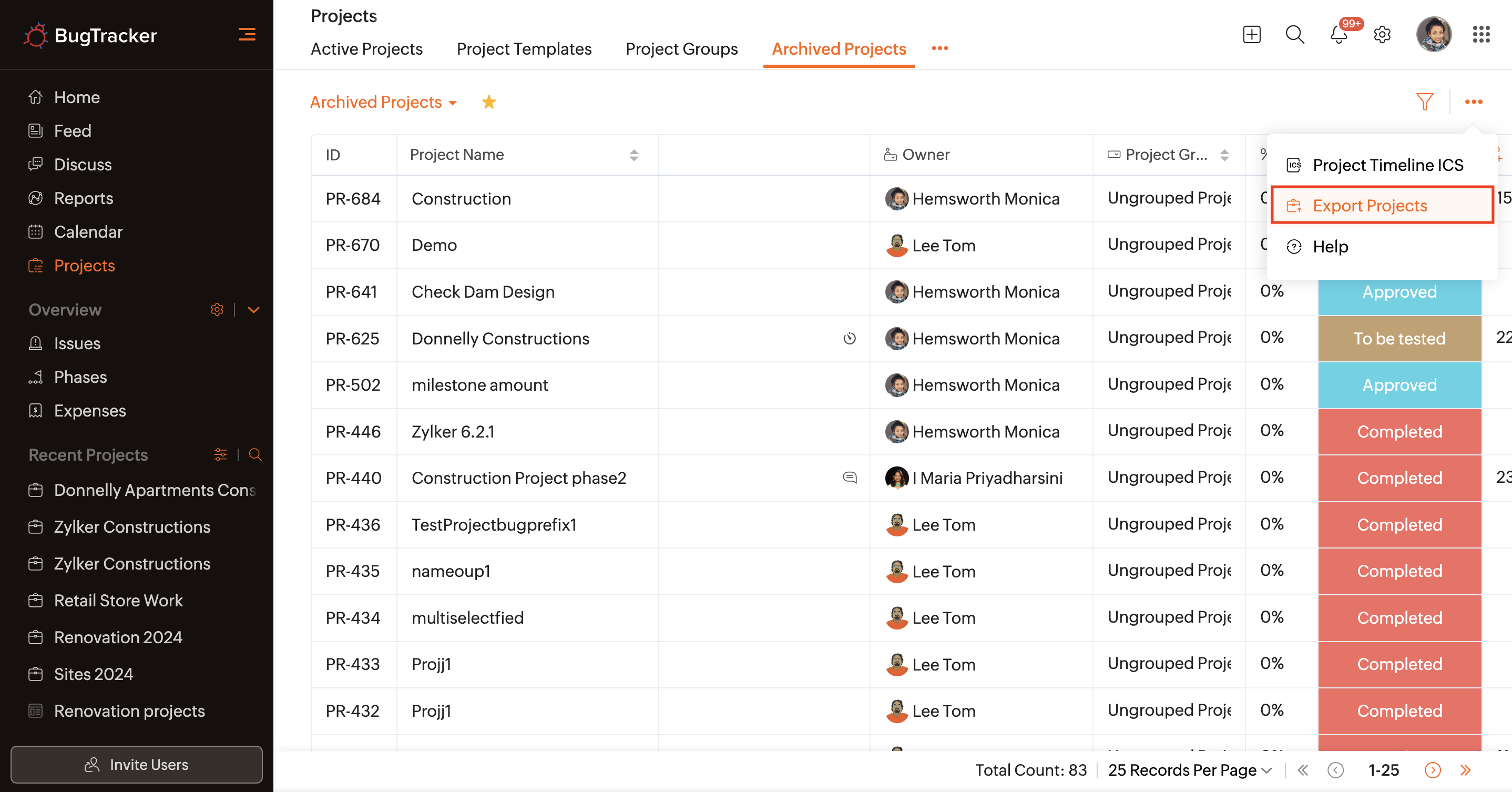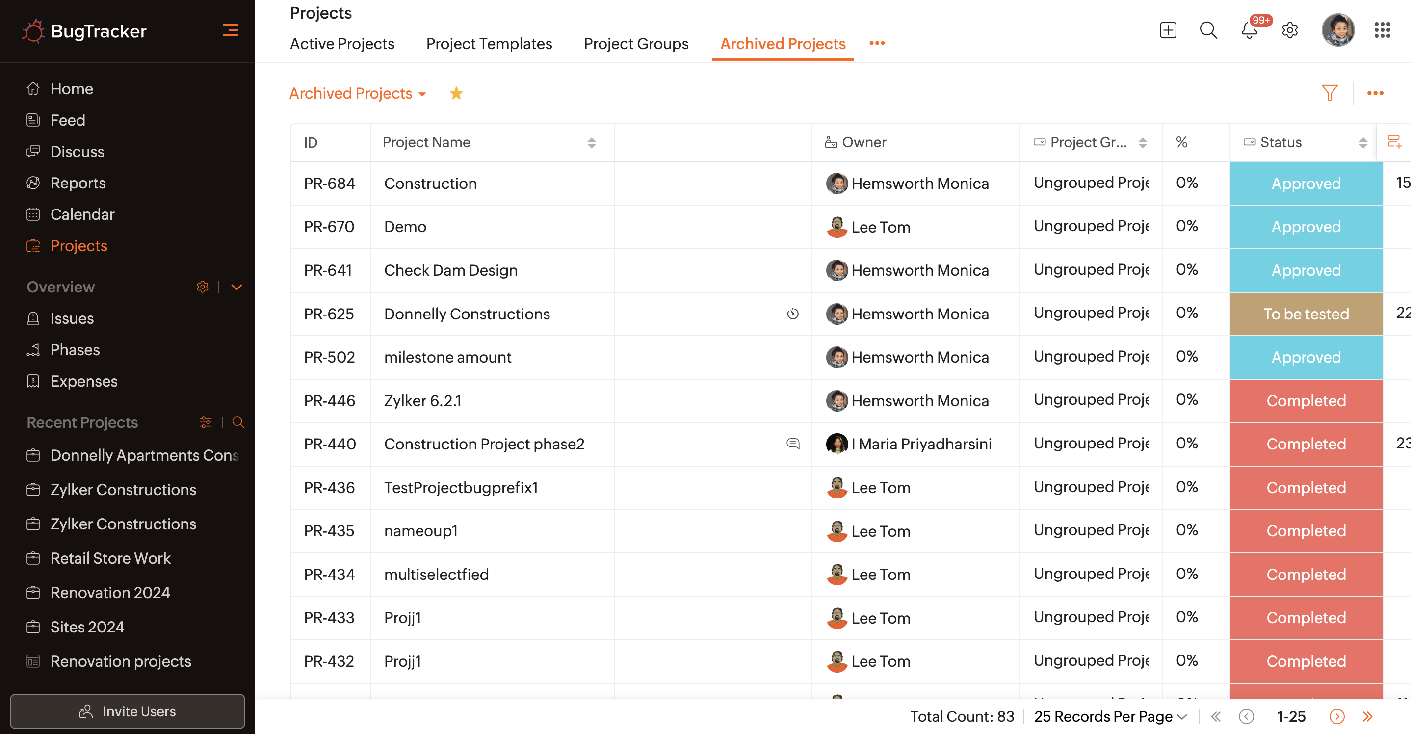 This section lists all your projects in the portal. By default, you will see all the active Projects.