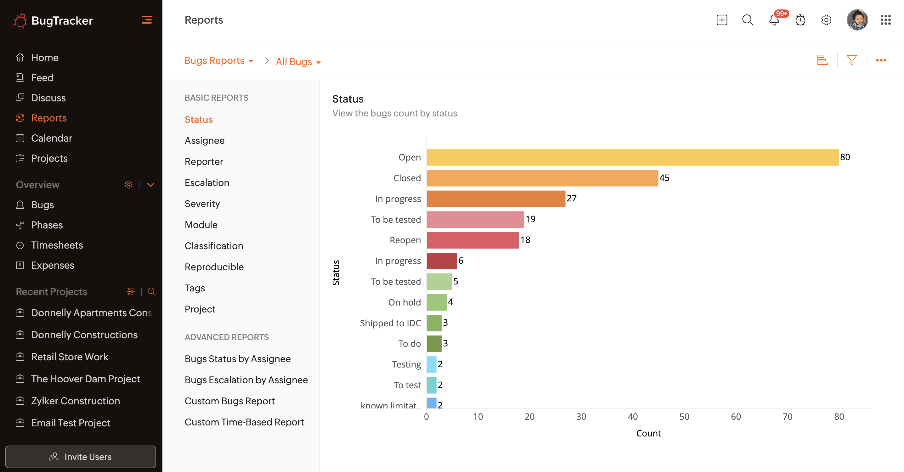 Bug Reports give deep insights on the status of the bugs. Bugs can be analyzed based on numerous parameters. Feature Availability: Premium and Enterprise plans Basic Reports Basic reports show the status of bugs using the most common parameters. ...