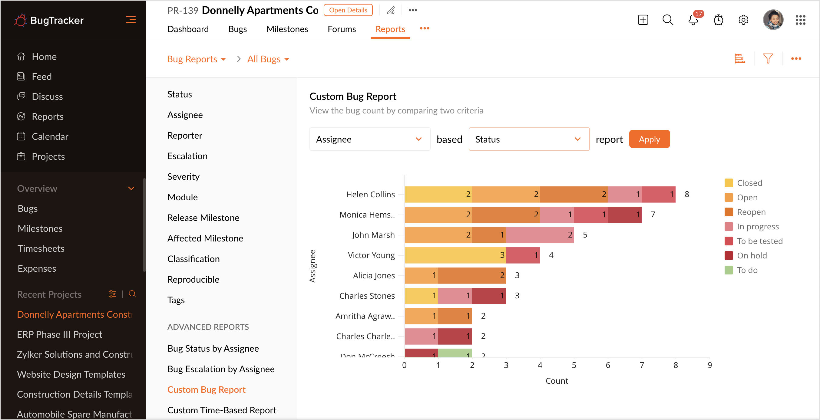 The report gives a graphical representation of the number of bugs assigned to a user in different stages. Click on the bar to see the bugs for that particular stage.